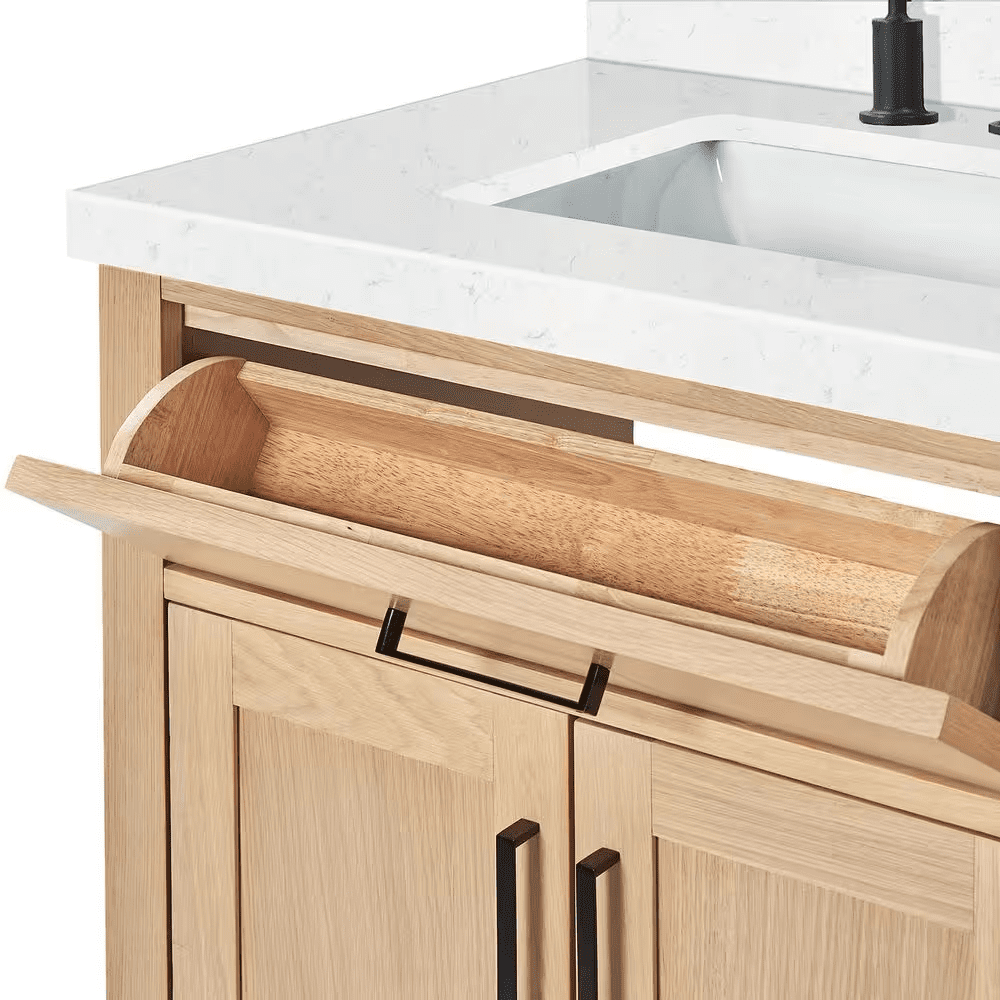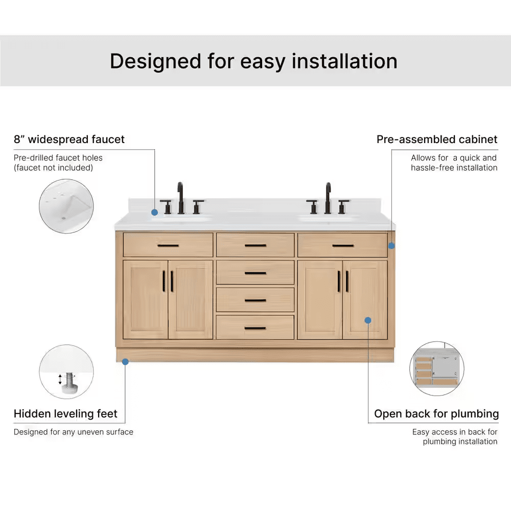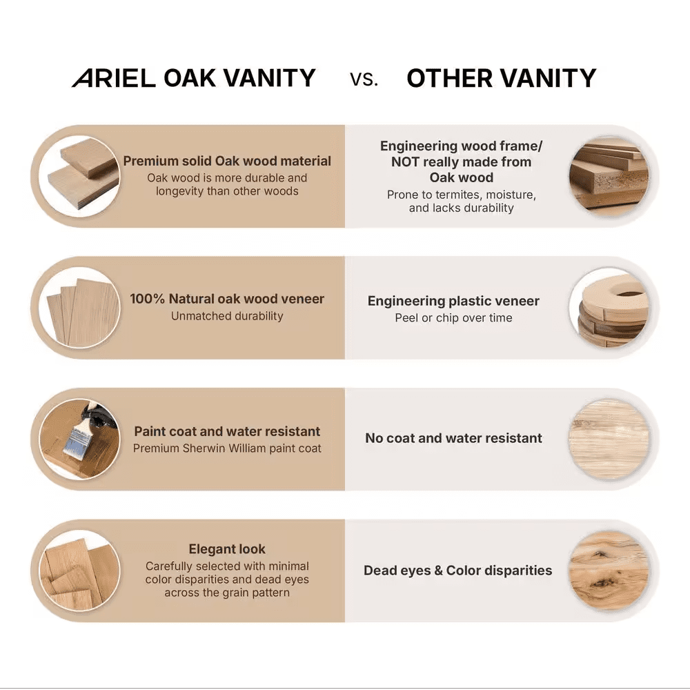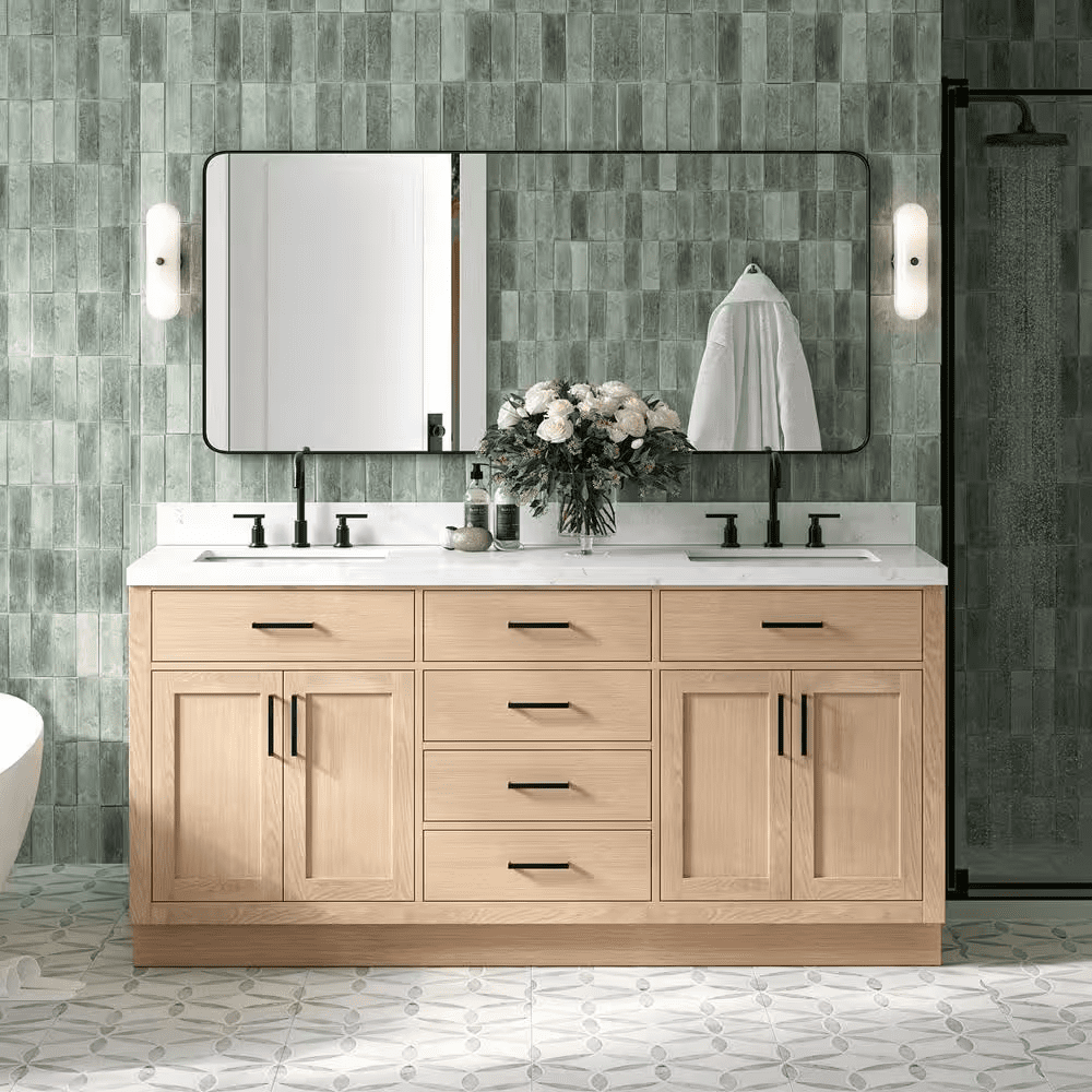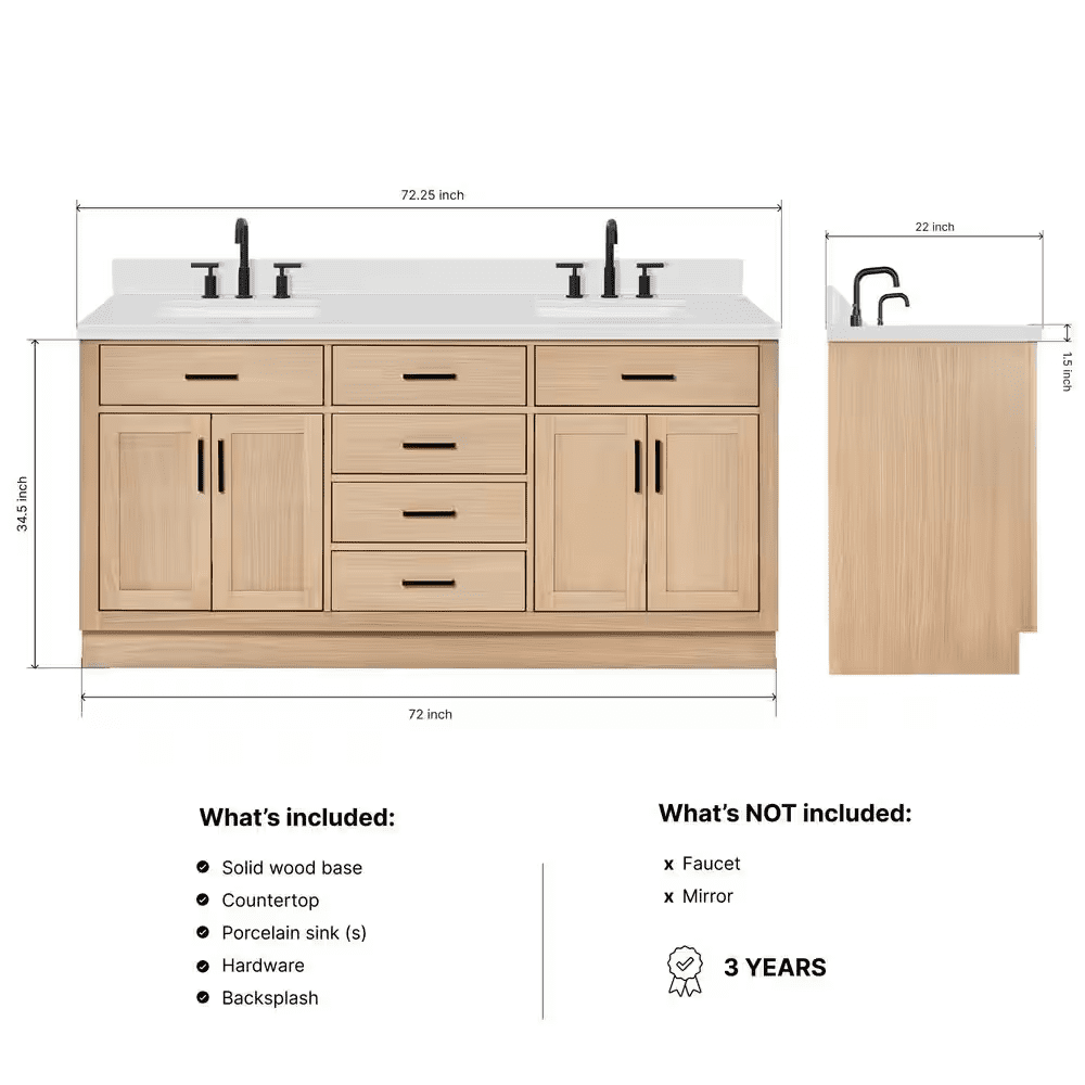 The ARIEL Hepburn Collection blends modern design with everyday function, making it a popular choice for today’s bathroom remodels. Upgrade your bathroom with the ARIEL Hepburn 72 inch bathroom vanity in oak, a perfect blend of style and function. This double bathroom vanity with sink is handcrafted from high-quality solid wood and plywood for lasting durability and strength. The cabinet offers functional countertop space and organized storage, making it a reliable choice for keeping your bathroom clean and updated.