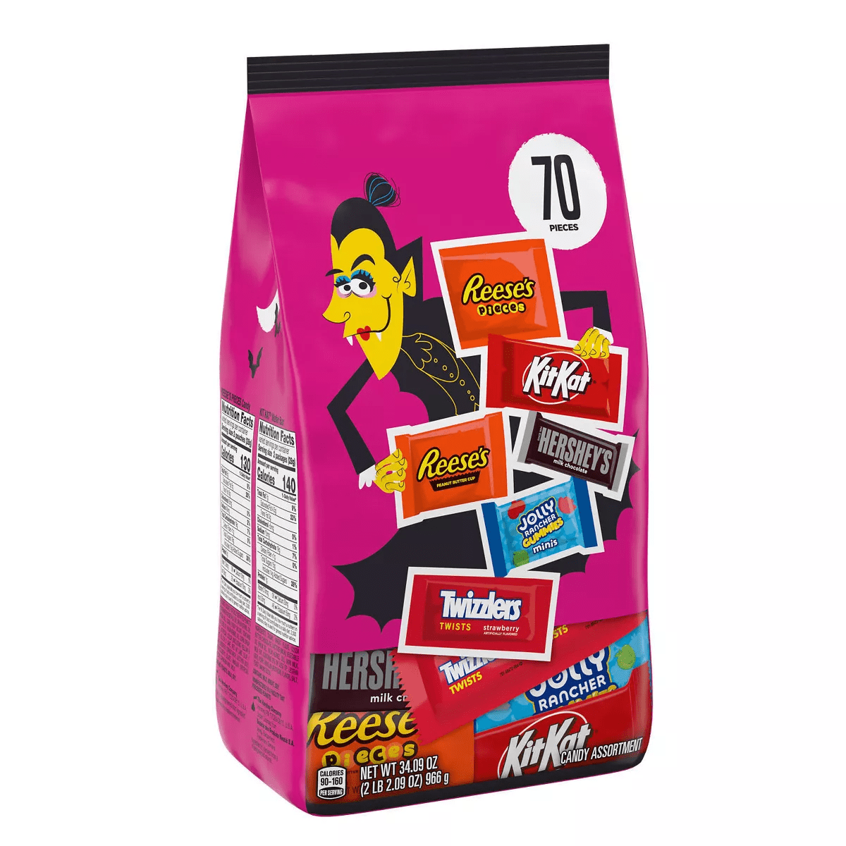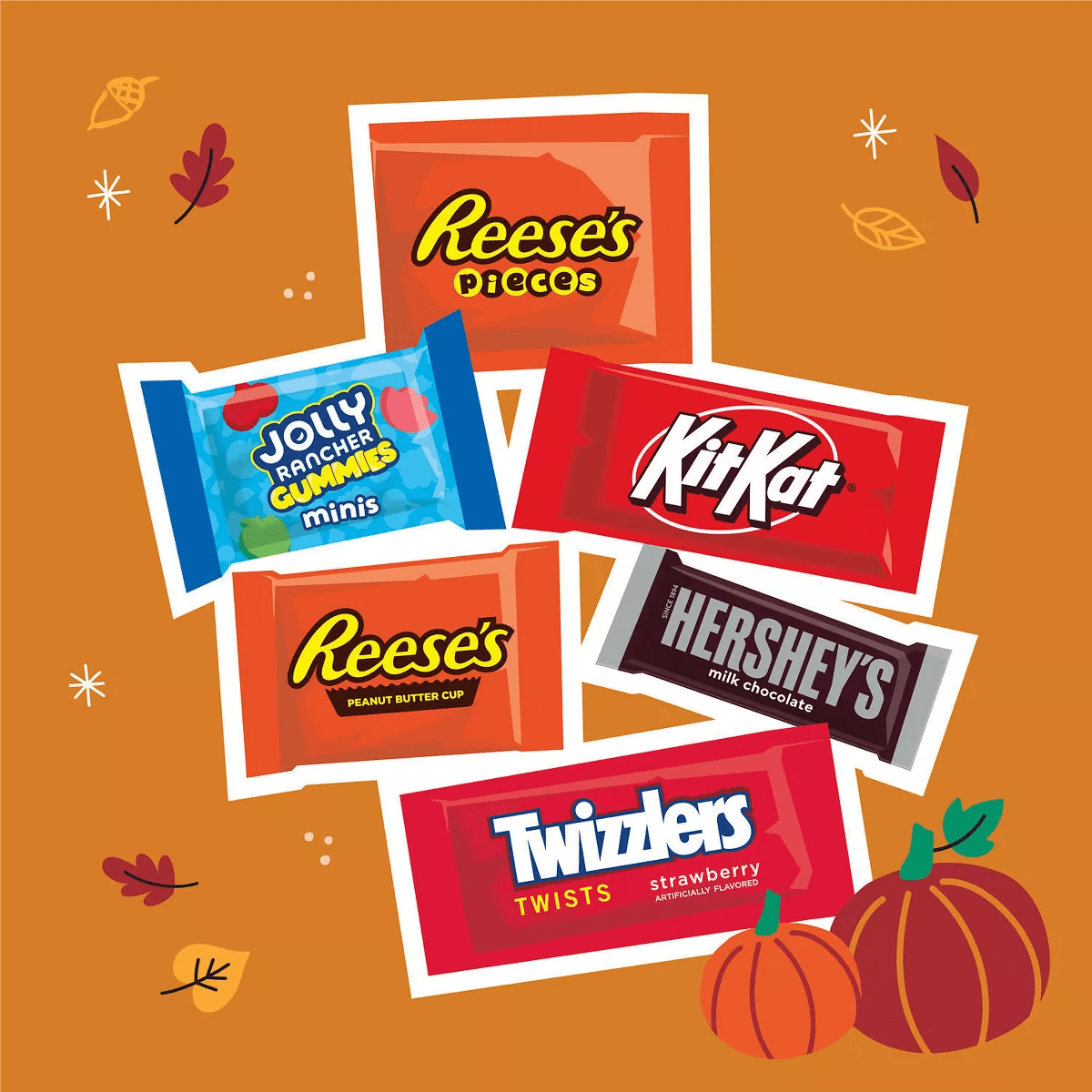 - Includes HERSHEY’S milk chocolate candy bars, TWIZZLERS Twists strawberry flavored candy, KIT KAT® milk chocolate wafer candy bars, JOLLY RANCHER gummies minis candy, REESE’S milk chocolate peanut butter cups candy and REESE’S PIECES peanut butter candy
