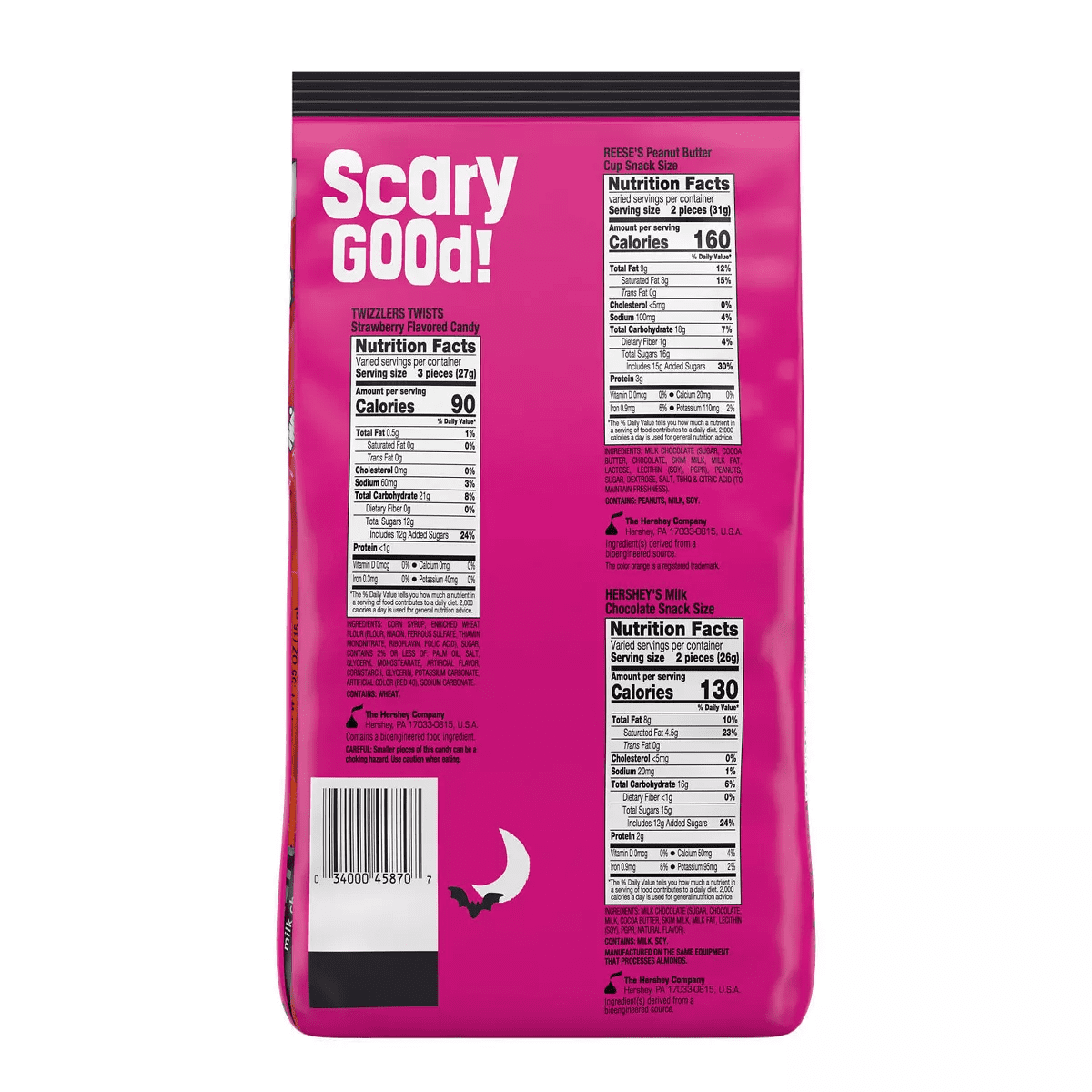Enjoy a delicious chocolatey or fruity treat anywhere and anytime with Hershey assorted flavored candy in a variety bag. Offering six crowd pleasing favorites, this Halloween candy assortment is perfect for sharing with family, friends and Halloween night visitors. Take this variety candy bag into the office break room, pour some individually wrapped candies into your jar at home or take a bag to your next costume party to make an impression. This variety bag of trick or treat candy includes HERSHEY’S milk chocolate candy bars, TWIZZLERS Twists strawberry flavored candy, KIT KAT® milk chocolate wafer candy bars, JOLLY RANCHER gummies minis candy, REESE’S milk chocolate peanut butter cups candy and REESE’S PIECES peanut butter candy. Hershey candy is also great for parties, holidays, desserts, picnics, lunch boxes, tailgate events and more. You really can’t go wrong when you have milk chocolate, peanut butter, wafer bars and fruit flavored sweets on hand. Feeling creative in the kitchen? Break up these candy bars and include them on top of your favorite cookies, cupcakes and other sweet treats. Add them to your Halloween festivities, too. Pass these candies out to trick or treaters, or award the entire bag to the winner of your Halloween party costume contest. Just don’t forget to save a few pieces for yourself!