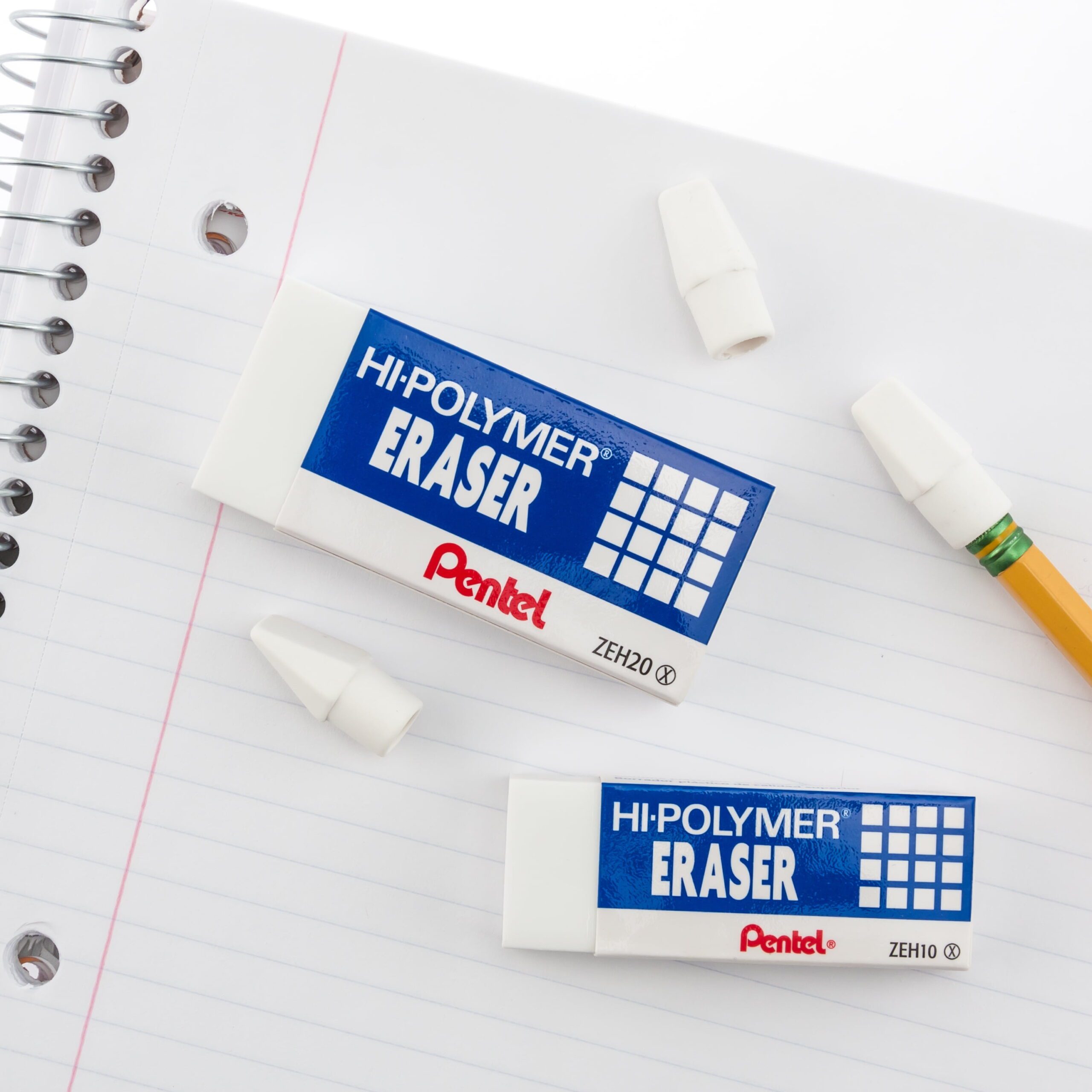 Pentel® Hi-Polymer® erasers remove lead easily and cleanly with little pressure. No smudges, no paper tears, no ghosting. High quality, latex-free erasers do not crack or harden with age. Block erasers include protective sleeve. Small block for corners, large block erases large areas.
