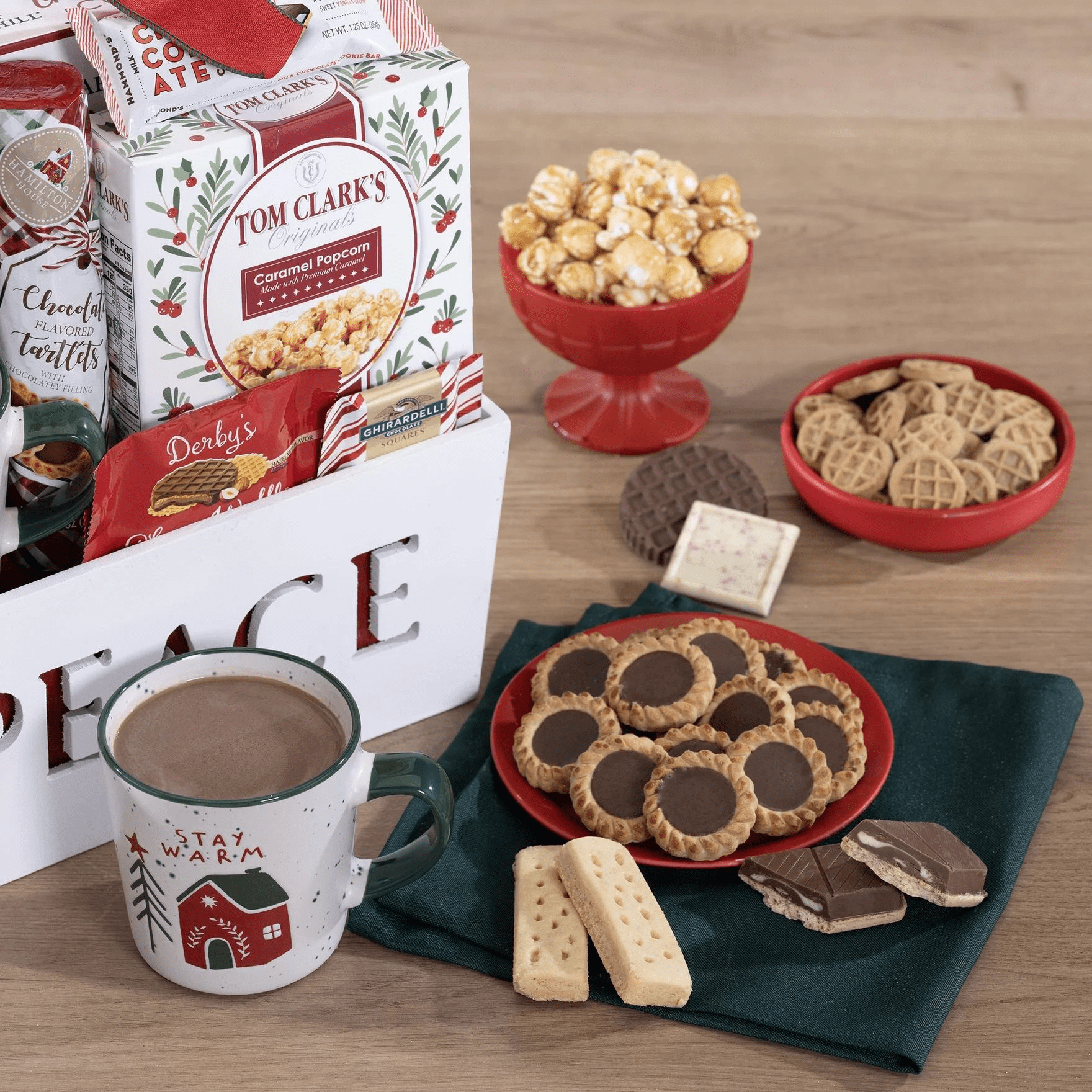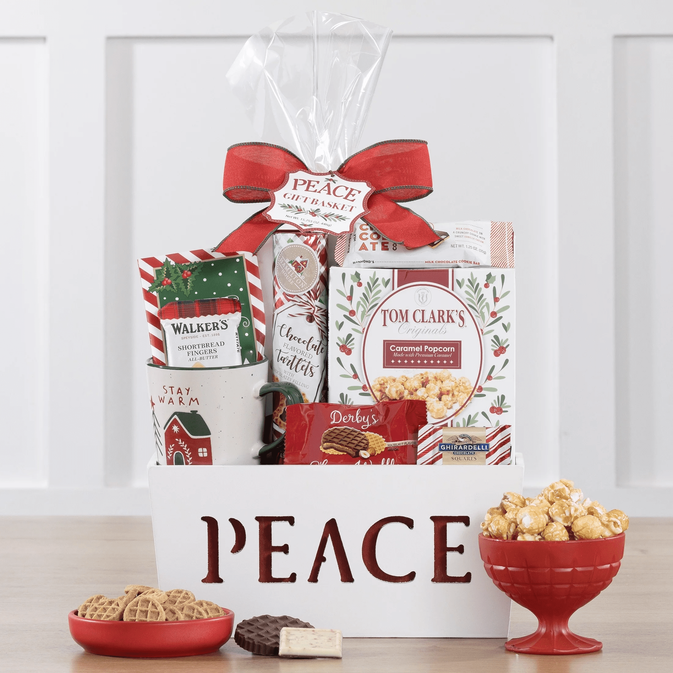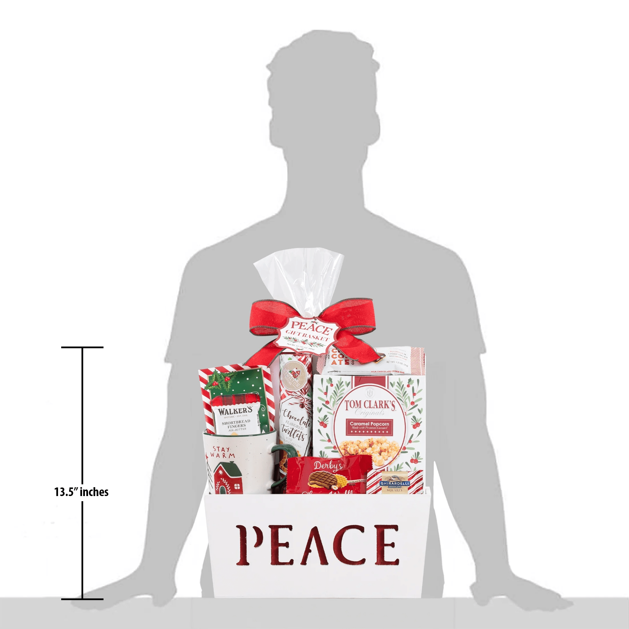 Send a heartfelt message of warmth, comfort, and peace this holiday season with our thoughtfully curated Peace Holiday Gift Basket. More than just a collection of sweet and savory seasonal treats, this gift is a symbol of serenity and goodwill. Elegantly presented in a charming white wooden container, the word “PEACE” is boldly cut out across the front making it not only a festive delight, but a lasting keepsake they’ll treasure for years to come. Carefully arranged and beautifully wrapped, this meaningful gift is ready to place under the tree or send directly to their doorstep, spreading joy, calm, and connection when it matters most. Whether you’re celebrating with family, thanking a colleague, or surprising a friend from afar, this basket delivers the true spirit of the season – one peaceful moment at a time.