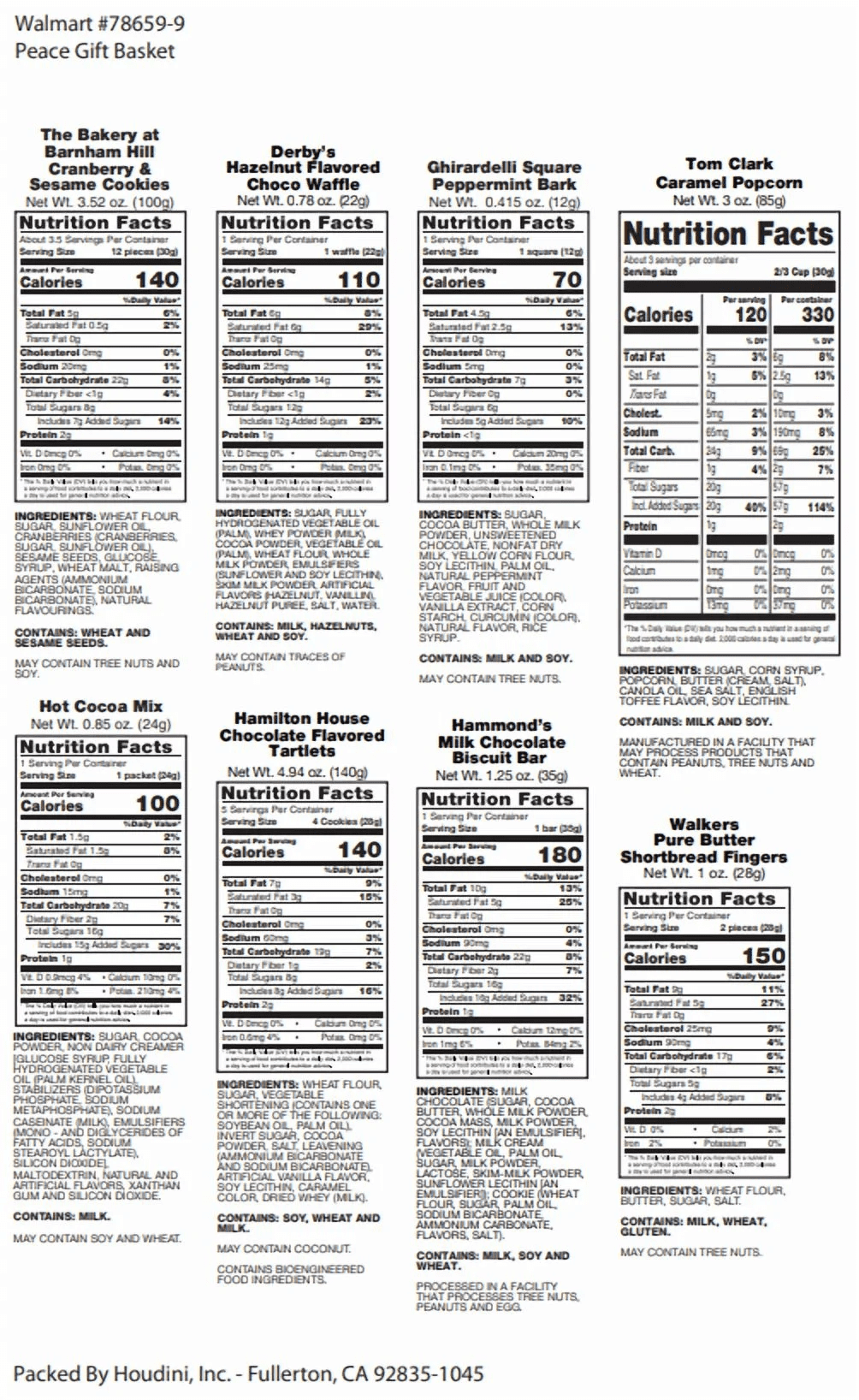 The Bakery at Barnham Hill Cranberry & Sesame Cookies: WHEAT FLOUR, SUGAR, SUNFLOWER OIL, CRANBERRIES (CRANBERRIES, SUGAR, SUNFLOWER OIL), SESAME SEEDS, GLUCOSE, SYRUP, WHEAT MALT, RAISING AGENTS (AMMONIUM BICARBONATE, SODIUM BICARBONATE), NATURAL FLAVOURINGS. CONTAINS: WHEAT AND SESAME SEEDS. MAY CONTAIN TREE NUTS AND SOY. Derby’s Hazelnut Flavored Choco Waffle: SUGAR, FULLY HYDROGENATED VEGETABLE OIL (PALM), WHEY POWDER (MILK), COCOA POWDER, VEGETABLE OIL (PALM), WHEAT FLOUR, WHOLE MILK POWDER, EMULSIFIERS (SUNFLOWER AND SOY LECITHIN), SKIM MILK POWDER, ARTIFICIAL FLAVORS (HAZELNUT, VANILLIN), HAZELNUT PUREE, SALT, WATER. CONTAINS: MILK, HAZELNUTS, WHEAT AND SOY. MAY CONTAIN TRACES OF PEANUTS. Ghirardelli Square Peppermint Bark: SUGAR, COCOA BUTTER, WHOLE MILK POWDER, UNSWEETENED CHOCOLATE, NONFAT DRY MILK, YELLOW CORN FLOUR, SOY LECITHIN, PALM OIL, NATURAL PEPPERMINT FLAVOR, FRUIT AND VEGETABLE JUICE (COLOR), VANILLA EXTRACT, CORN STARCH, CURCUMIN (COLOR), NATURAL FLAVOR, RICE SYRUP. CONTAINS: MILK AND SOY. MAY CONTAIN TREE NUTS. Tom Clark Caramel Popcorn: SUGAR, CORN SYRUP, POPCORN, BUTTER (CREAM, SALT), CANOLA OIL, SEA SALT, ENGLISH TOFFEE FLAVOR, SOY LECITHIN. CONTAINS: MILK AND SOY. MANUFACTURED IN A FACILITY THAT MAY PROCESS PRODUCTS THAT CONTAIN PEANUTS, TREE NUTS AND WHEAT. Hot Cocoa Mix: SUGAR, COCOA POWDER, NON DAIRY CREAMER [GLUCOSE SYRUP, FULLY HYDROGENATED VEGETABLE OIL (PALM KERNEL OIL), STABILIZERS (DIPOTASSIUM PHOSPHATE, SODIUM METAPHOSPHATE), SODIUM CASEINATE (MILK), EMULSIFIERS (MONO – AND DIGLYCERIDES OF FATTY ACIDS, SODIUM STEAROYL LACTYLATE), SILICON DIOXIDE], MALTODEXTRIN, NATURAL AND ARTIFICIAL FLAVORS, XANTHAN GUM AND SILICON DIOXIDE. CONTAINS: MILK. MAY CONTAIN SOY AND WHEAT. Hamilton House Chocolate Flavored Tartlets: WHEAT FLOUR, SUGAR, VEGETABLE SHORTENING (CONTAINS ONE OR MORE OF THE FOLLOWING: SOYBEAN OIL, PALM OIL), INVERT SUGAR, COCOA POWDER, SALT, LEAVENING (AMMONIUM BICARBONATE AND SODIUM BICARBONATE), ARTIFICIAL VANILLA FLAVOR, SOY LECITHIN, CARAMEL COLOR, DRIED WHEY (MILK). CONTAINS: SOY, WHEAT AND MILK. MAY CONTAIN COCONUT. CONTAINS BIOENGINEERED FOOD INGREDIENTS. Hammond’s Milk Chocolate Biscuit Bar: MILK CHOCOLATE (SUGAR, COCOA BUTTER, WHOLE MILK POWDER, COCOA MASS, MILK POWDER, SOY LECITHIN [AN EMULSIFIER], FLAVORS); MILK CREAM (VEGETABLE OIL, PALM OIL, SUGAR, MILK POWDER, LACTOSE, SKIM-MILK POWDER, SUNFLOWER LECITHIN [AN EMULSIFIER]); COOKIE (WHEAT FLOUR, SUGAR, PALM OIL, SODIUM BICARBONATE, AMMONIUM CARBONATE, FLAVORS, SALT). CONTAINS: MILK, SOY AND WHEAT. PROCESSED IN A FACILITY THAT PROCESSES TREE NUTS, PEANUTS AND EGG. Walkers Pure Butter Shortbread Fingers: WHEAT FLOUR, BUTTER, SUGAR, SALT. CONTAINS: MILK, WHEAT, GLUTEN. MAY CONTAIN TREE NUTS./div>