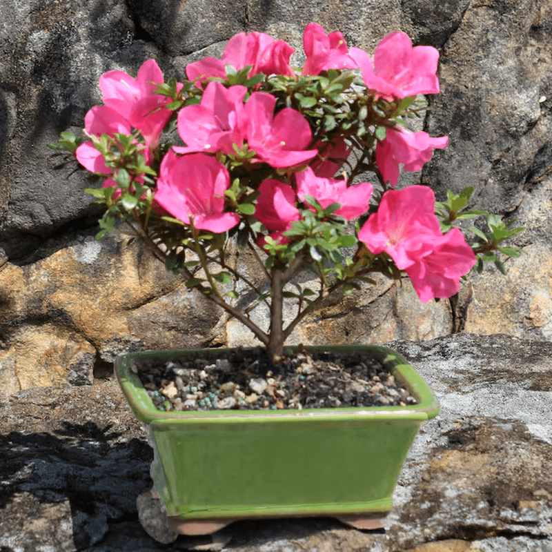 The Satsuki Azalea is a popular choice among Bonsai. This particular plant is very hardy and produces magnificent flowers ranging up to seven inches in diameter. Of all shrubs with flowers, the Azalea is by far the most dramatic with brilliant blooms of radiant colors blooming in late spring. While there are many species of Azalea, the Satsuki, or Rhododendron indicum is easily one of the most popular, featuring an excellent low, twiggy habit with lovely funnel shaped unscented flowers in whites, pinks, reds and purples. The Satsuki is identified by two blossoms on the end of the terminal; they also have slightly hairy leaves budding out freely from even fairly old wood. Because the azalea is highly coveted in Japan, there have been hundreds of different varieties, in every color except yellow, bright orange, and true blue.