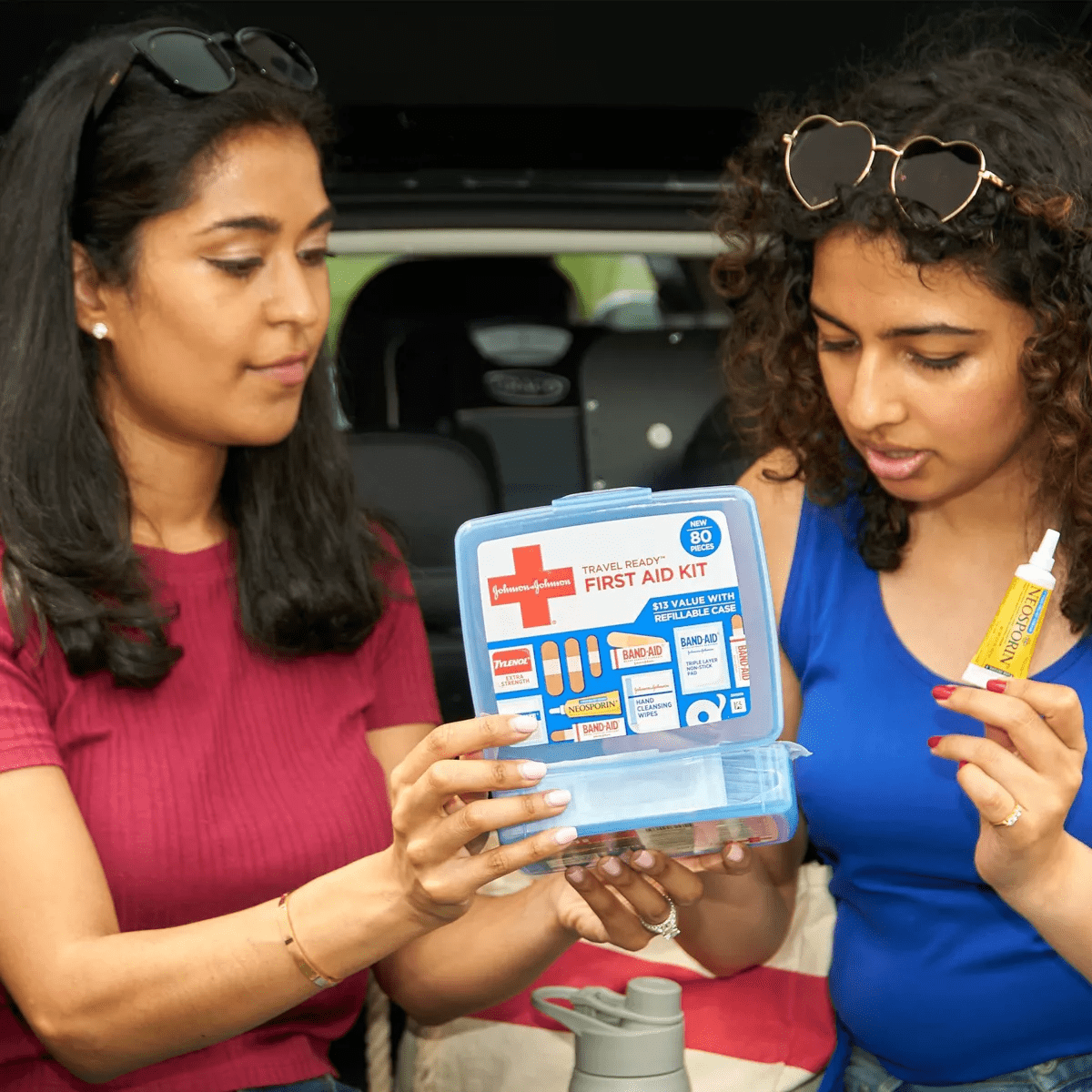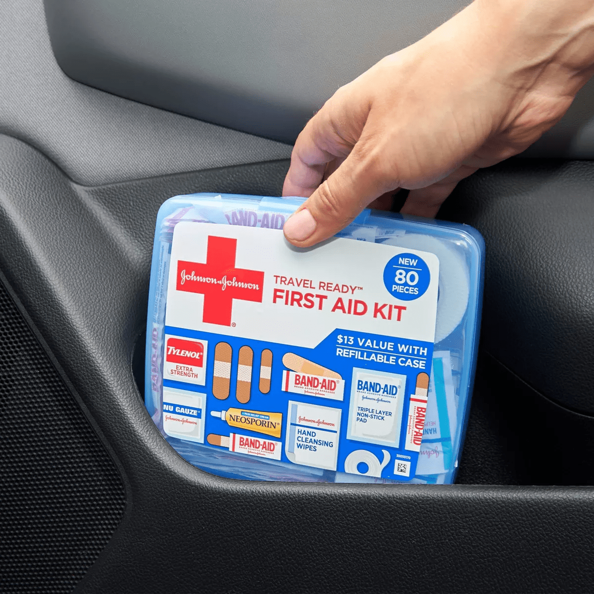 - BAND-AID Brand Travel Ready First Aid Kit with 80 wound care supplies for on-the-go first aid