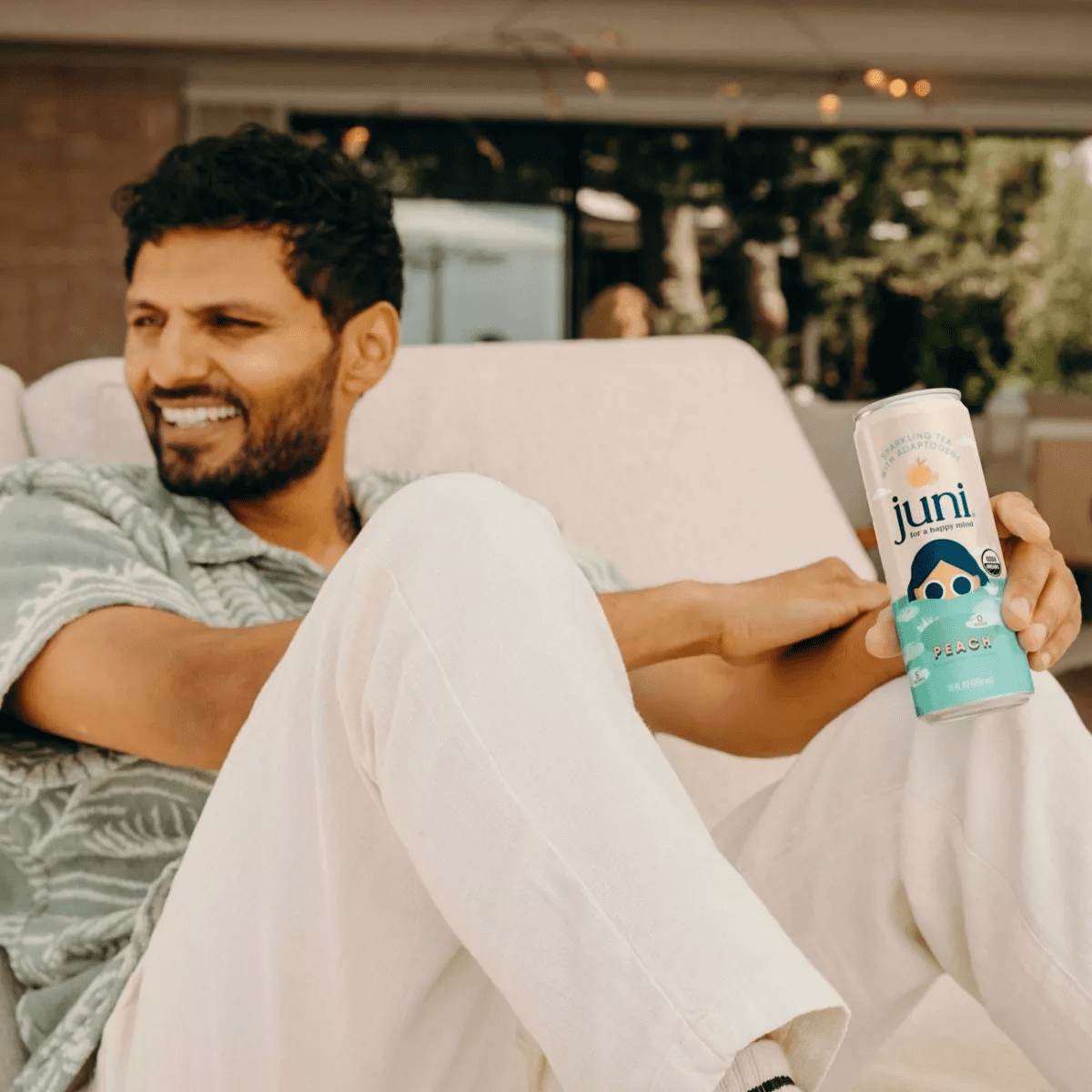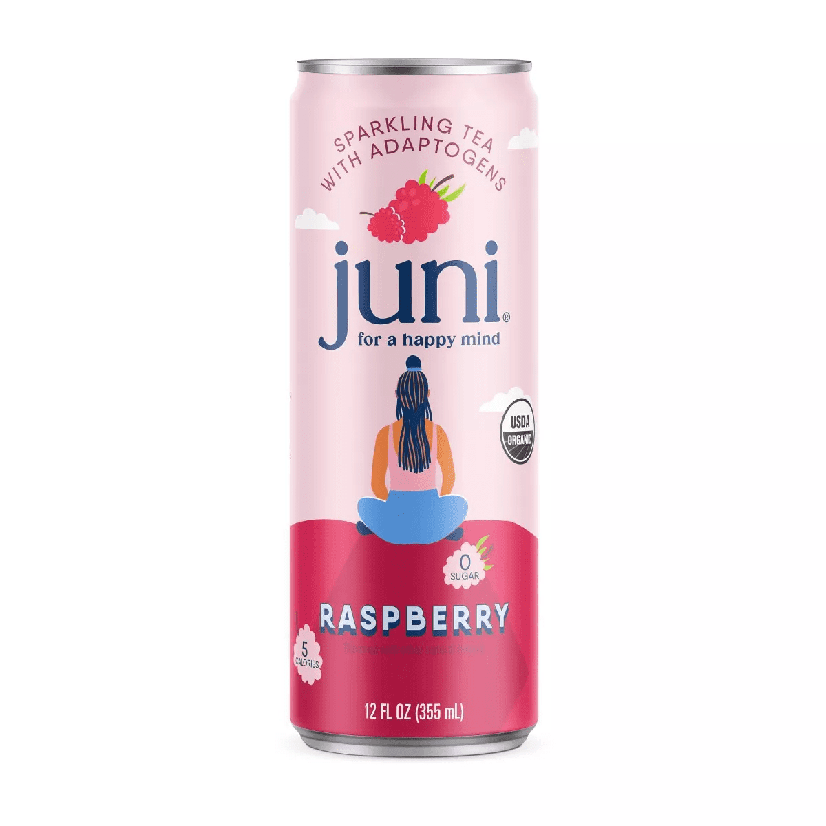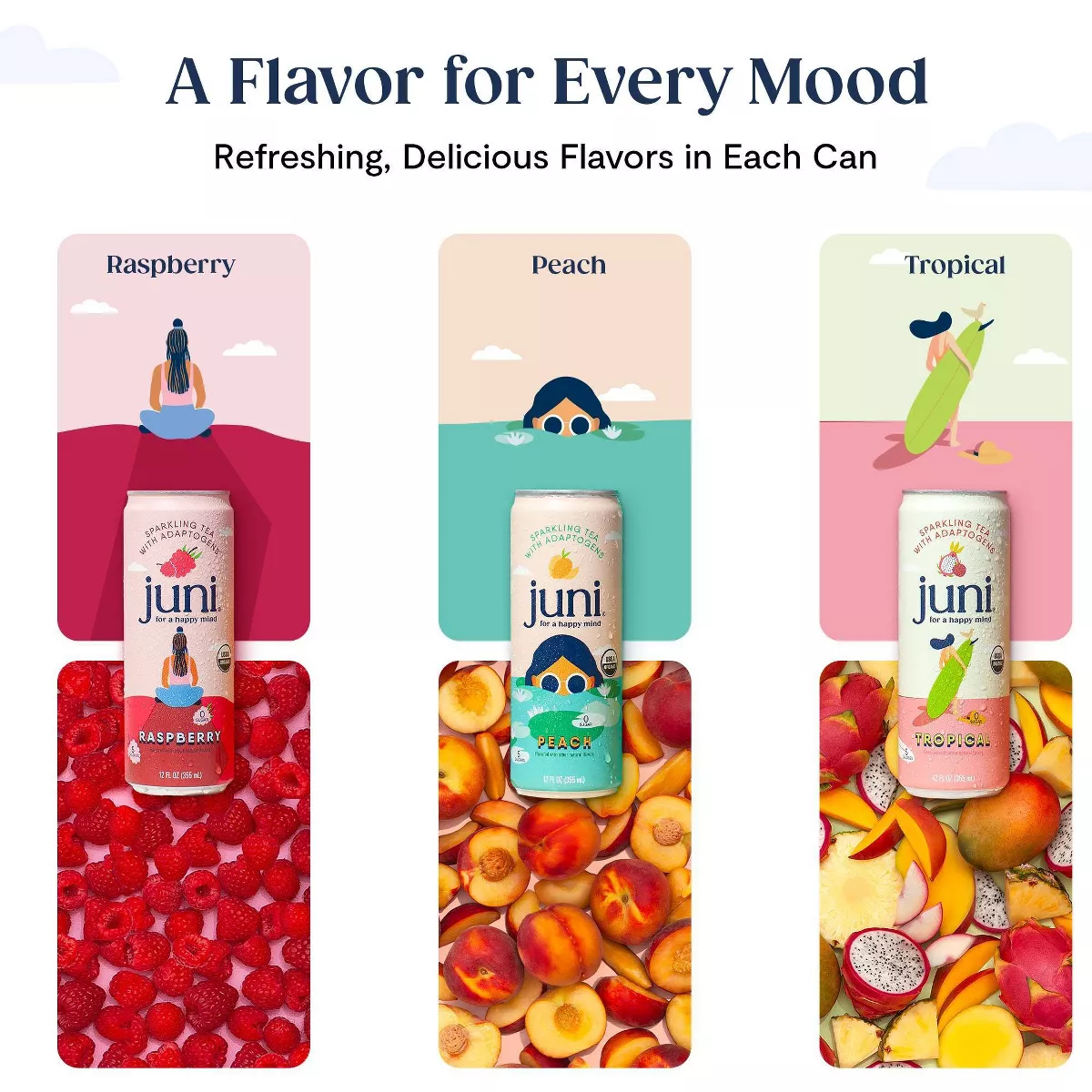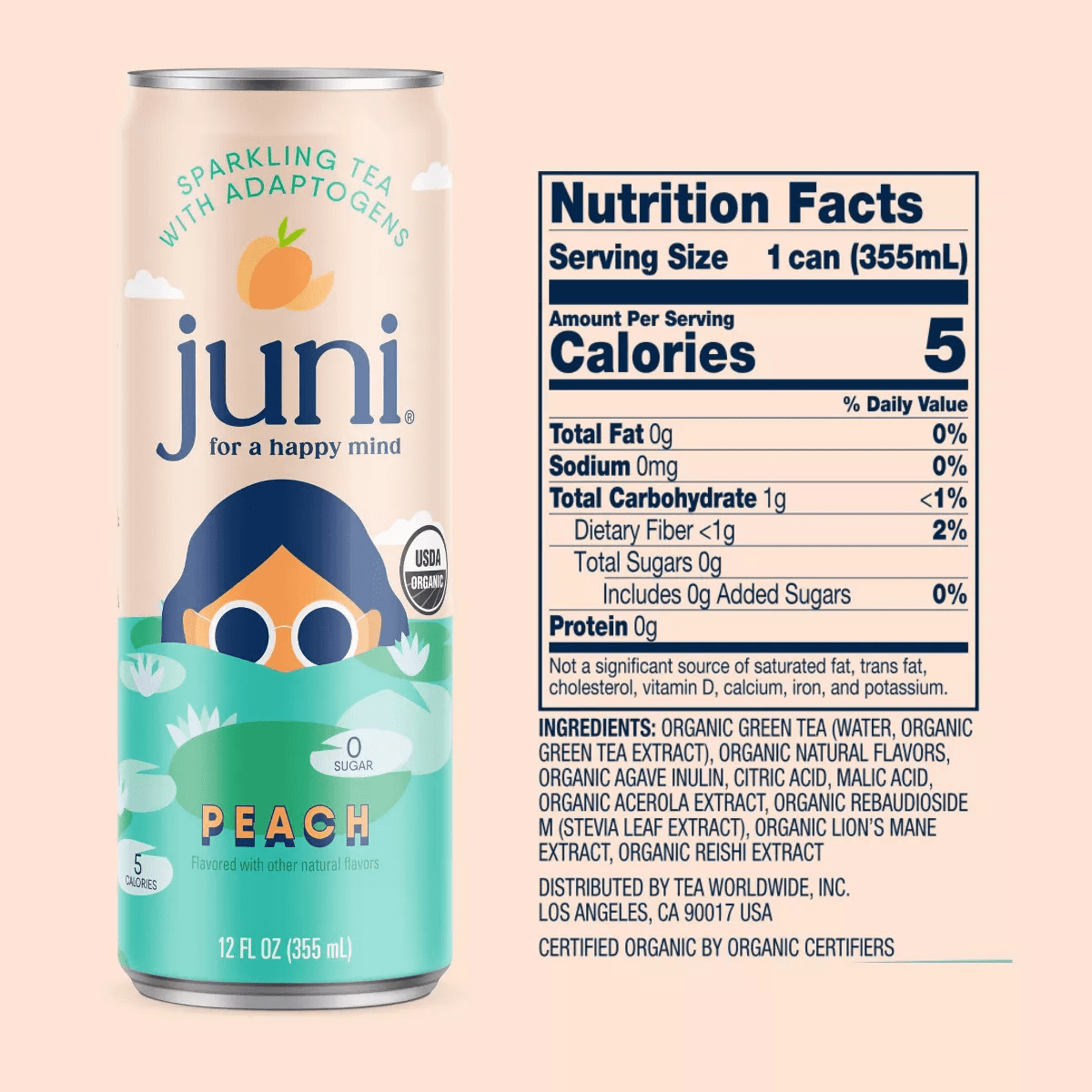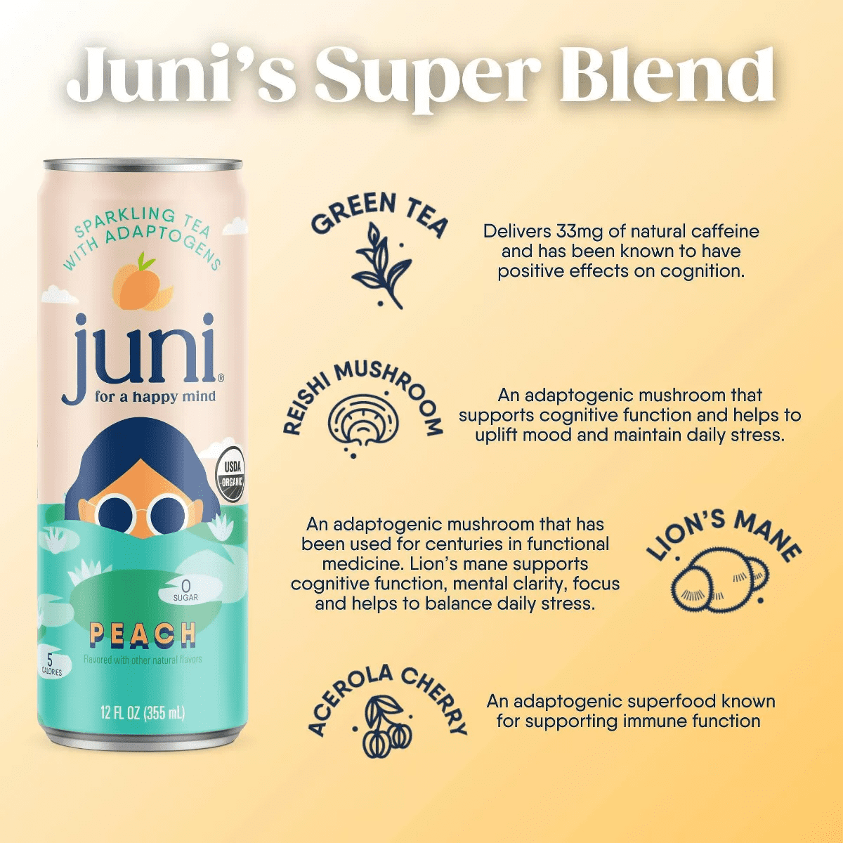 - PEACH TEA: A bright twist on the classic southern peach tea. This sparkling adaptogenic tea bursting with juicy peach puree is simply sweet and a sure-fire crowd pleaser. Includes twelve 12 ounce cans of Juni adaptogenic peach sparkling tea. Includes twelve ready to drink, 12 ounce cans