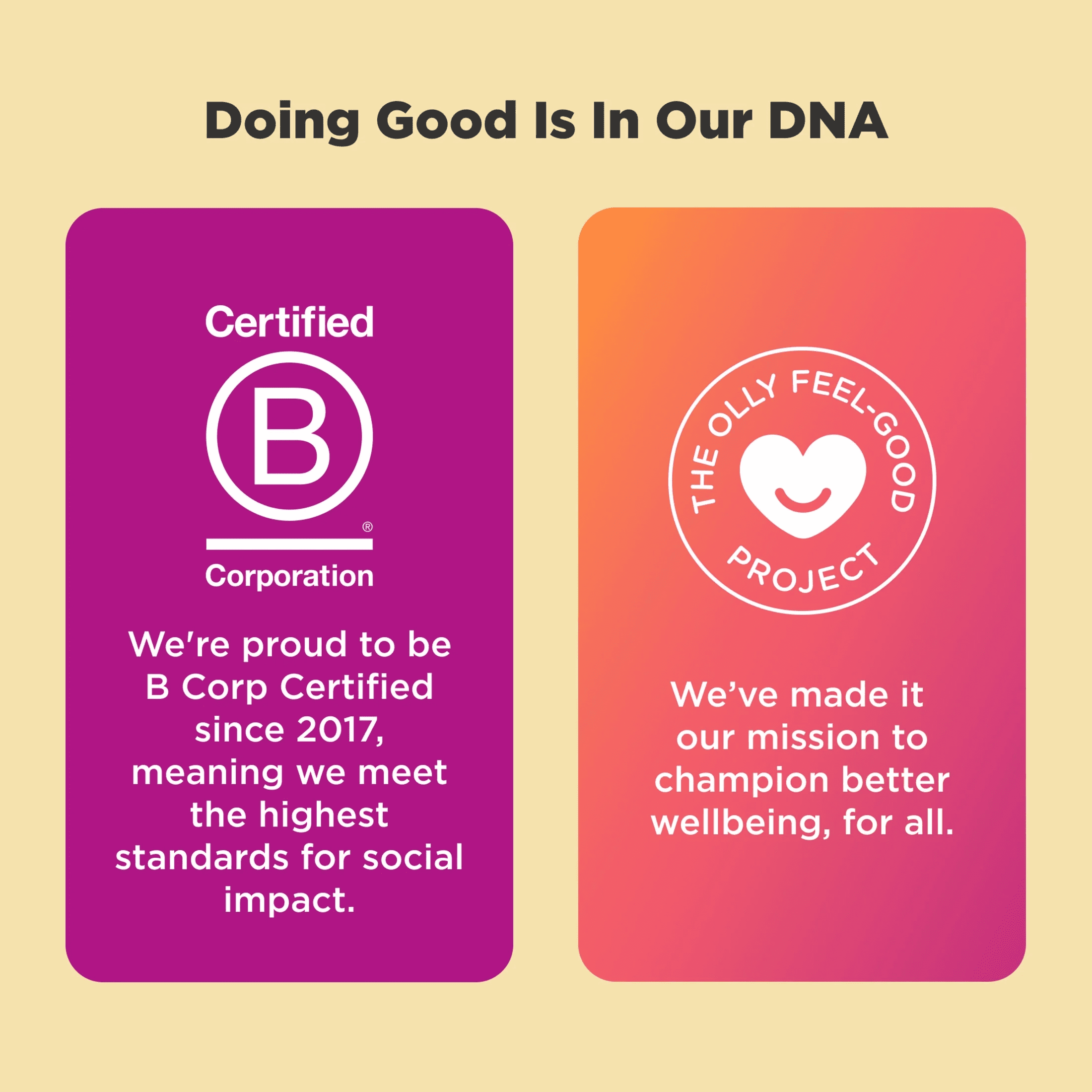 At OLLY, wellness is at the center of everything we do. That’s why we’ve made it our personal mission to make nutrition easy to understand, so you can pursue good health without compromise. We do it by crafting products that are just as effective as they are delightful and delicious. Because we know when something feels good, you’re a lot more likely to do it.