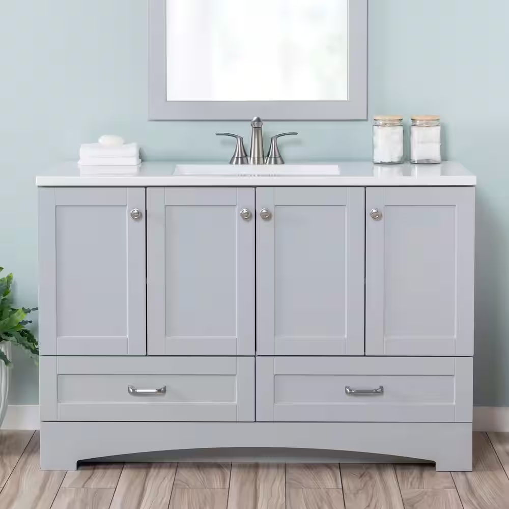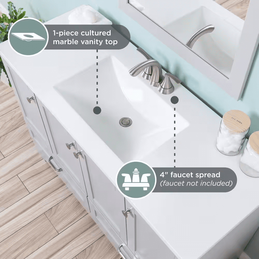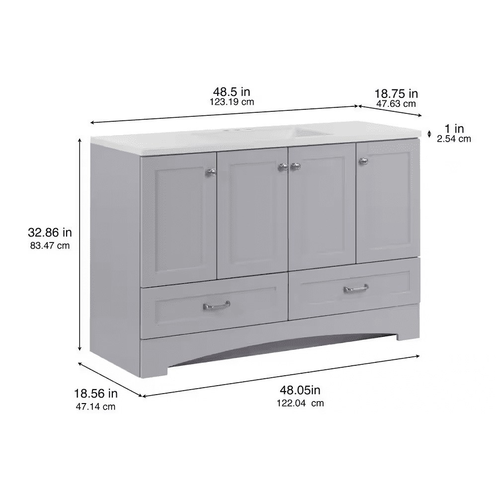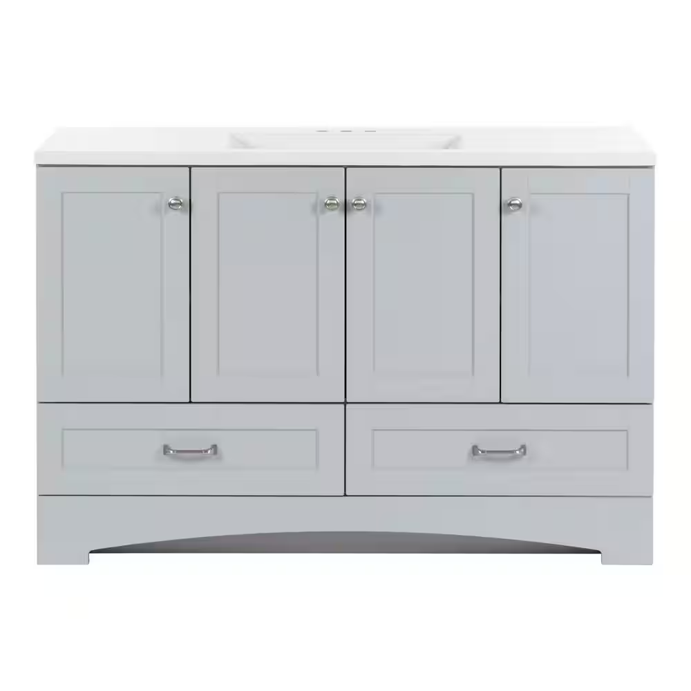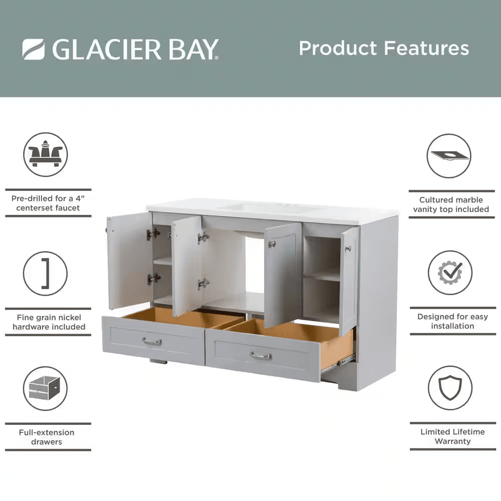 This Glacier Bay 48.5 in. Lancaster bathroom vanity in pearl gray maximizes storage in large bathrooms and powder rooms. It includes 2 single-door side cabinets with fixed interior shelves and 2 half-width bottom drawers to keep your bathroom essentials tucked away but within easy reach. And its 2-door below-the-sink cabinet provides additional storage, along with easy access to your plumbing.Constructed of furniture-grade wood with a cool-toned light gray laminate finish, this transitional vanity features a full-overlay design with a Shaker-style profile. This durably built vanity is complemented with fine grain nickel hardware and a white cultured marble vanity top. The predrilled vanity top includes an integrated rectangular sink with ample open countertop space on each side.Created for quick and easy installation around your existing plumbing, this pre-assembled single-sink vanity features an open-back design, adjustable hinges, adjustable drawer faces, and an unattached vanity top.
