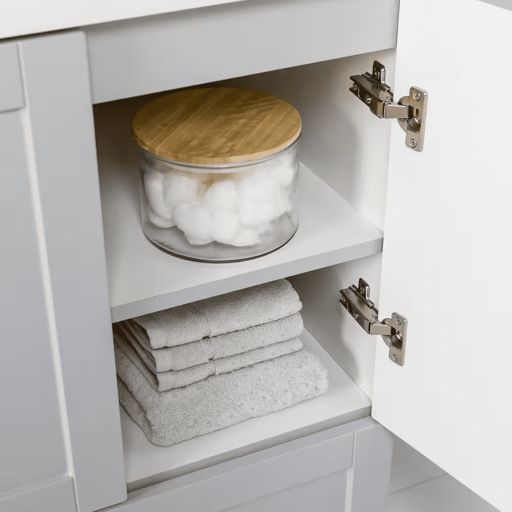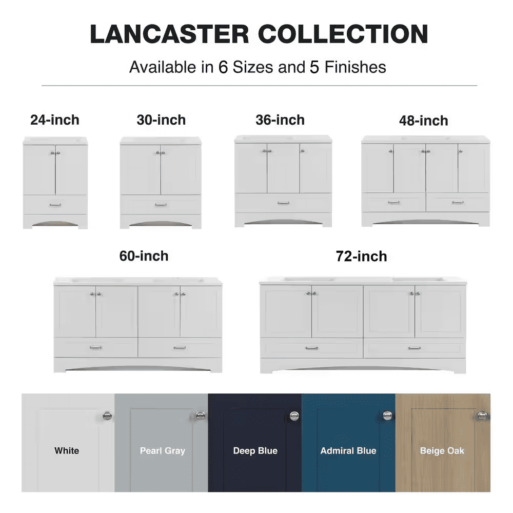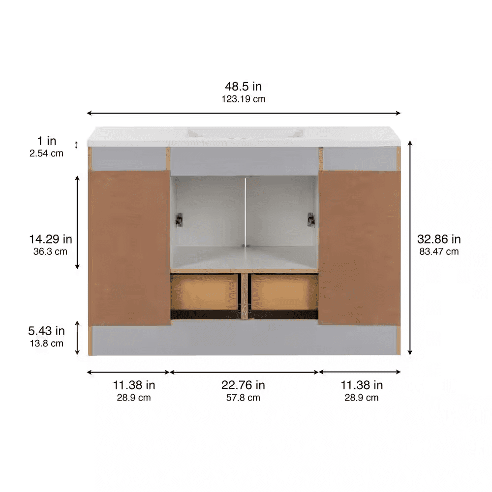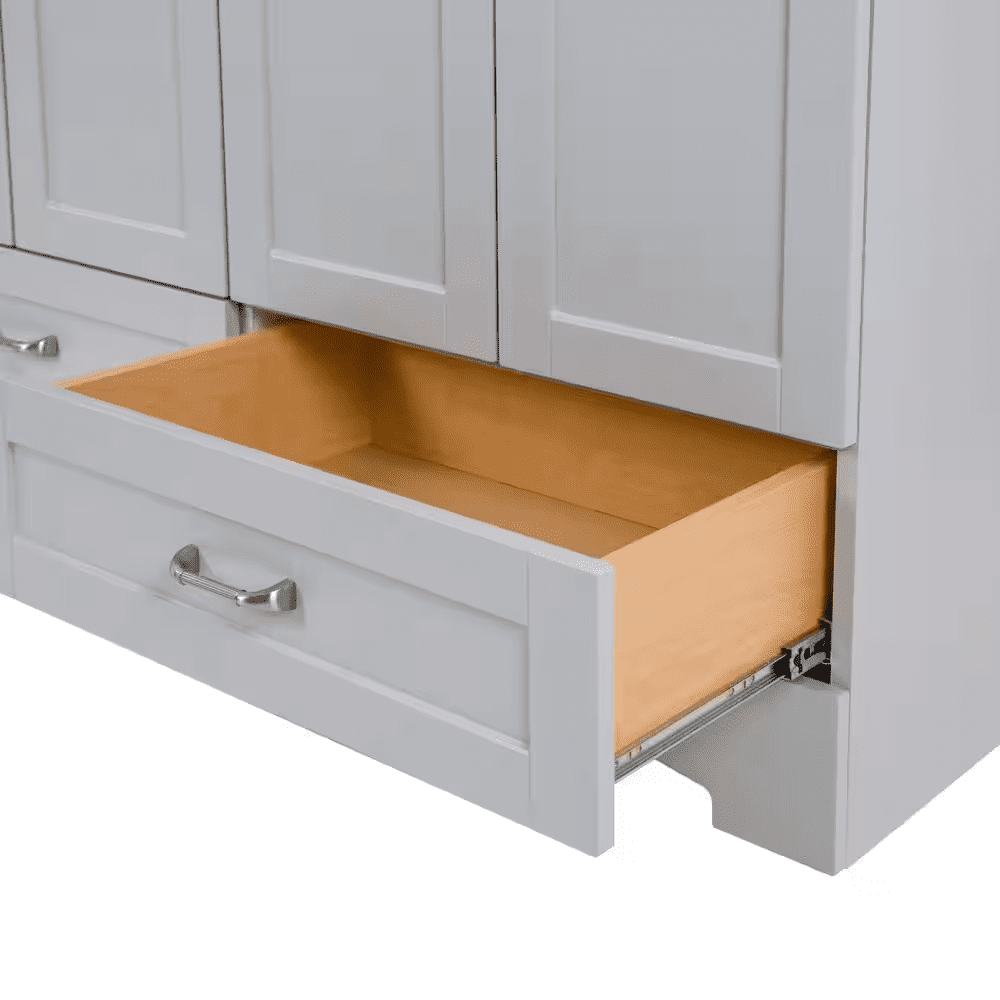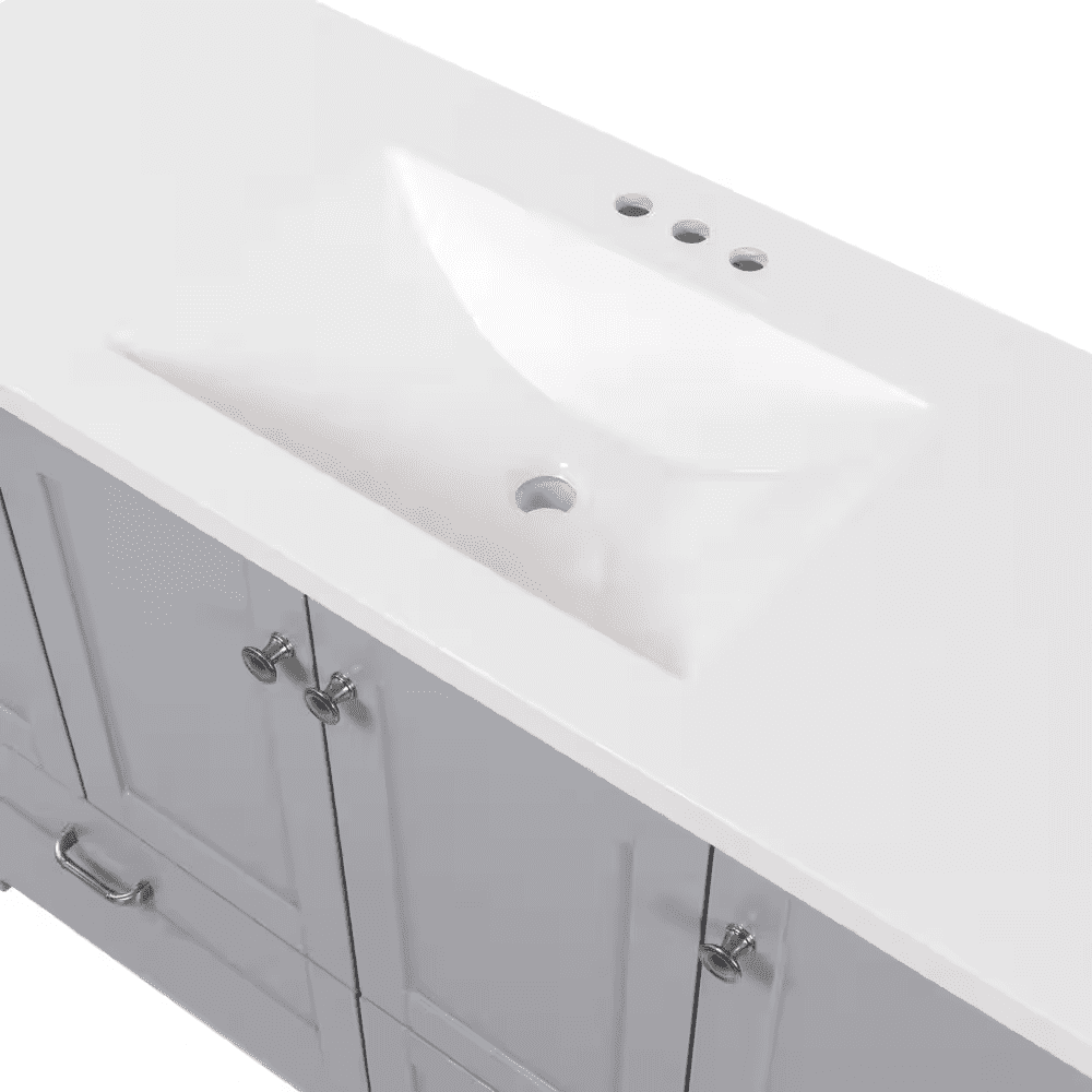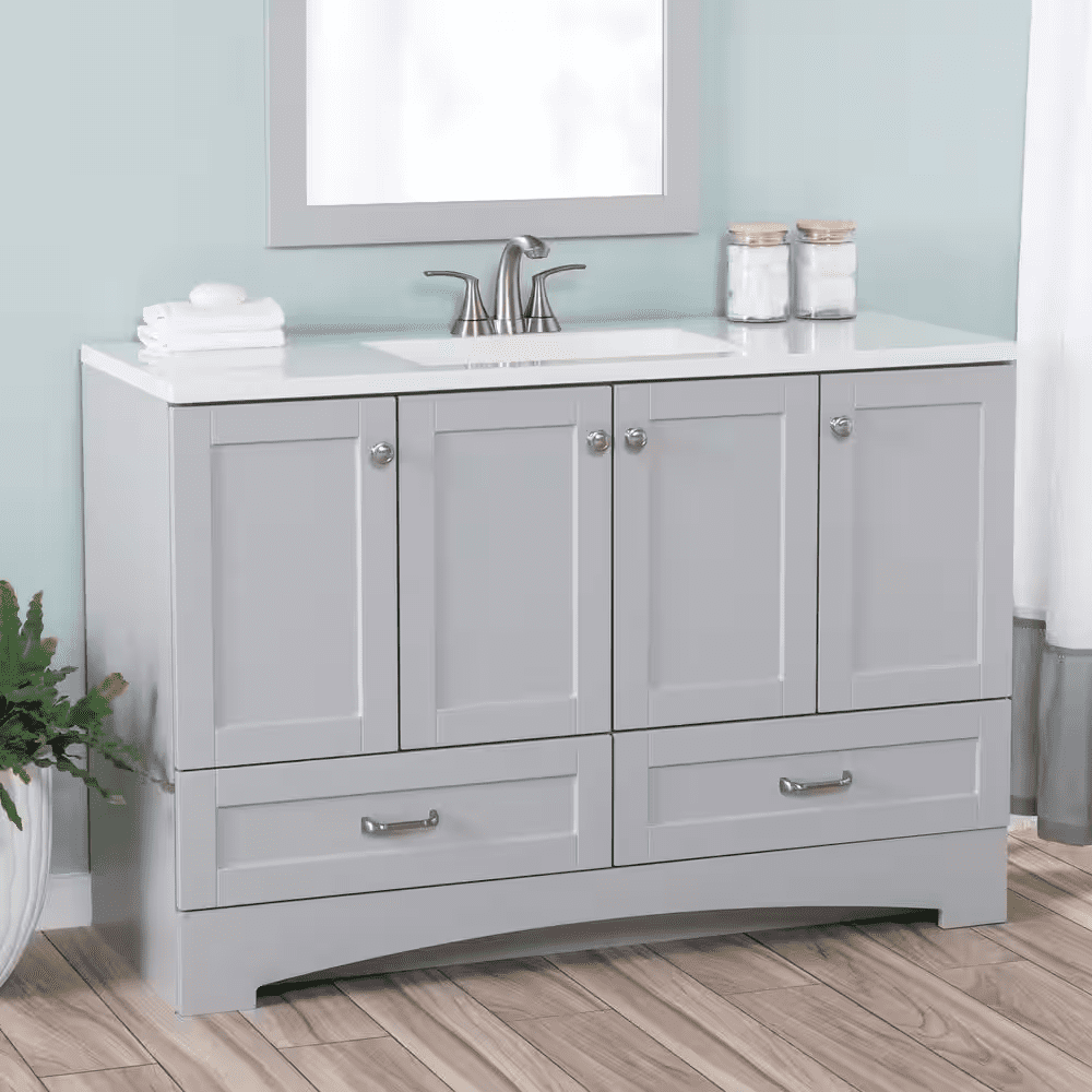 This Glacier Bay 48.5 in. Lancaster bathroom vanity in pearl gray maximizes storage in large bathrooms and powder rooms. It includes 2 single-door side cabinets with fixed interior shelves and 2 half-width bottom drawers to keep your bathroom essentials tucked away but within easy reach. And its 2-door below-the-sink cabinet provides additional storage, along with easy access to your plumbing.Constructed of furniture-grade wood with a cool-toned light gray laminate finish, this transitional vanity features a full-overlay design with a Shaker-style profile. This durably built vanity is complemented with fine grain nickel hardware and a white cultured marble vanity top. The predrilled vanity top includes an integrated rectangular sink with ample open countertop space on each side.Created for quick and easy installation around your existing plumbing, this pre-assembled single-sink vanity features an open-back design, adjustable hinges, adjustable drawer faces, and an unattached vanity top.