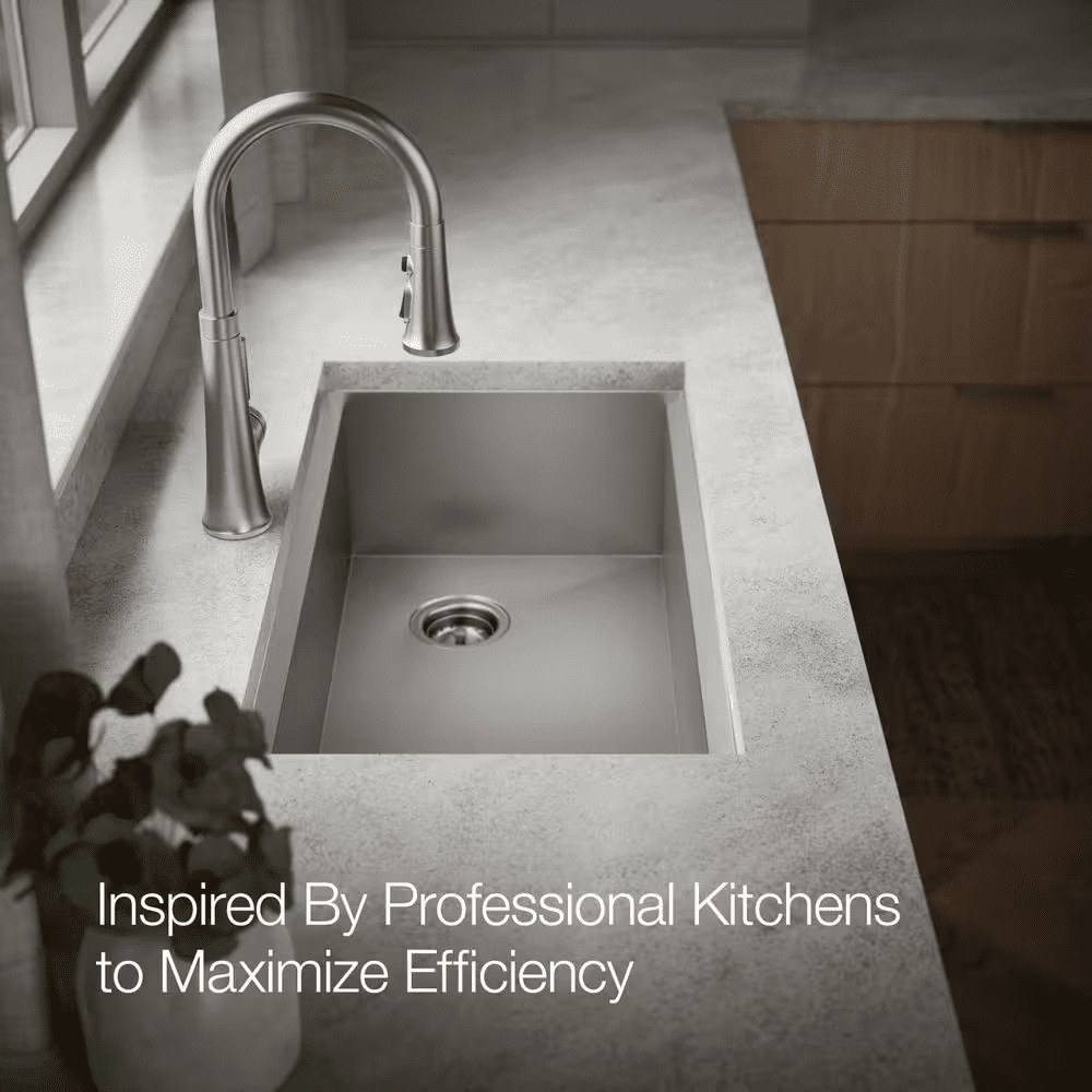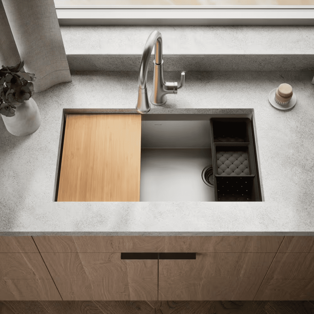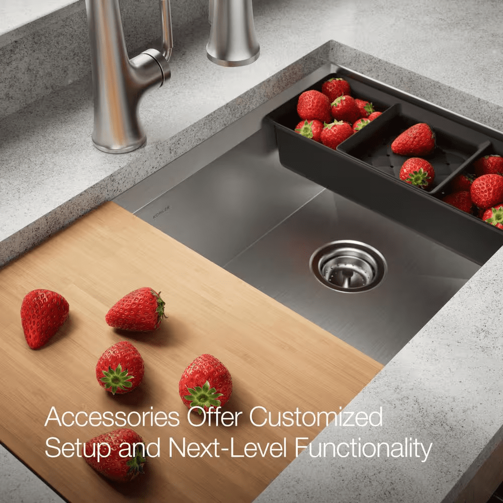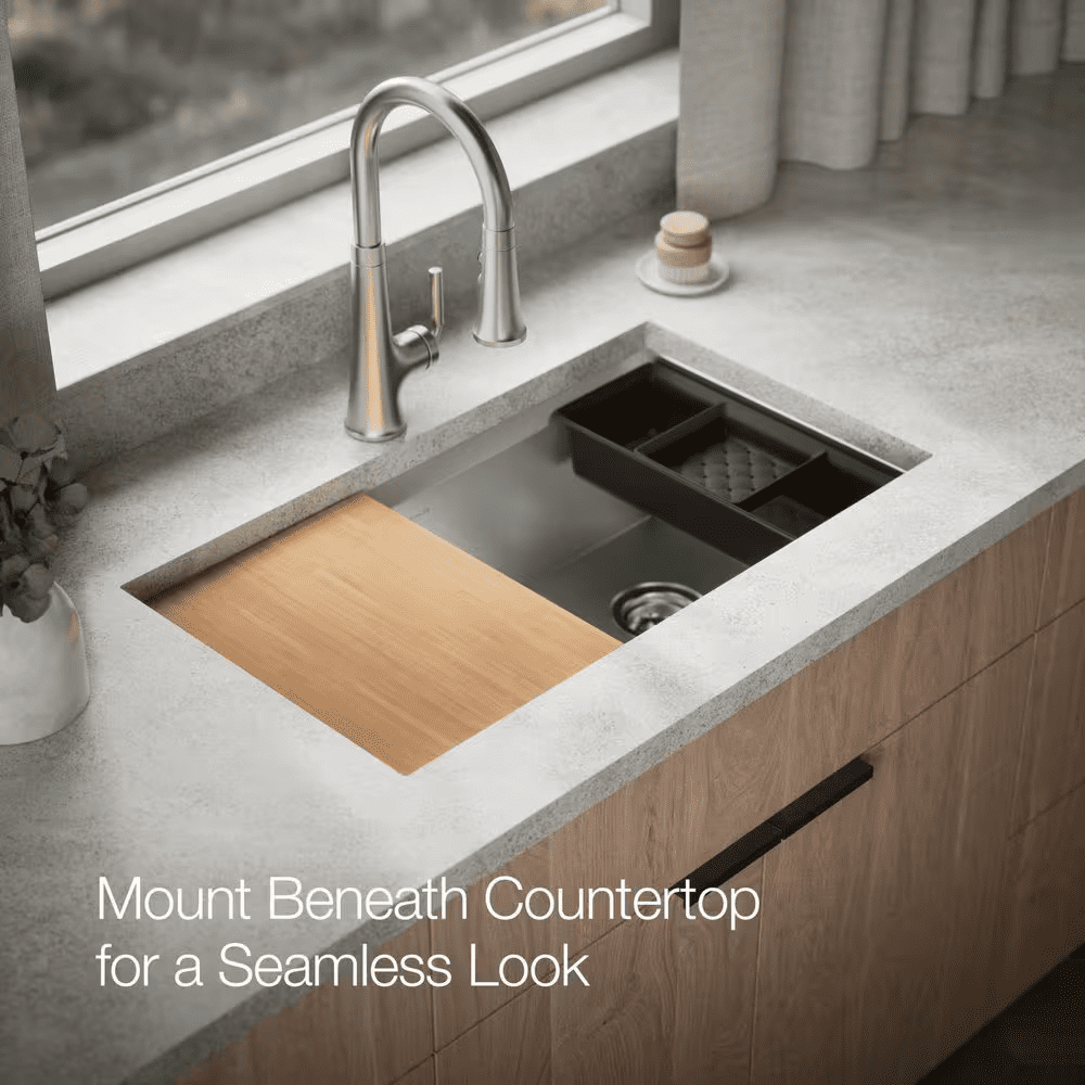The Lassen stainless steel single-bowl workstation kitchen sink features sleek and streamlined elements that pair seamlessly with your modern decor. The elegant, beveled edge effortlessly directs water into the sink and is designed to smoothly slide accessories for a custom arrangement. This workstation sink comes complete with a drain and strainer, a beautiful bamboo cutting board, and colander set for all your cooking needs. It can be installed as a top-mount or undermount sink and features a sound-absorption system that significantly reduces disposal and dishwashing noise.