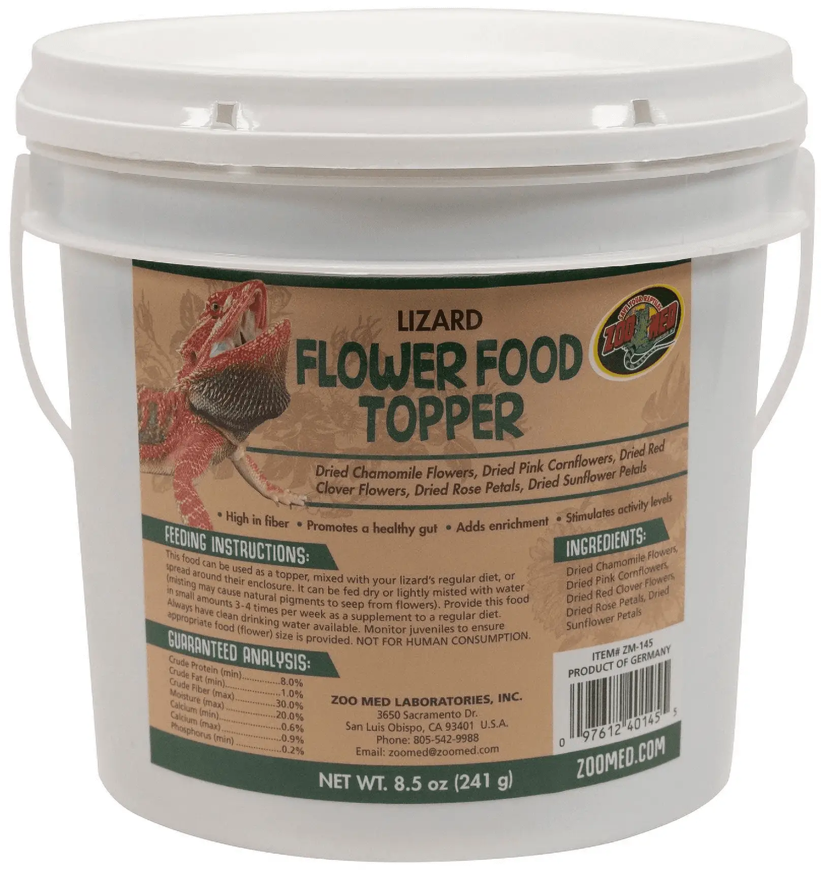 Feeding Guide: This food can be used as a topper, mixed with your lizards regular diet, or spread around the enclosure. It can be fed dry or lightly misted with water (misting may cause natural pigments to seep from flowers). Provide this food in small amounts 3-4 times per week as a supplement to a regular diet. Always have clean drinking water available. NOT FOR HUMAN CONSUMPTION.