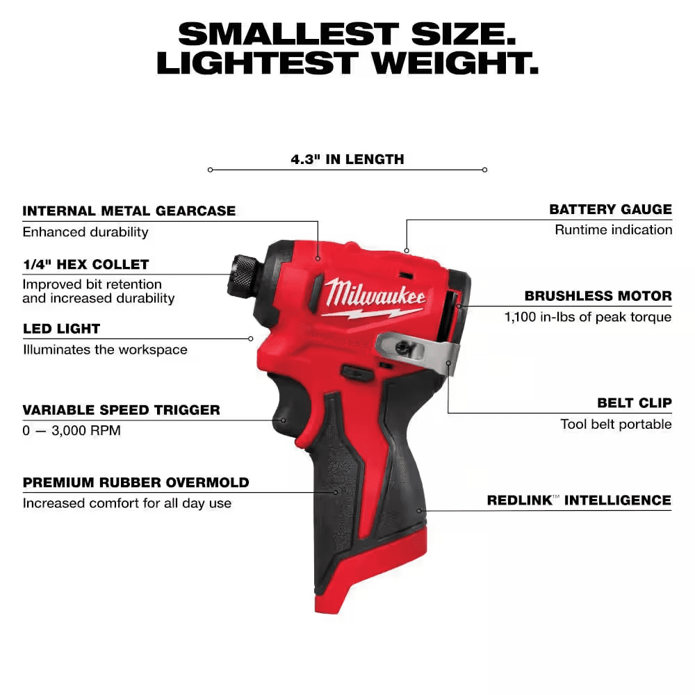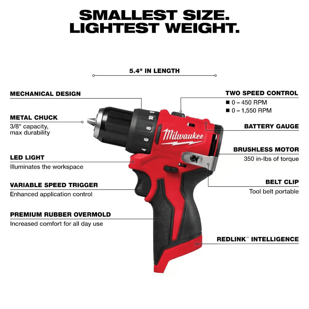 Our M12 Subcompact Brushless 2-Tool Combo + Ratchet Kit features the most compact and lightest weight drill and impact driver, providing ultimate access into tight spaces. This kit includes the M12 Subcompact Brushless 3/8″ Drill/Driver, M12 Subcompact Brushless 1/4″ Hex Impact Driver, M12 Cordless 3/8″ Lithium-Ion Ratchet, (2) M12 REDLITHIUM CP2.0 Battery Packs, M12 Charger and Contractor Bag. The compact drill is only 5.4″ long and under 2 pounds with a battery, allowing for minimal fatigue and excellent control, especially while working in tight spaces. The brushless motor delivers optimal tool performance at 350 in-lbs. of torque and up to 1,550 RPM. The impact driver measures only 4.3″ in length and 2.0″ in width, allowing for best access in tight spaces and weighing only 1.7 pounds with a battery. The brushless motor technology provides faster driving speeds with 1,100 in-lbs. of torque and up to 3,000 RPM to increase productivity. The ratchet produces up to 35 ft-lbs of torque and 2,500 RPM, giving users thw power and speed of a pneumatic ratchet without the hose. At just 10-3/4″ long and 1.9lbs, the ratchet is tool-blet portable, and features a 3/4″ low profile head for work in the tightest of spaces and engine bays. MILWAUKEE REDLINK Intelligence communicates with the M12 REDLITHIUM batteries to provide optimal performance for the tools. The M12 Subcompact Brushless 2-Tool Combo Kit is part of the M12 system, fully compatible with over 150+ solutions.