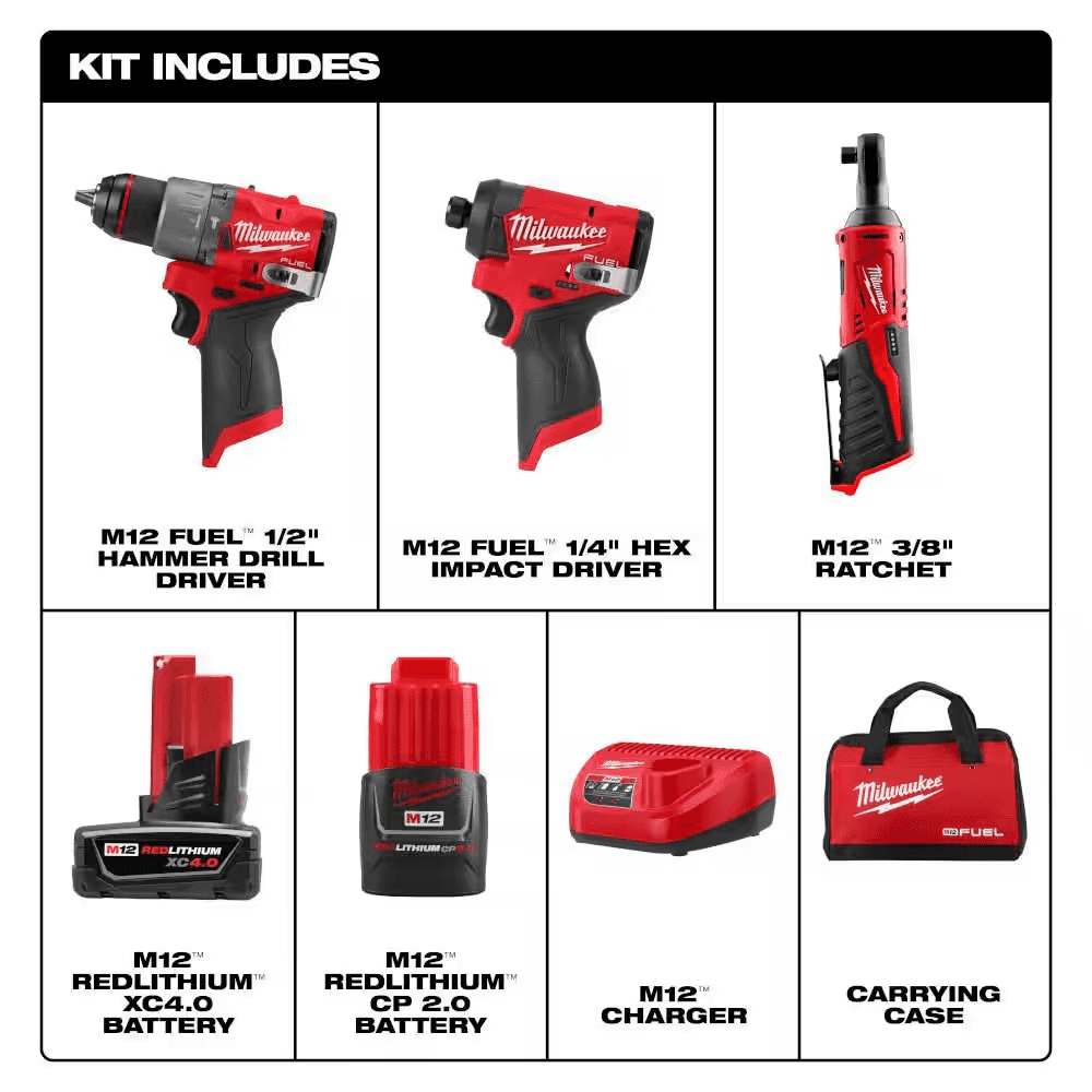 Milwaukee M12 FUEL 2-Tool Combo Kit has the Most Powerful Subcompact Drill, the Fastest Driving Subcompact Impact Driver while being the overall Most Compact Drill and Impact Driver. Includes Milwaukee M12 FUEL 1/2 in. Drill Driver, M12 FUEL 1/4 in. Hex Impact Driver, M12 REDLITHIUM XC 4.0Ah Battery Pack, M12 REDLITHIUM CP 2.0Ah Battery Pack, with an M12 charger and a contractor bag. The M12 FUEL 1/2 in. Drill/Driver is the Most Powerful Subcompact Drill Driver, the most compact in size and has the fastest speed under load. The POWERSTATE brushless motor delivers the most power on the widest variety of applications. The portable drill is the shortest solution in its class offering maneuverability and access to tight spaces. Milwaukee REDLINK PLUS Intelligence delivers top of the line thermal performance to give users the Fastest Speed Under Load. The Milwaukee M12 3/8 in. Ratchet delivers best-in-class power, speed and durability for sub-compact tools. The cordless ratchet wrench is ideal for auto mechanics, maintenance and repair professionals looking for maximum performance and productivity in a subcompact cordless tool. It utilizes a powerful 12-Volt motor to produce up to 35 ft./lbs. of torque and 250 RPM, giving users the power and speed of a pneumatic ratchet without the air hose. The cordless ratchet is powered by the M12 REDLITHIUM Battery Pack (sold separately), delivering more work per charge and more work over pack life than the competitors.