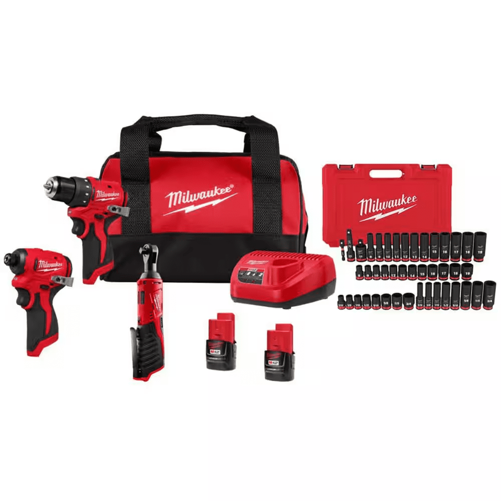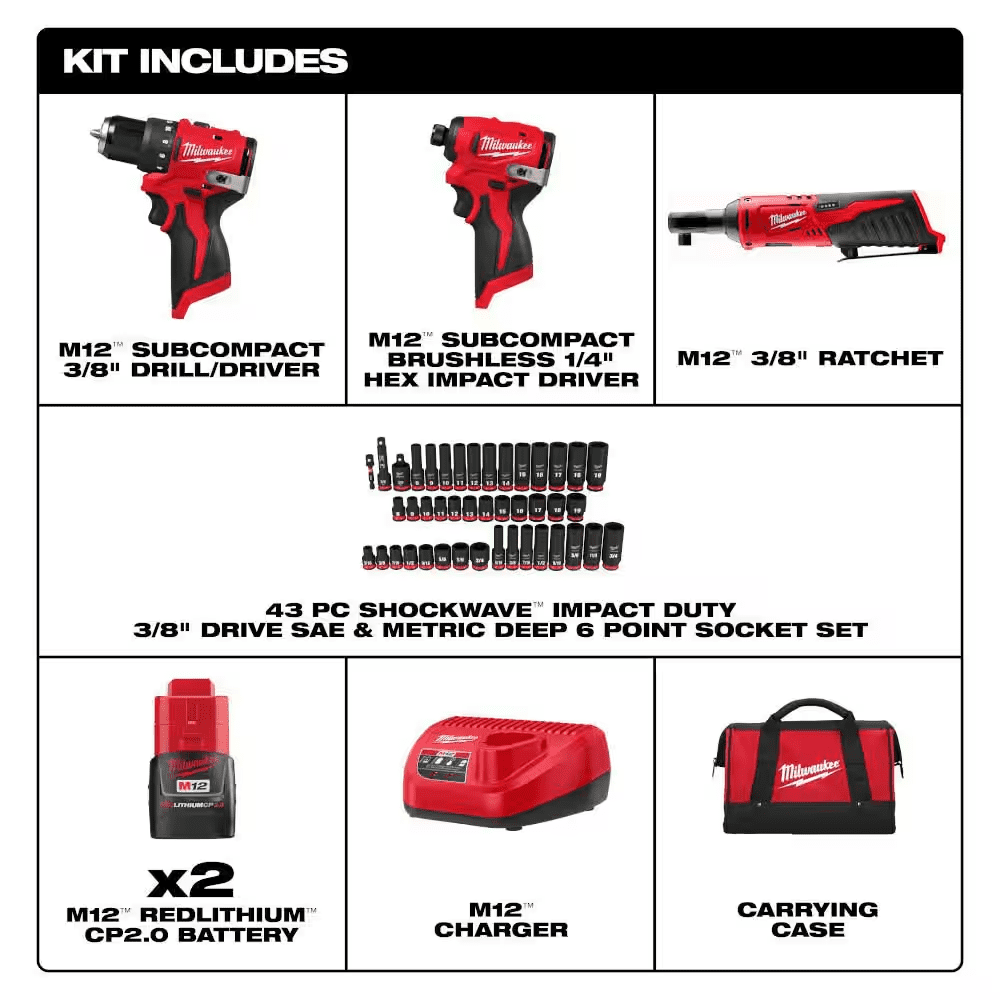 Our M12 Subcompact Brushless 2-Tool Combo + Ratchet Kit features the most compact and lightest weight drill and impact driver, providing ultimate access into tight spaces. This kit includes the M12 Subcompact Brushless 3/8″ Drill/Driver, M12 Subcompact Brushless 1/4″ Hex Impact Driver, M12 Cordless 3/8″ Lithium-Ion Ratchet, (2) M12 REDLITHIUM CP2.0 Battery Packs, M12 Charger and Contractor Bag. The compact drill is only 5.4″ long and under 2 pounds with a battery, allowing for minimal fatigue and excellent control, especially while working in tight spaces. The brushless motor delivers optimal tool performance at 350 in-lbs. of torque and up to 1,550 RPM. The impact driver measures only 4.3″ in length and 2.0″ in width, allowing for best access in tight spaces and weighing only 1.7 pounds with a battery. The brushless motor technology provides faster driving speeds with 1,100 in-lbs. of torque and up to 3,000 RPM to increase productivity. The ratchet produces up to 35 ft-lbs of torque and 2,500 RPM, giving users thw power and speed of a pneumatic ratchet without the hose. At just 10-3/4″ long and 1.9lbs, the ratchet is tool-blet portable, and features a 3/4″ low profile head for work in the tightest of spaces and engine bays. MILWAUKEE REDLINK Intelligence communicates with the M12 REDLITHIUM batteries to provide optimal performance for the tools. The M12 Subcompact Brushless 2-Tool Combo Kit is part of the M12 system, fully compatible with over 150+ solutions.