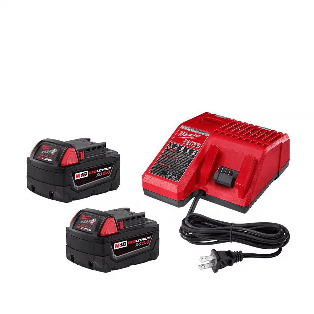 The MILWAUKEE M18 REDLITHIUM XC5.0 Starter Kit delivers up to 2.5X more runtime, 20% more power, and 2X more recharges than standard lithium-ion batteries. The lithium-ion battery pack features superior pack construction, electronics, and performance. The rechargeable battery also offers users 5.0 amp-hours of runtime. Each battery pack is durably built for heavy-duty use, runs cooler, and performs in climates below 0°F/-18°C. This protection routes water away from the electronics and out of the battery pack, extends the battery’s run-time and life by minimizing heat, and prevents pack failures from vibration or drops. Built-in REDLINK Intelligence protects the battery from overloads, preventing users from damaging their cordless power tools in heavy-duty situations, while the discharge protection prevents cell damage. An integrated temperature management system and individual cell monitoring help to maximize the battery’s life. In addition to the batteries, the starter kit includes the M18 & M12 Battery Charger.