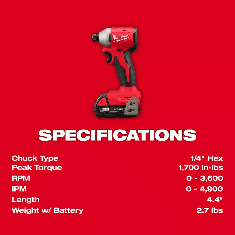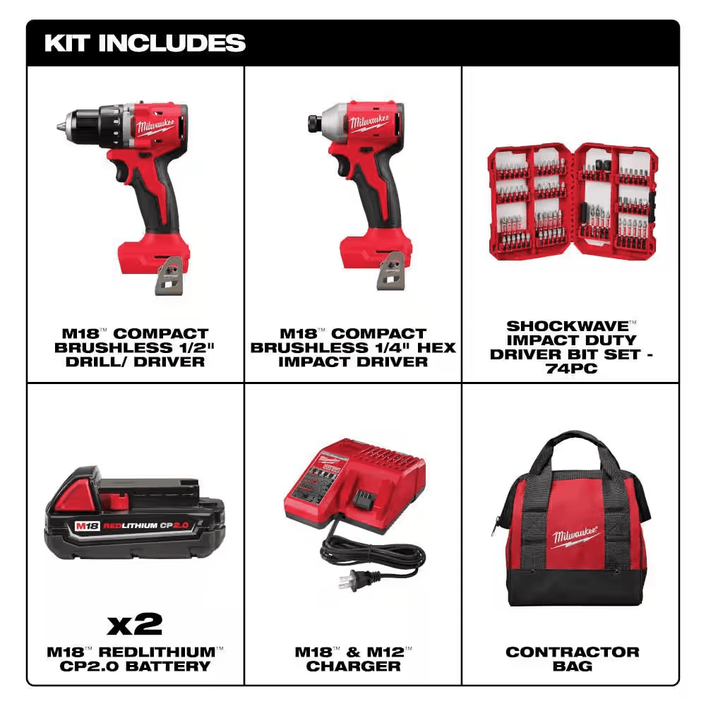The MILWAUKEE M18 Compact Brushless 2-Tool Combo Kit is more compact with faster speeds in the application. Includes the M18 Compact Brushless ½” Drill Driver, M18 Compact Brushless ¼” Hex Impact Driver, (2) M18 REDLITHIUM CP2.0 Battery Packs, M18/M12 Multi-volt Charger and Contractor Bag. The compact drill is 5.7″ in length and lightweight at 2.3 lbs without a battery allowing for excellent control, especially while working in overhead or tight spaces. The brushless motor was built to ensure optimal tool performance delivering 550 in-lbs of torque and 0-1,700 RPM, able to tackle a wide range of drilling and fastening applications. The impact driver measures only 4.4″ in length and 2.1″ in width, allowing for better access in tight spaces while being lightweight and portable. The brushless motor technology provides 1,700 in-lbs of torque and 3600 RPMs for faster speed and increased productivity. MILWAUKEE REDLINK Intelligence optimizes the way the M18 REDLITHIUM batteries work with the tools for best-in-class performance. These cordless tools have premium components, including an all-metal gear case and ½” metal chuck providing the durability that professionals require. The M18 Compact Brushless 2-Tool Combo Kit is part of the M18 system, fully compatible with over 250+ solutions.