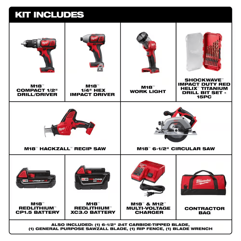The MILWAUKEE M18 5-Piece Combo Kit allows users to tackle any job like a pro with 18-Volt Lithium-Ion Cordless technology. This power tool kit includes a 1/2 in. Drill Driver, 1/4 in. Hex Impact Driver, HACKZALL Recip Saw, 6 1/2 in. Circular Saw and a Work Light. It’s perfect for users’ cutting, drilling, and driving projects and has REDLITHIUM power for more torque and a longer run time. The Milwaukee power tool kit features patented technologies with an innovative motor design and advanced ergonomics.