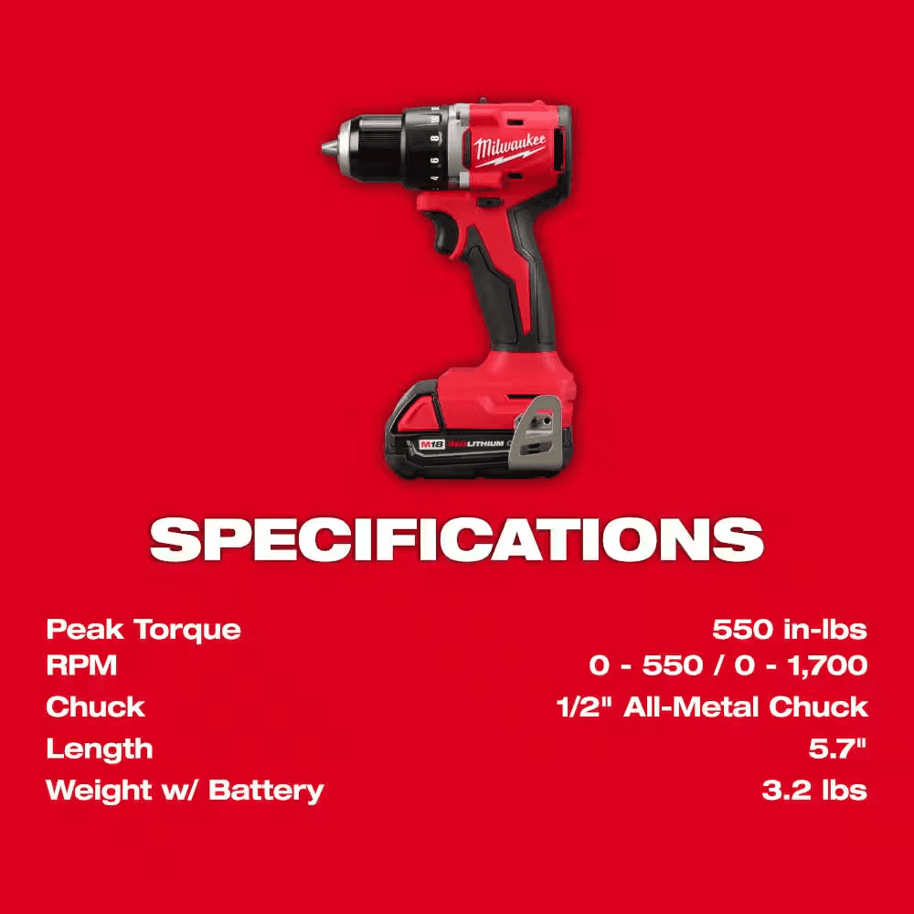 The MILWAUKEE M18 Compact Brushless 2-Tool Combo Kit is more compact with faster speeds in the application. Includes the M18 Compact Brushless ½” Drill Driver, M18 Compact Brushless ¼” Hex Impact Driver, (2) M18 REDLITHIUM CP2.0 Battery Packs, M18/M12 Multi-volt Charger and Contractor Bag. The compact drill is 5.7″ in length and lightweight at 2.3 lbs without a battery allowing for excellent control, especially while working in overhead or tight spaces. The brushless motor was built to ensure optimal tool performance delivering 550 in-lbs of torque and 0-1,700 RPM, able to tackle a wide range of drilling and fastening applications. The impact driver measures only 4.4″ in length and 2.1″ in width, allowing for better access in tight spaces while being lightweight and portable. The brushless motor technology provides 1,700 in-lbs of torque and 3600 RPMs for faster speed and increased productivity. MILWAUKEE REDLINK Intelligence optimizes the way the M18 REDLITHIUM batteries work with the tools for best-in-class performance. These cordless tools have premium components, including an all-metal gear case and ½” metal chuck providing the durability that professionals require. The M18 Compact Brushless 2-Tool Combo Kit is part of the M18 system, fully compatible with over 250+ solutions.