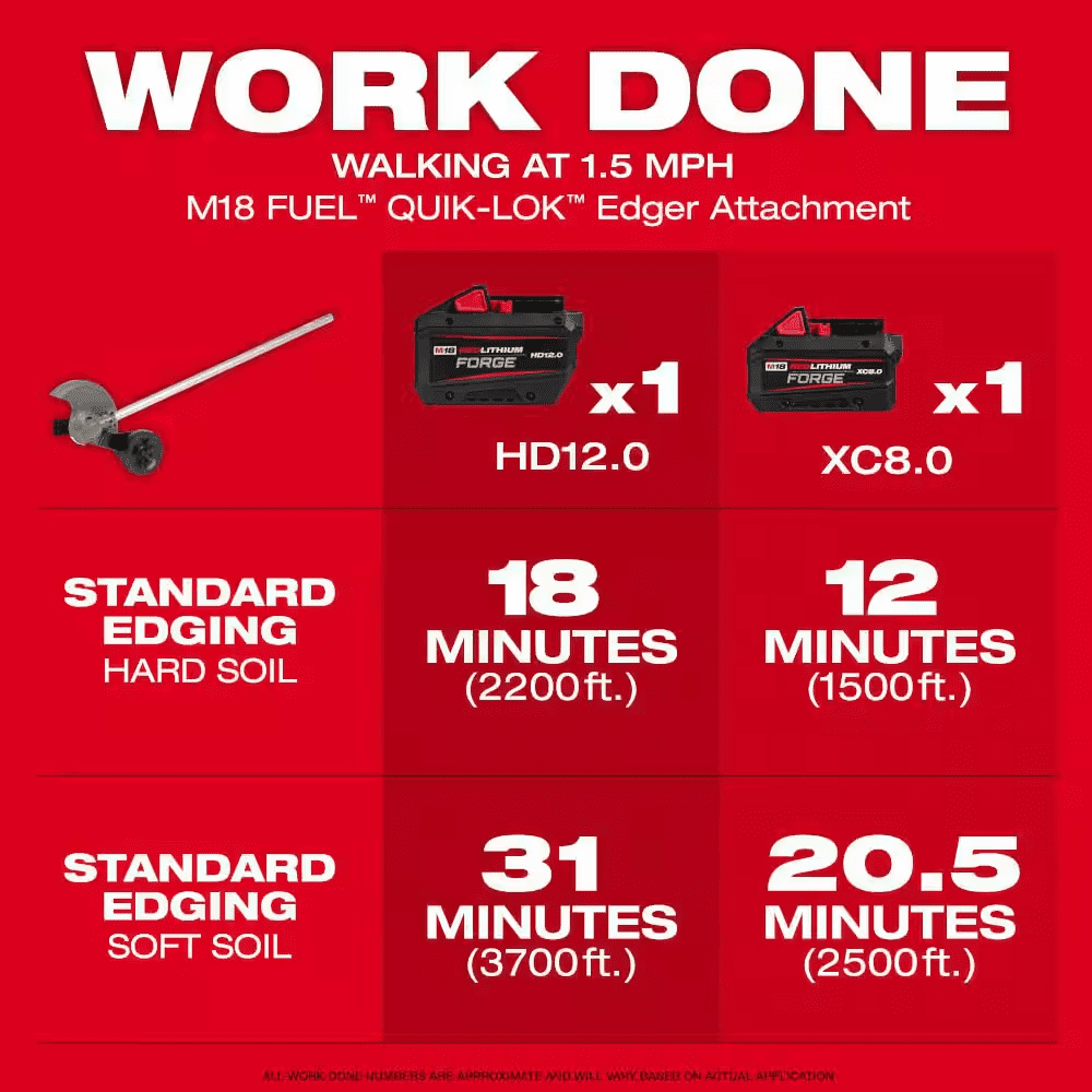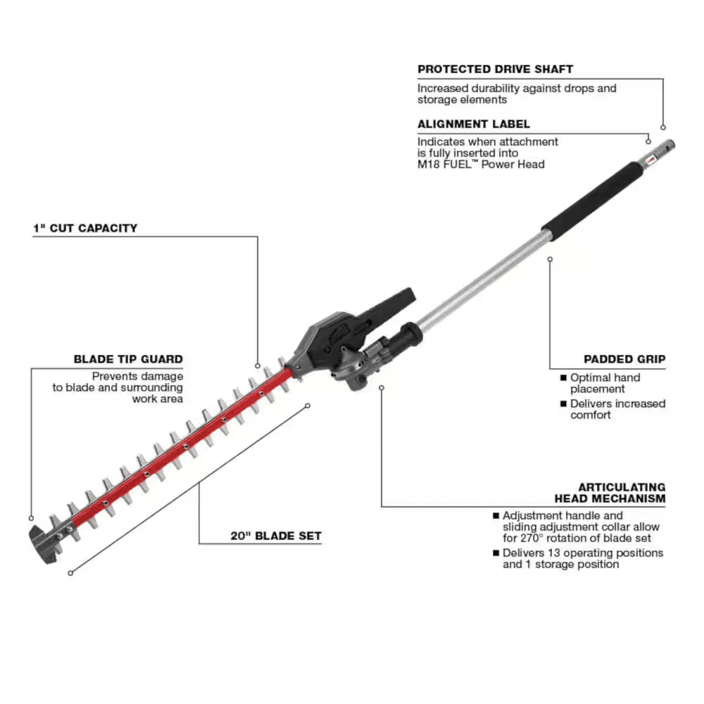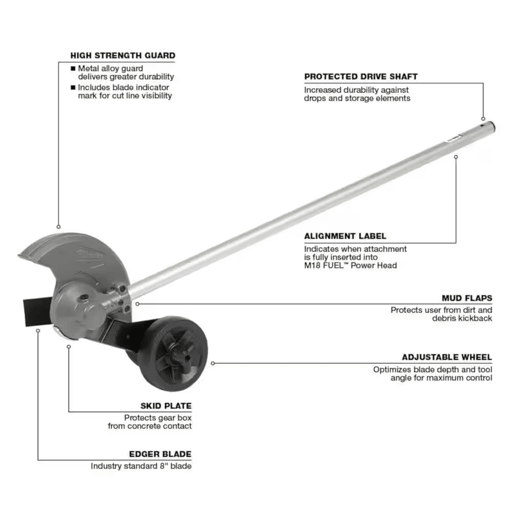 Designed to meet the needs of landscape maintenance professionals, the MILWAUKEE M18 FUEL String Trimmer w/ QUIK-LOK provides you with more power than 31cc gas trimmers, reaches full throttle in under 1 second, and is part of the industry’s most capable attachment system. The split boom cordless string trimmer is made up of two components – the M18 FUEL Power Head w/ QUIK-LOK and QUIK-LOK String Trimmer Attachment. This allows you to quickly swap out any of the 13 attachments on a single power head, delivering ultimate versatility and a lower cost of ownership. The advanced electronic package also delivers instant throttle response, 3 speeds, and a variable speed trigger. The trimmer delivers best-in-class performance when paired w/ the included M18 REDLITHIUM FORGE XC8.0 Battery. The MILWAUKEE M18 FUEL QUIK-LOK 10″ Pole Saw Attachment features a 10″ OREGON bar and chain which provides users with smooth and fast cuts with minimal kickback. The Milwaukee M18 FUEL QUIK-LOK Articulating Hedge Trimmer Attachment’s articulating mechanism allows for 270 degree rotation of the blade set, which gives users 13 operating positions. The hedge trimmer attachment boasts a 20 in. blade with 1 in. cut capacity, allowing users to clear more material in a single pass. The MILWAUKEE M18 FUEL QUIK-LOK Edger Attachment features a split shaft design and has an 8 in. blade and high strength guard for increased durability.