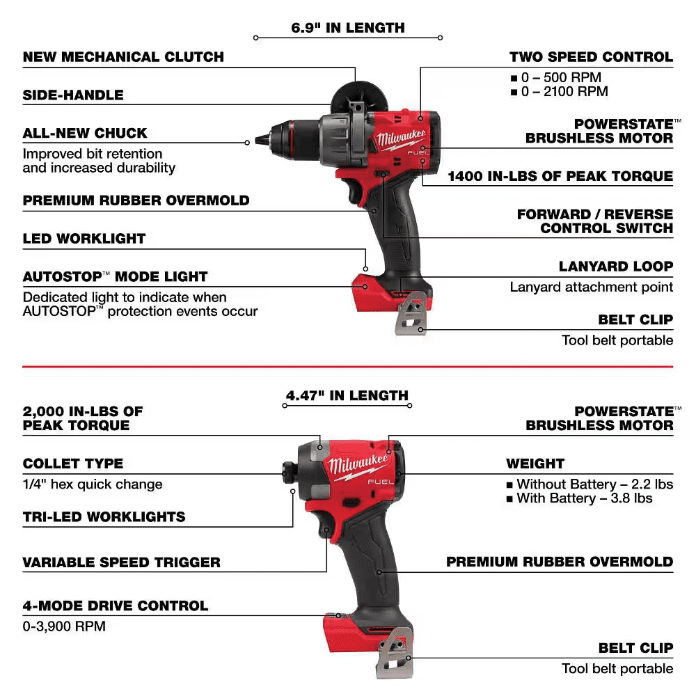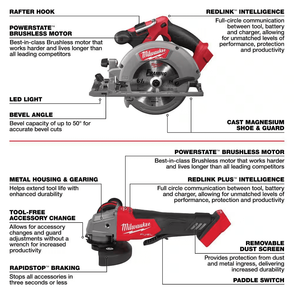 The Milwaukee M18 FUEL 7-Tool Combo Kit delivers the most advanced 18-volt cordless drilling, fastening, and cutting technology in the industry. This power tool kit features seven M18 FUEL 18-Volt lithium-ion brushless cordless tools, including a 1/2 in. hammer drill, 1/4 in. impact driver, 1/2 in. mid-torque impact wrench, SAWZALL reciprocating saw, 6-1/2 in. circular saw, 4-1/2 in. / 5 in. grinder and LED work light. M18 FUEL is fully compatible with the MILWAUKEE M18 Cordless system, featuring over 200 plus tools. M18 FUEL features the most advanced cordless technology in the industry with a POWERSTATE Brushless Motor, REDLINK PLUS Intelligence, and REDLITHIUM Battery Technology, for longer motor life, longer run time, and more power.