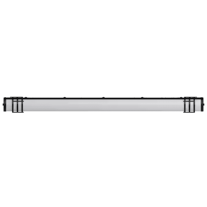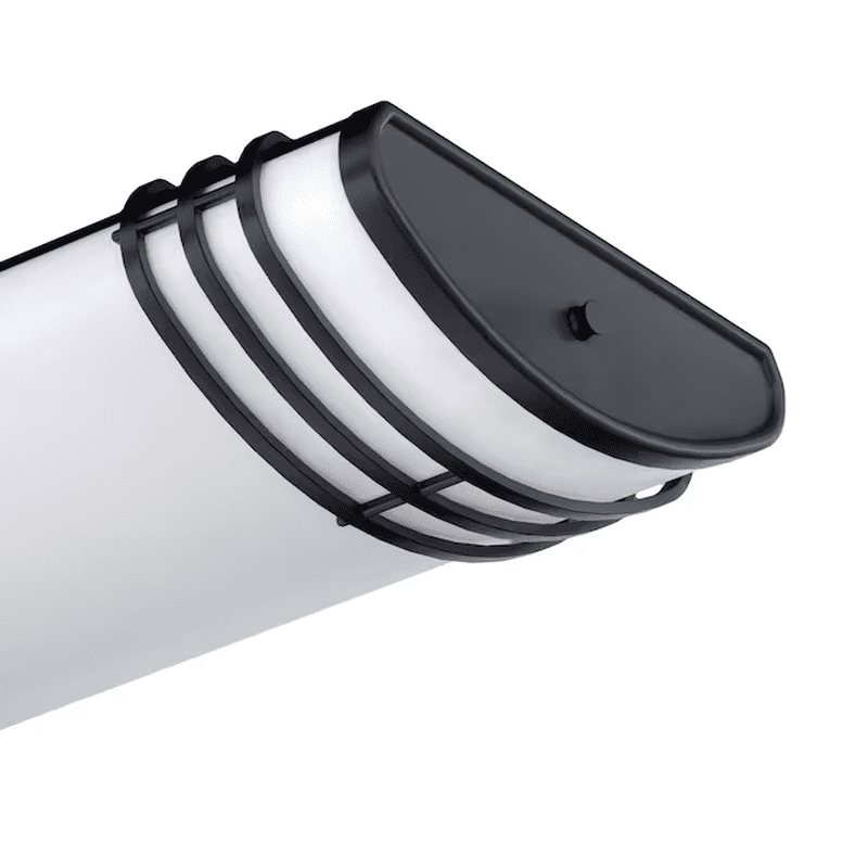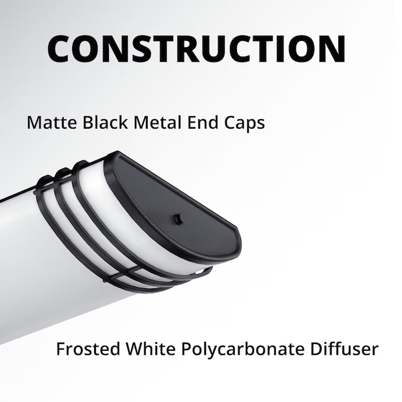 - Made with decorative matte black metal end caps and a frosted white polycarbonate lens
