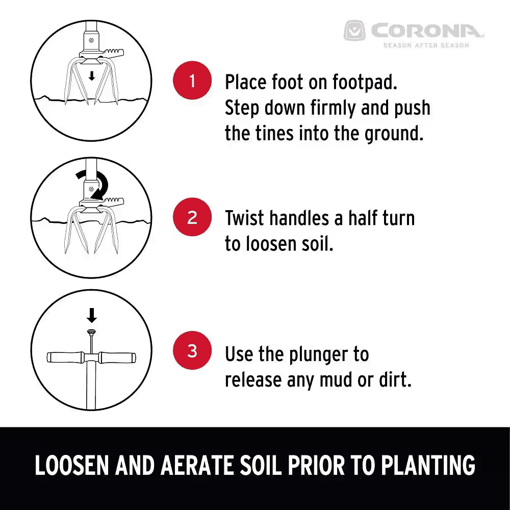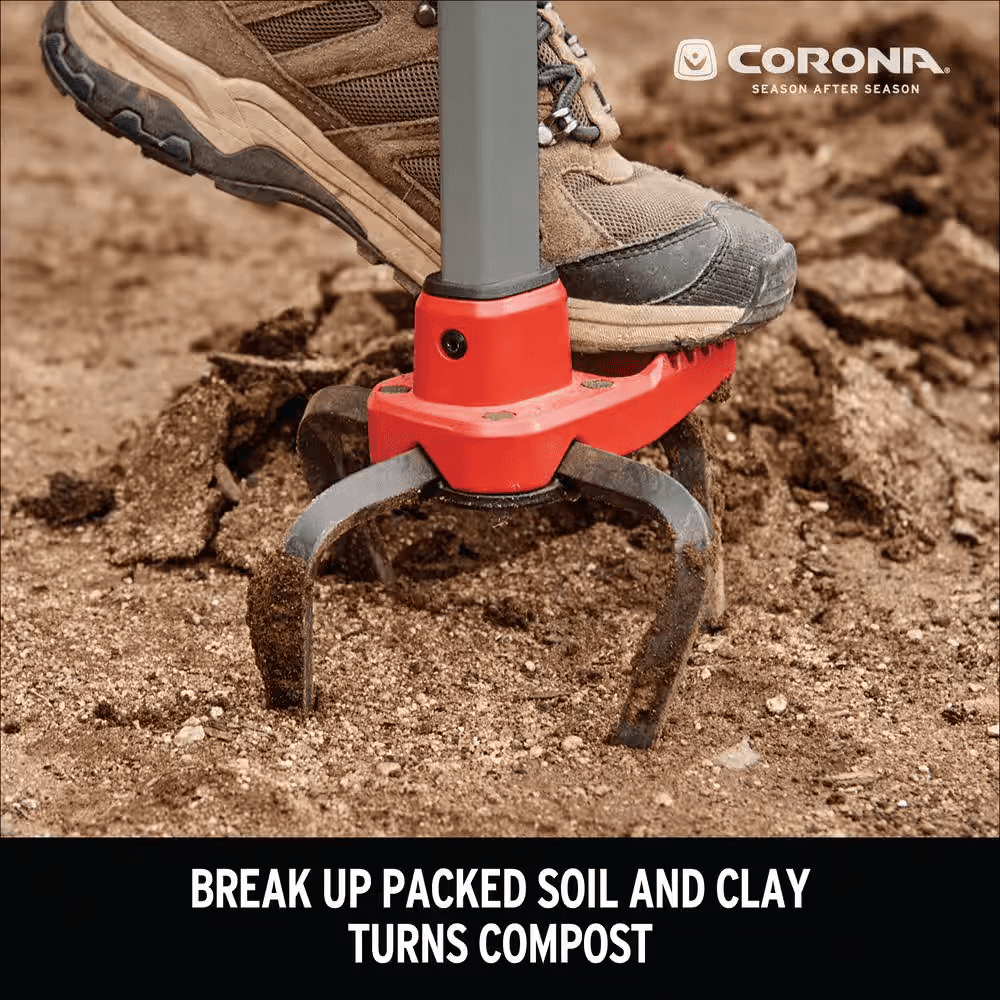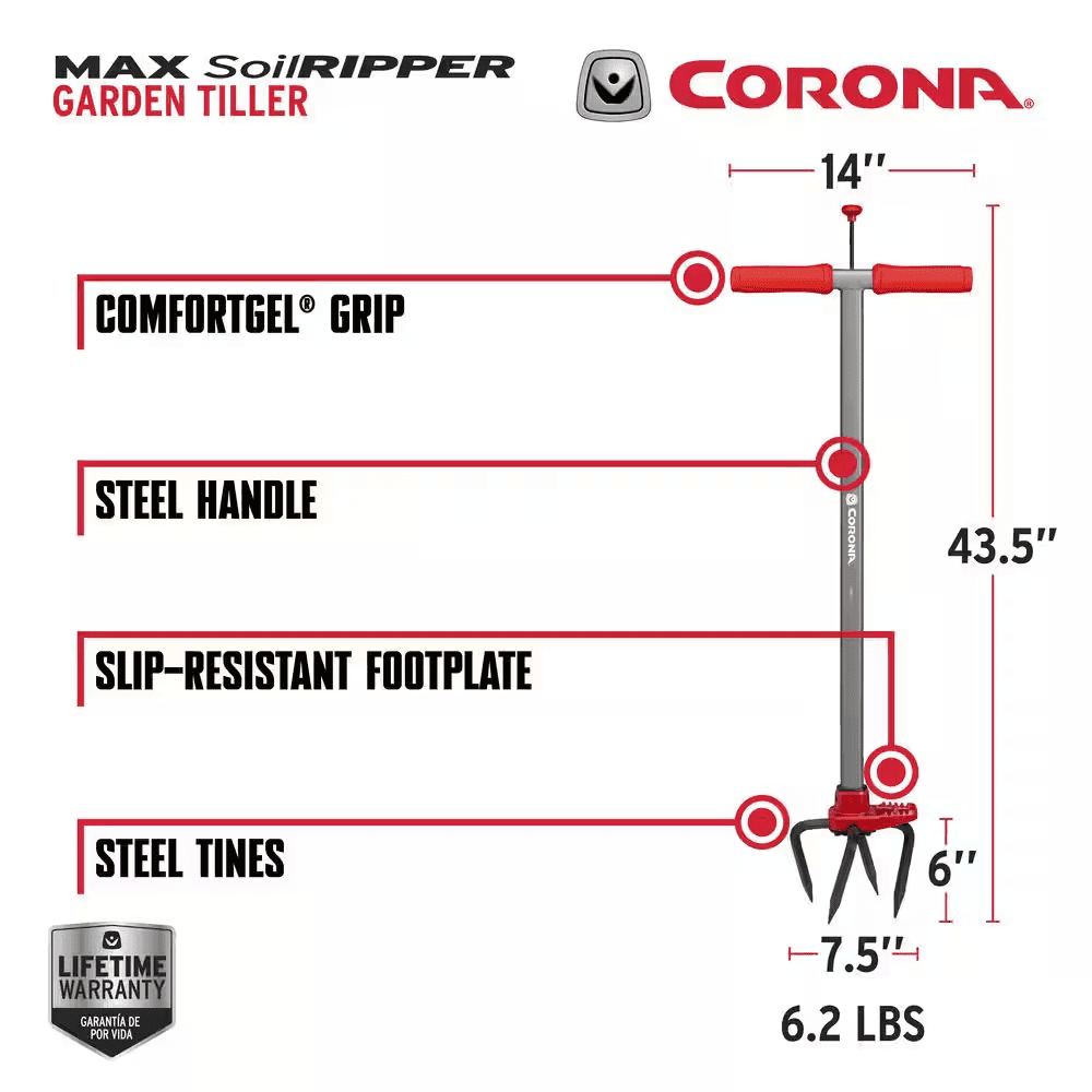 Steel tined tiller used for the development of seed-rows in gardens. Large 9 in. W x 6 in. durable, heat-treated high carbon long steel tines. All metal footplate. Quick release plunger to push clumped dirt away from tines.