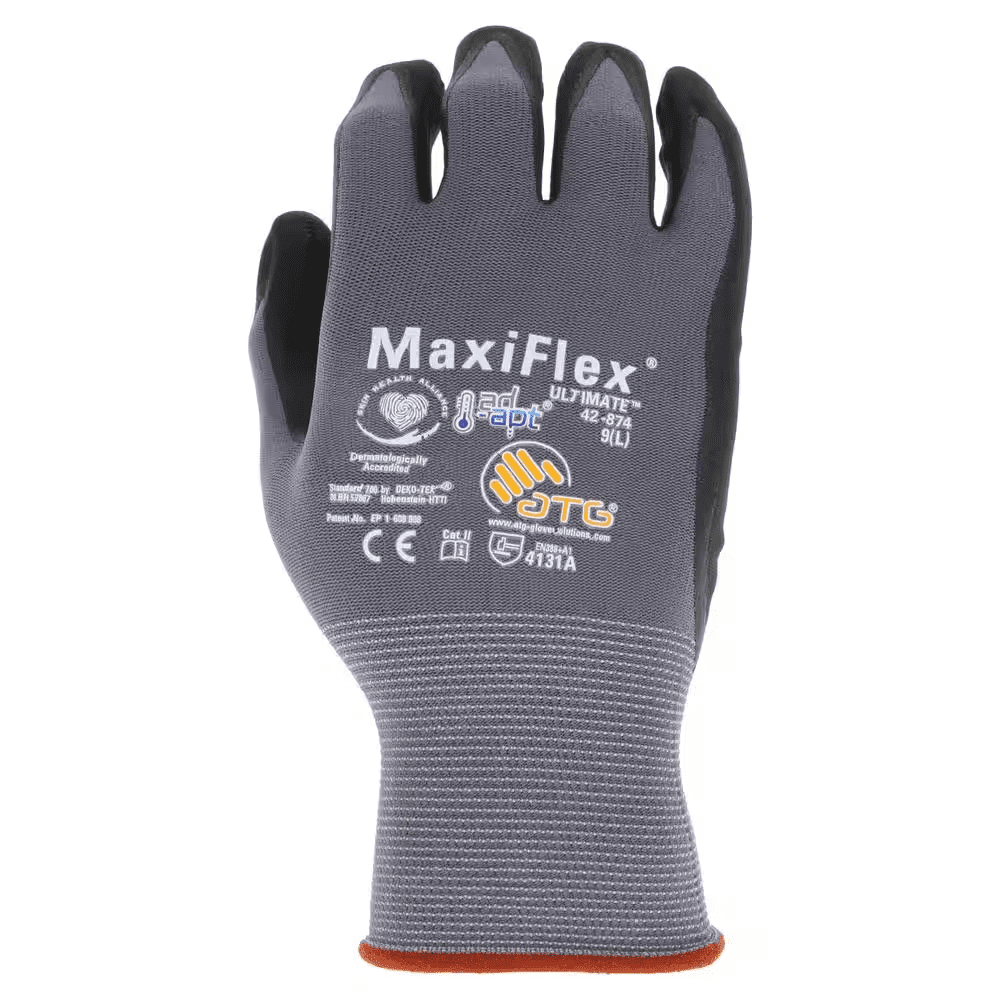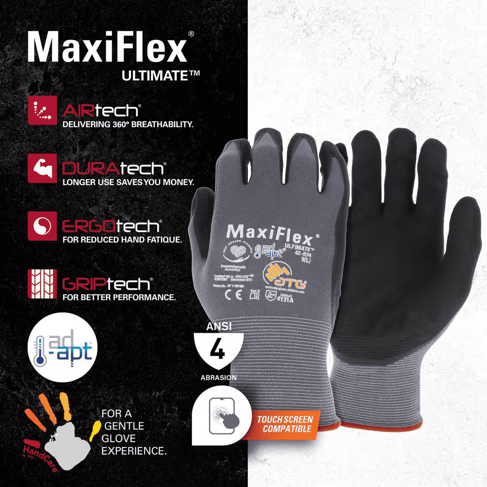 Now the iconic MaxiFlex gets even better thanks to the inclusion of the new AD-APT Cooling Technology. The MaxiFlex Ultimate gloves with AD-APT Technology deliver an exceptional grip and abrasion resistance, making them ideal for various tasks. Our patented micro-foam nitrile coating provides unmatched 360° breathability, setting a new standard for glove comfort. These gloves have a slim, form-fitting design that reduces hand fatigue and a knit wrist to keep dirt and debris at bay. These gloves also offer touchscreen compatibility, allowing you to operate your devices without removing them. The included AD-APT Technology is activated by the movement of your hands and increased temperature within the glove, releasing a natural cooling agent that keeps your hand dry and make them cooler.