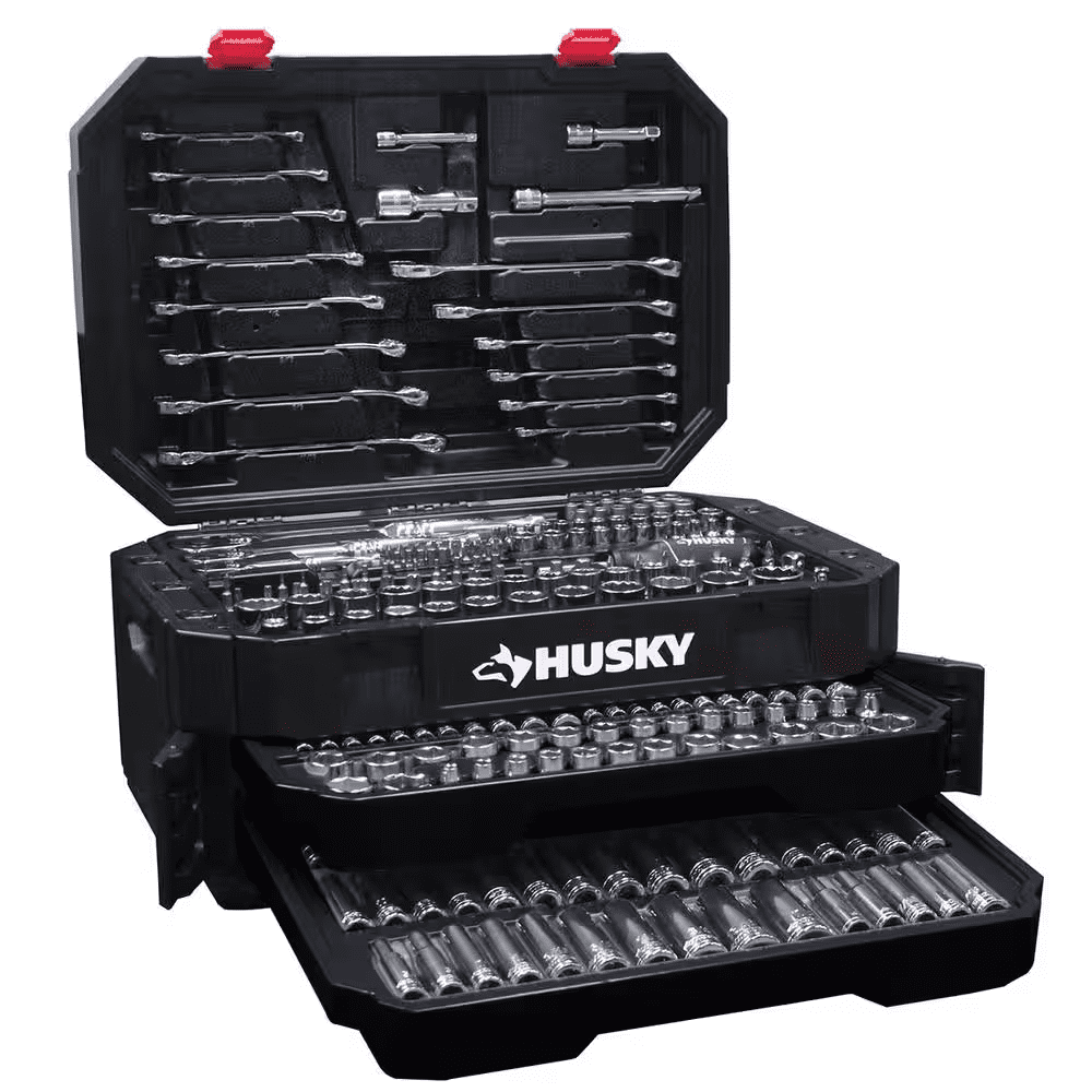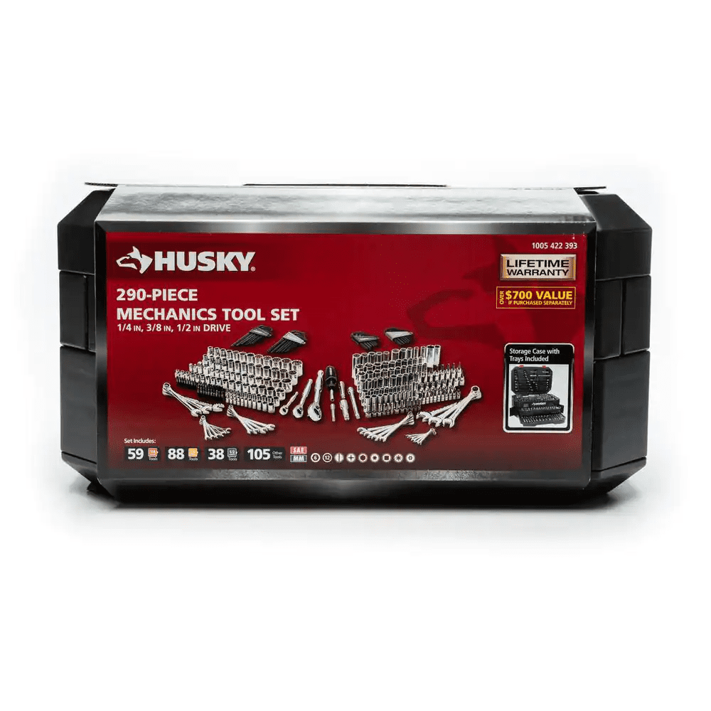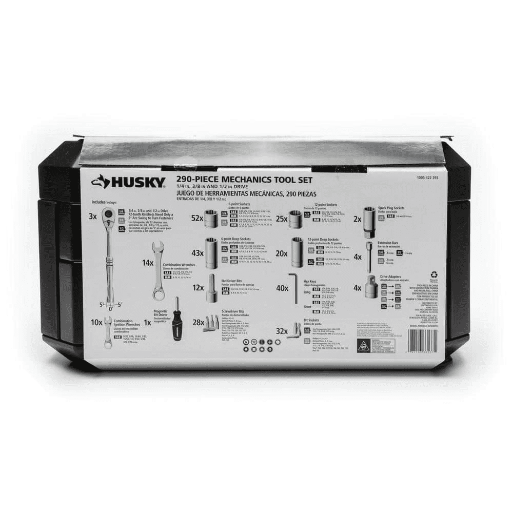 The Husky 290-piece 1/4 in., 3/8 in. and 1/2 in. drive mechanics tool set offers a comprehensive selections of tools for the professional or DIY mechanics workshop. The wide variety of standard and deep sockets along with the assortment of combination wrenches and bit sockets will allow you to tackle any fastening or repair project. This Husky 290-piece tool set will provide the novice or professional with a huge assortment of durable and reliable tools to get the job done.