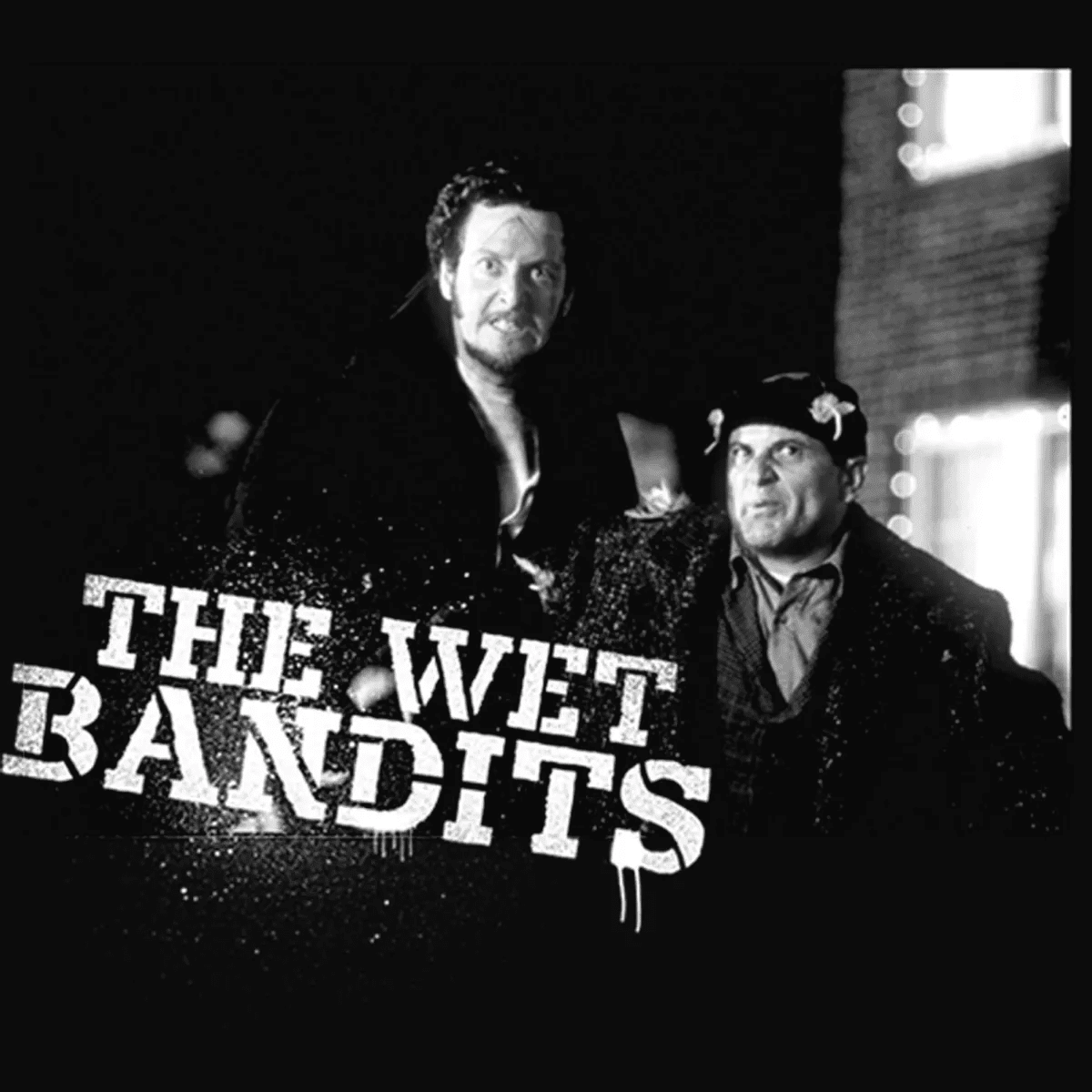 - Strut your stuff with this stylish new Christmas men’s t-shirt that is perfect for the holidays! Featuring a black and white photo of Harry and Marv with the text: “The Wet Bandits,” across the front.