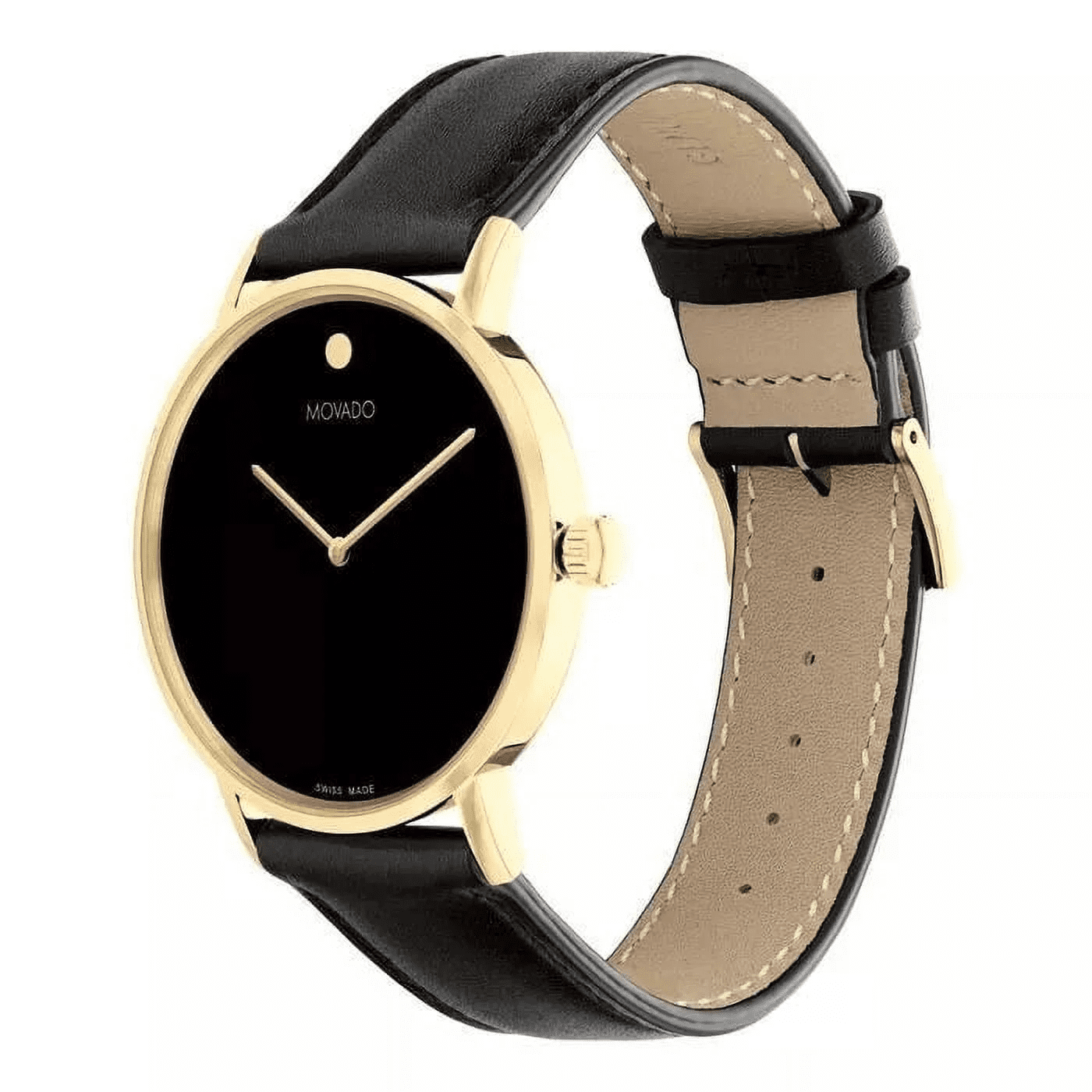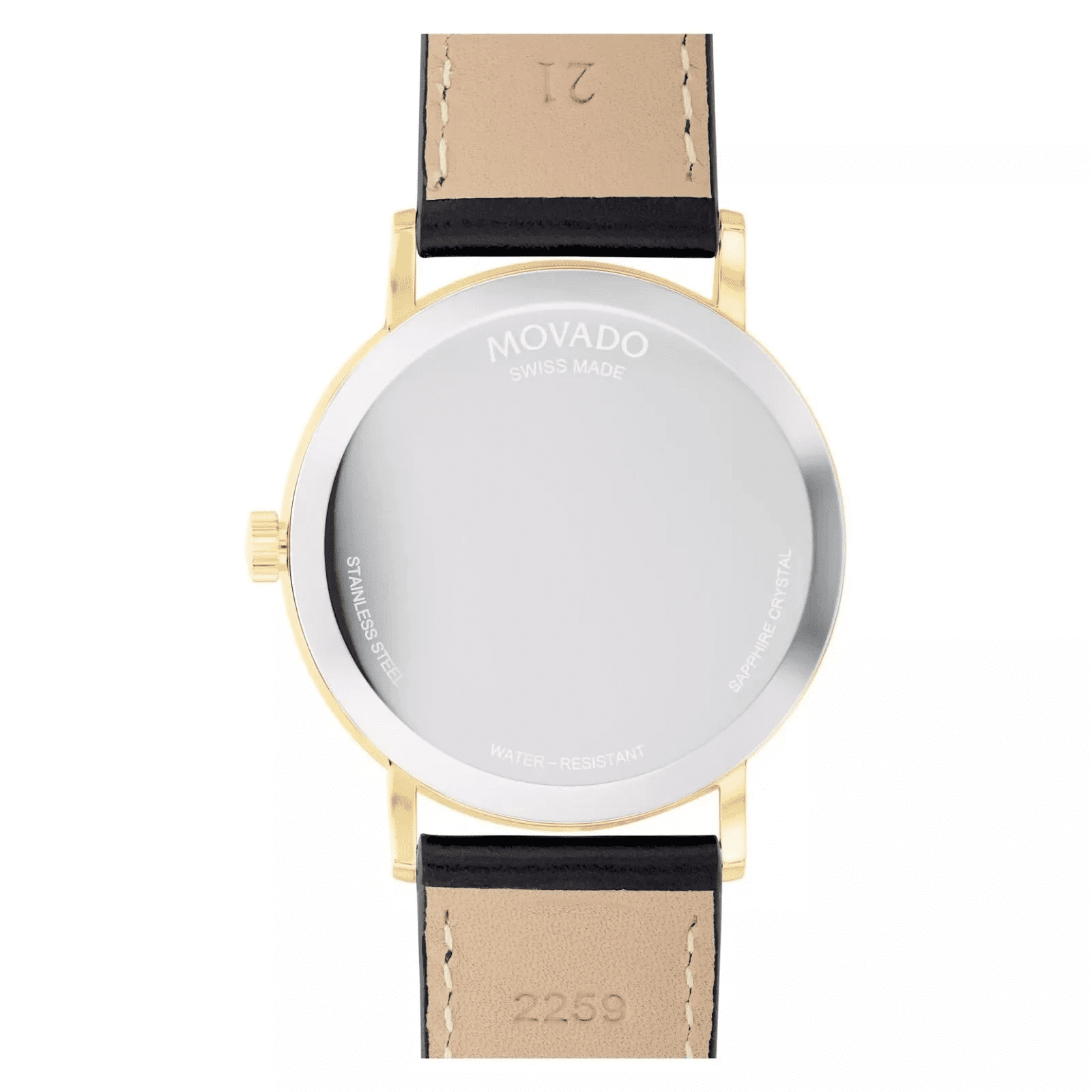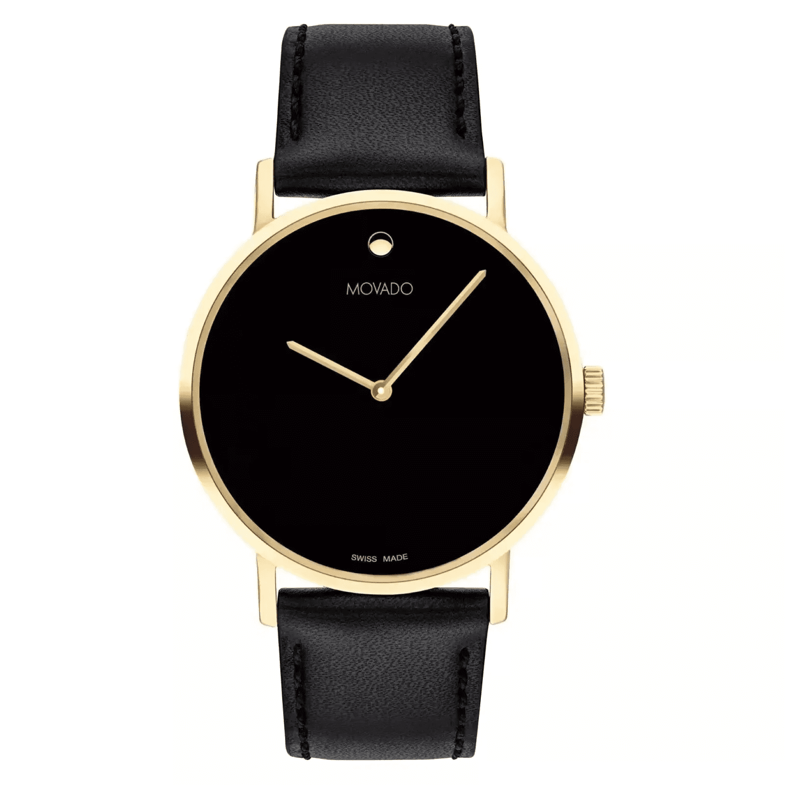 An icon of modern design, Movado Signature watch, 40mm yellow gold pvd stainless steel case, black dial, black leather strap
