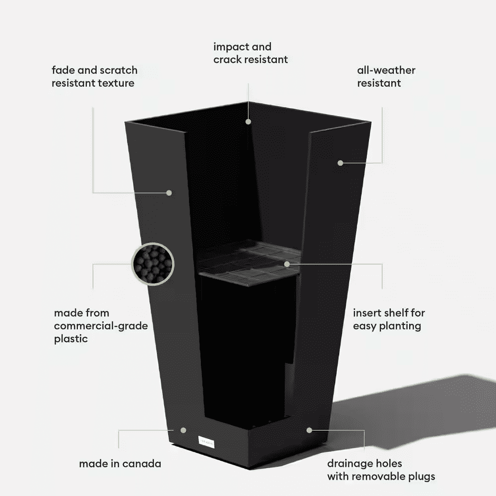 The original all-weather planter-with tapered edges, clean lines and a smooth finish, the Veradek Midland adds character to any outdoor or indoor space whether it’s the front porch, patio, or living room. Complemented by its modern appearance, the Midland is thoughtfully curated with functionality in mind-easily switch out tall plants, flowers or shrubs and prevent overwatering with the included removable insert shelf and pre-drilled drainage holes. This sturdy yet lightweight tall planter is proudly crafted in Canada from high-grade recycled plastic, making it resistant to cracks, fading and UV and allowing it to withstand extreme temperatures ranging from -20 to +120 degrees. With the ideal balance of design, structure and purpose, the Midland pairs perfectly with any arrangement, any season.