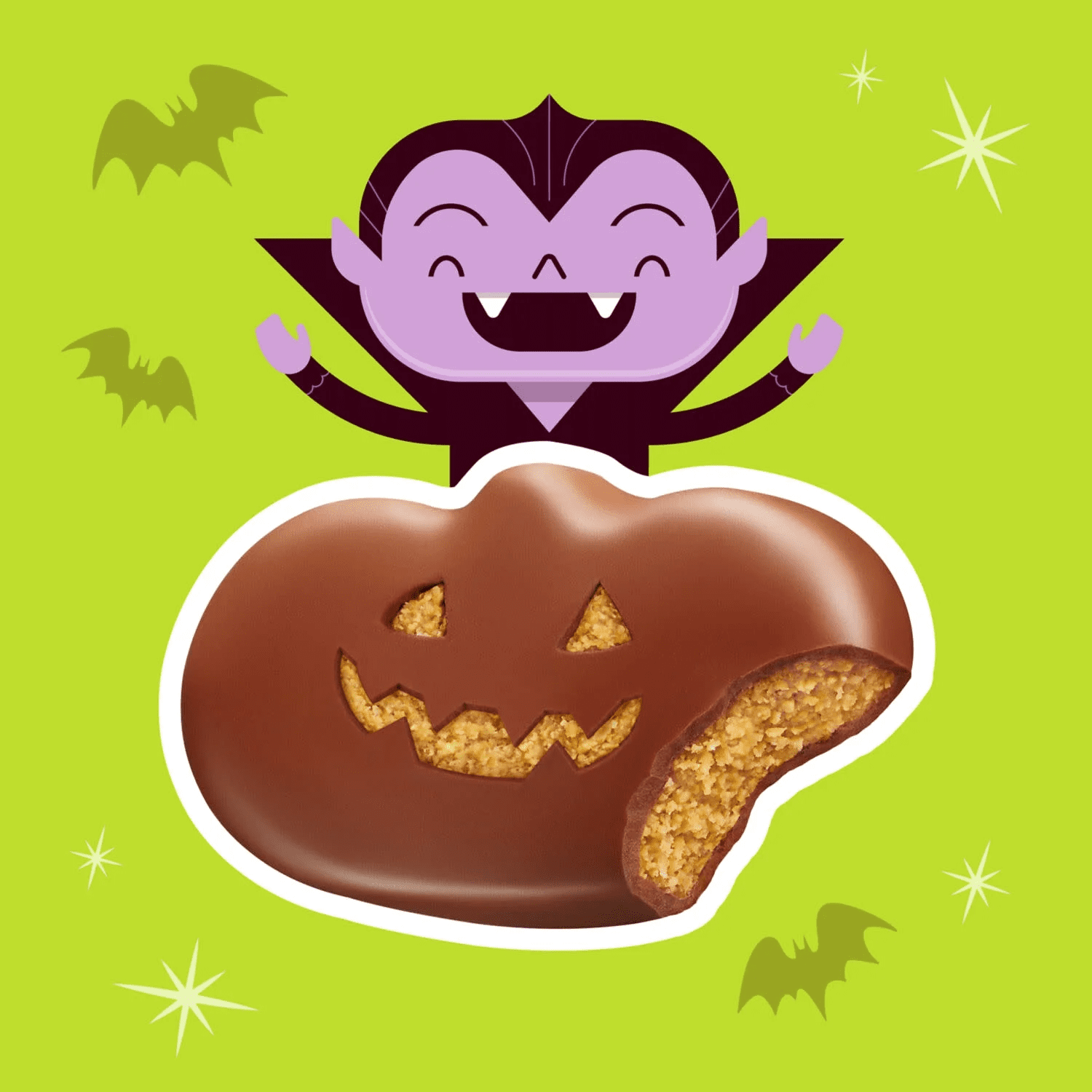 - Individually wrapped kosher peanut butter pumpkin shaped REESE’S candies in a decorative Halloween 6-pack