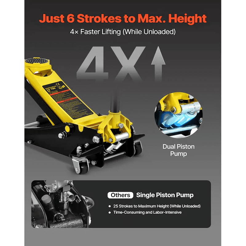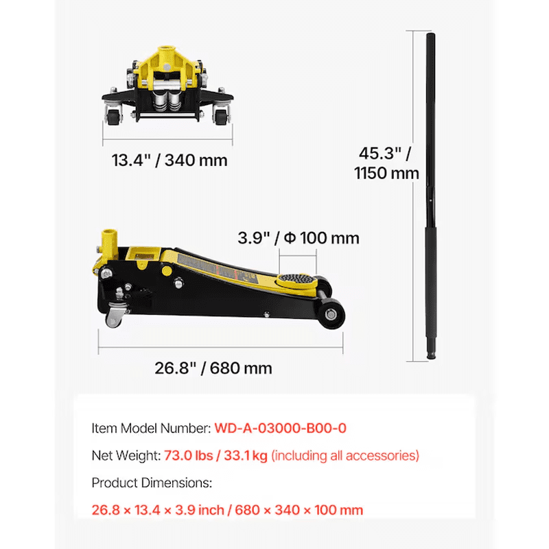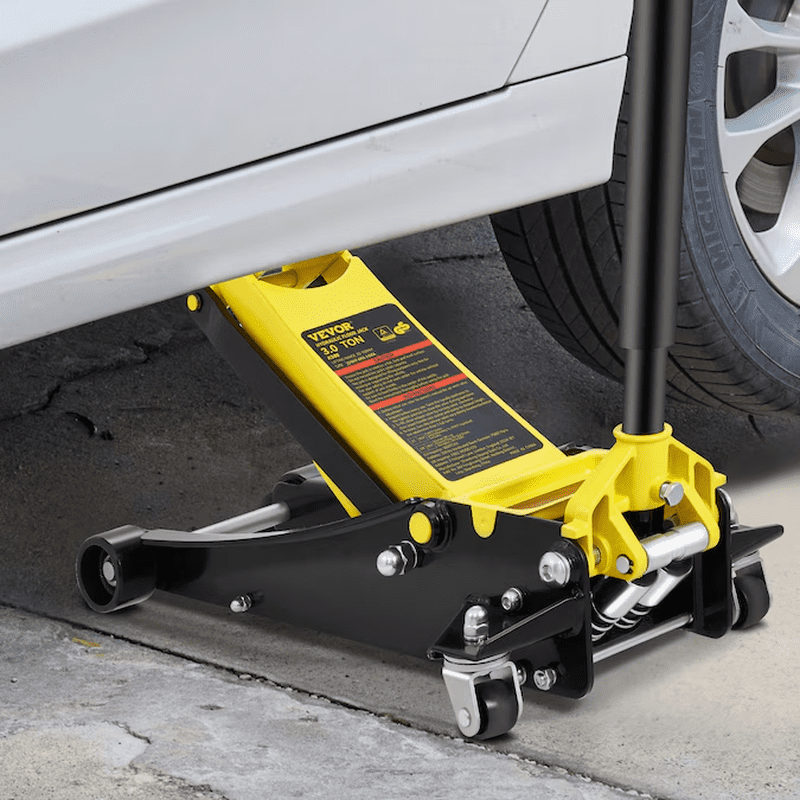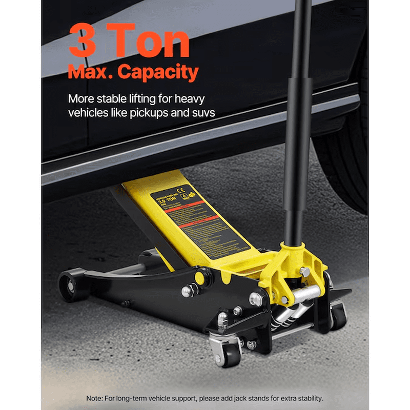 3 Ton Low Profile Floor Jack: VEVOR low profile floor jack easily slides underneath the vehicle and lifts your vehicle off the ground in no time; It makes your vehicle repair work feel like a walk in the park; We boast a 3 ton/6600 lbs lifting capacity and 3″/75 mm-19.5″/495 mm lifting range! Our jack is more than capable of lifting most vehicles; It is perfectly constructed of high-strength steel to tackle any tough challenge; The floor jack can be used for general or heavy-duty industrial use; Dual pump pistons quickly raise the floor jack saddle to load; The rubber saddle pad and foam bumper pad protect your beloved vehicles; Steel casters for easy transportation; Get ready to experience a powerful, secure, and reliable jack!; [Package Content] 1 x Low Profile Floor Jack; 1 x Manual