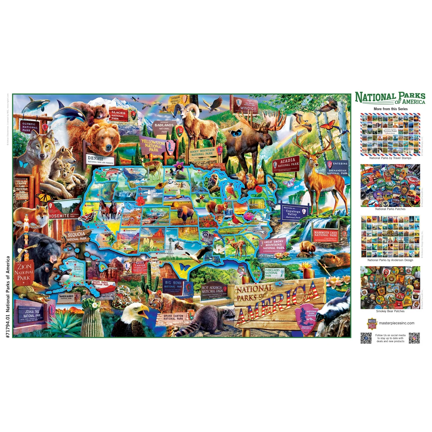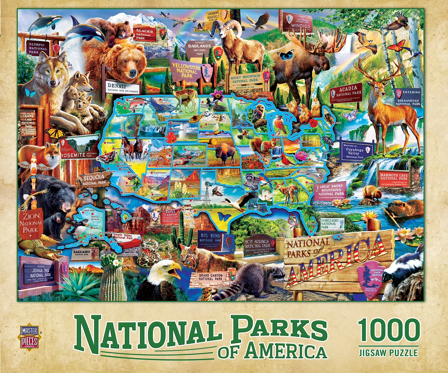 This Masterpieces 1000 piece adult jigsaw Puzzle of the National Parks of America features map of all the National Parks each showing something special in the area. Seek out illustrations of unique animals and places around the states. Each custom-crafted map is incredibly detailed, showing historic places, popular attractions, indigenous wildlife, mountain ranges and much more. These puzzles are made on the highest quality 100% recycled puzzle board and packaged in sophisticated matte-finish display boxes.