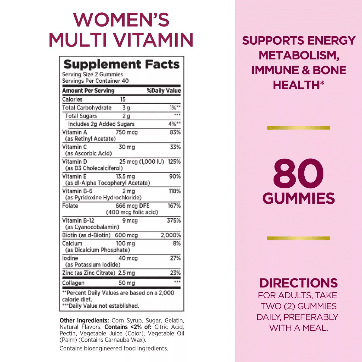 - MULTIVITAMIN FOR WOMEN: Chewable multivitamin gummies for women support wellness with key nutrients to support energy metabolism, immune health & bone health*. This women’s multivitamin contains Vitamin D, Vitamin C, Vitamin A, B Vitamins, Zinc & Biotin