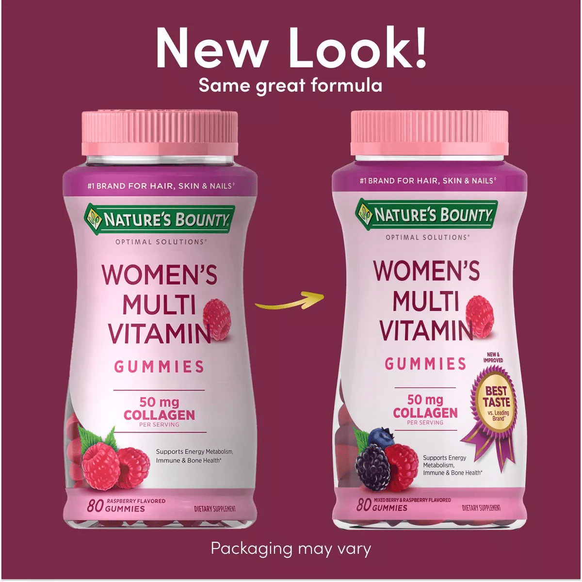Size:80 Count (Pack of 1) Nature’s Bounty Optimal Solutions Women’s Multivitamin Gummies offer a unique formula — created for women, by women — to provide your body with over 10 key nutrients every day in a delicious mixed berry and raspberry flavored gummy.* Nature’s Bounty Optimal Solutions Women’s Multivitamin Gummies provide you with the vital nutrients to support a healthy and beautiful body.* Each daily serving provides your body with antioxidant Vitamins E and C, Calcium for bone health and Vitamin D for immune health.* Other key nutrients, like B Vitamins, provide energy support by helping convert food into energy.*