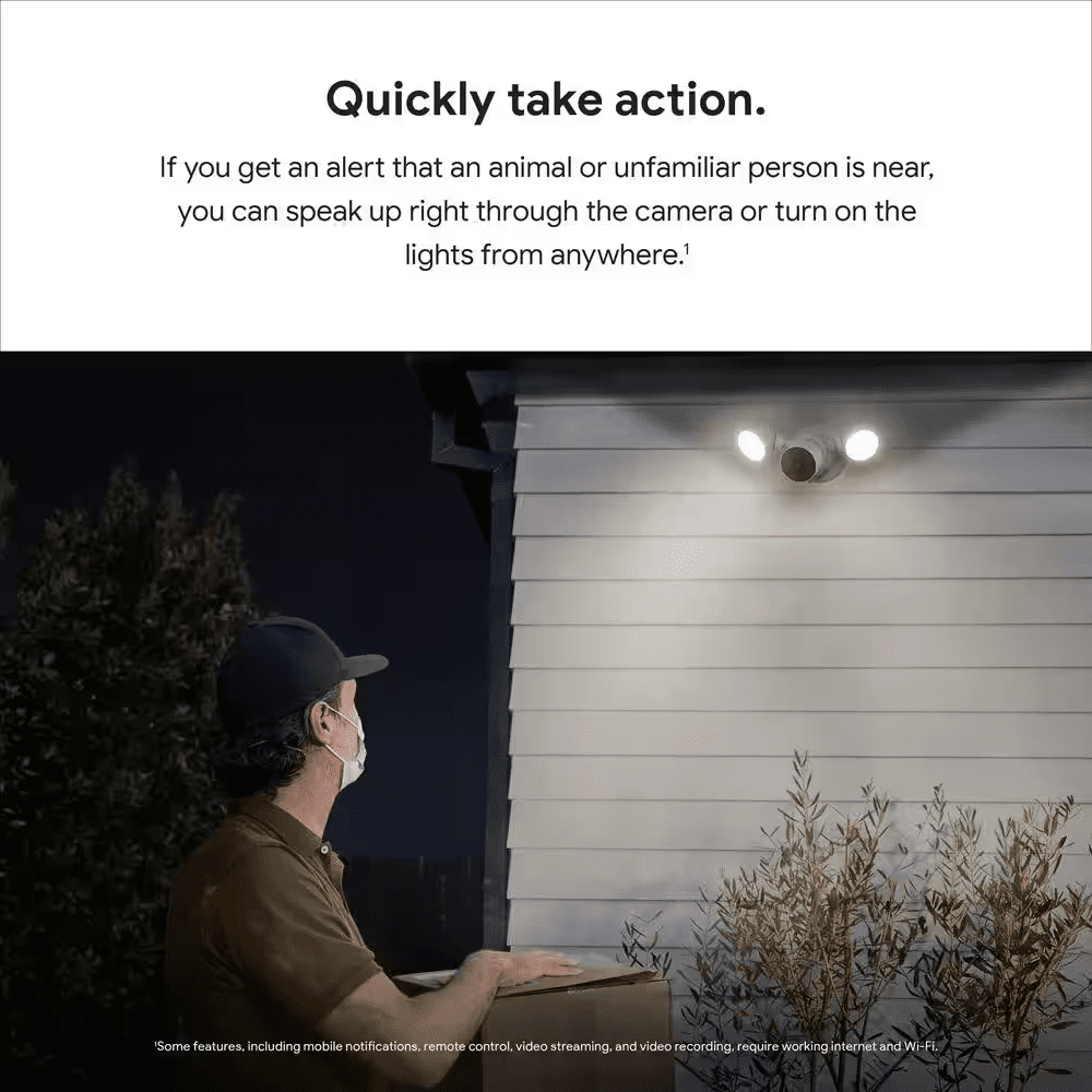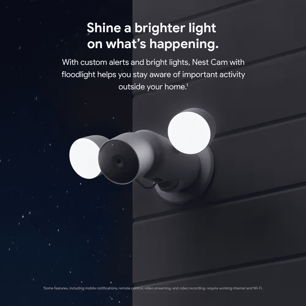 Nest Cam with floodlight shines a brighter light on what’s happening at home. The smart security camera detects important activity and knows the difference between people, vehicles, and animals. It automatically turns on the lights and sends you an alert.1 View live HD video, replay video recordings, talk to visitors, and more – all from the Google Home app. Nest Cam with floodlight requires a free Google Account and is not compatible with the Nest app or the home.nest.com site.