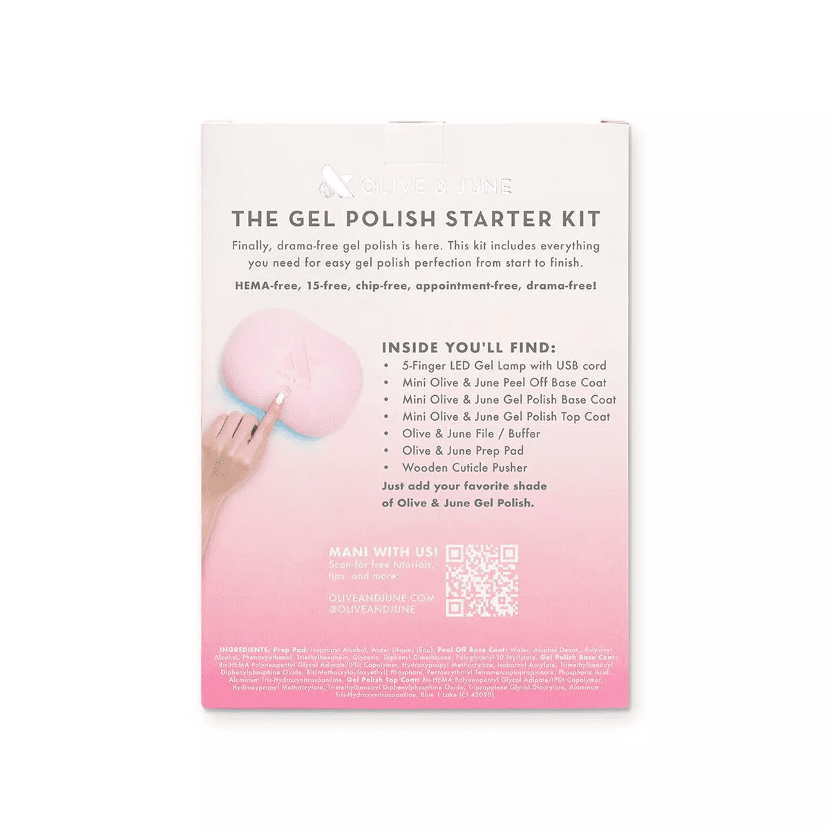 Finally, drama-free gel polish is here. The Gel Starter Kit contains all of the essentials you need for a shiny, plumpy, long-lasting gel mani/pedi that lasts up to 21 days. Inside you’ll find a mini Peel Off Base Coat, Mini Gel Base Coat, Mini Gel Top Coat, wooden cuticle pusher, and alcohol prep pad. Just add your favorite Olive & June gel polish.