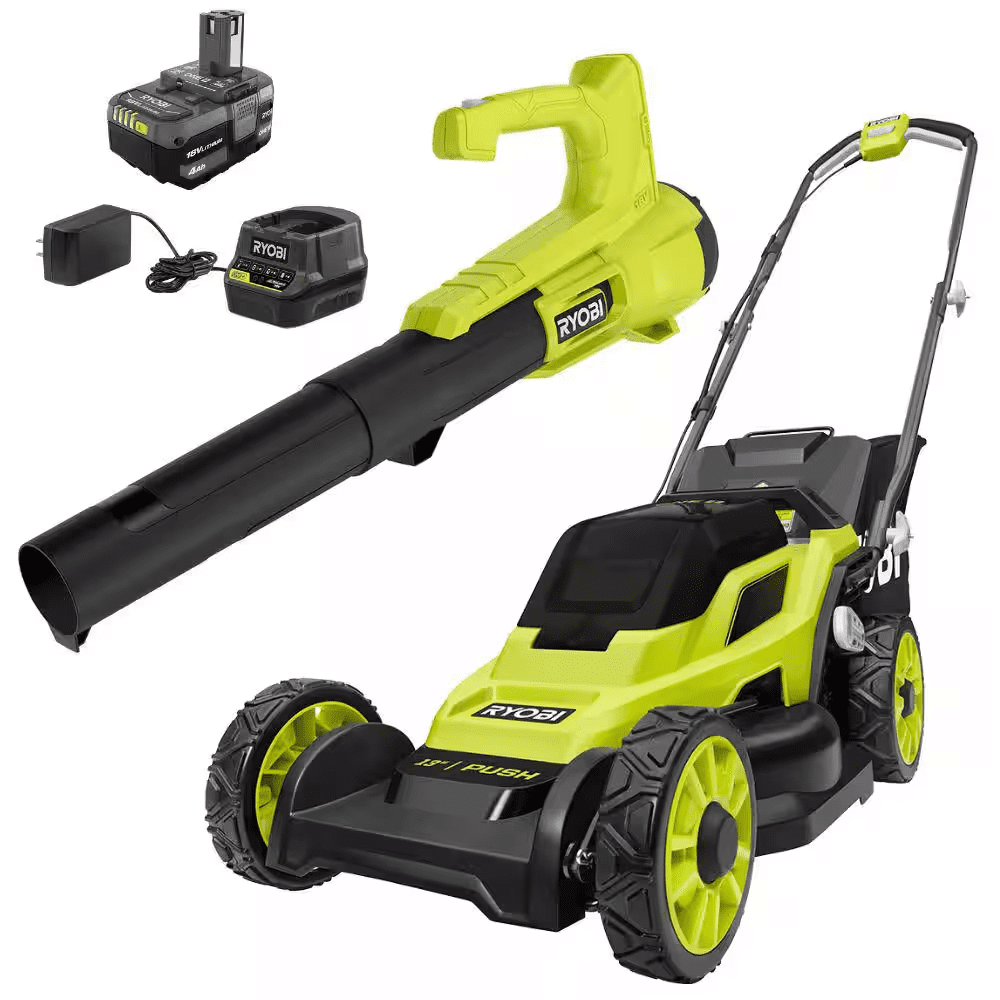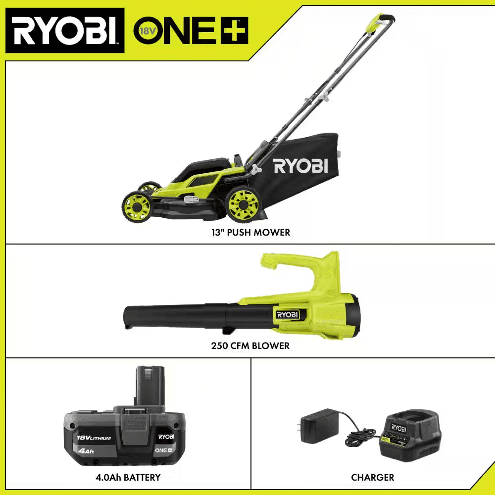 The RYOBI 18V ONE+ 13″ Push Mower delivers the power to tackle small sized yards with ease. It’s ideal for up to 1/4 acre and runs for up to 30 minutes with the included 18V ONE+ 4Ah battery. The single-point height adjustment allows you to quickly select the perfect height for your lawn with 7 different positions (1.5″-4″). With its easy lift bag removal and included mulch plug, switching between bagging and mulching is a breeze. When you are finished mowing, easily fold the handles and store vertically for compact storage. Best of all, it is part of the RYOBI 18V ONE+ system where any 18V ONE+ battery works with any 18V ONE+ product. The RYOBI 18V ONE+ 250 CFM Blower delivers 250 CFM and 90 MPH, making it ideal for light applications and clearing hard surfaces like sidewalks and driveways. Experience exceptional performance with just the flip of a switch, without the hassle of gas or cords. Achieve 10 minutes of runtime using an 18V ONE+ 2Ah battery. The lightweight design reduces fatigue making this blower easy for anyone to handle. Best of all, it’s part of the RYOBI ONE+ system where any 18V ONE+ battery works with any 18V ONE+ product. This blower is backed by a 3-year manufacturer’s warranty and includes the P21011 18V 250 CFM Blower, and Operator’s Manual. This 18V ONE+ 13″ Push Lawn Mower and Blower are backed by the RYOBI 3-Year Manufacturer’s Warranty.