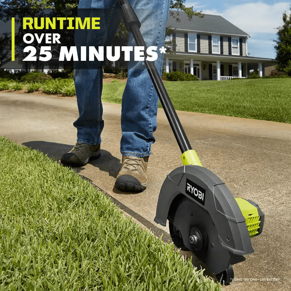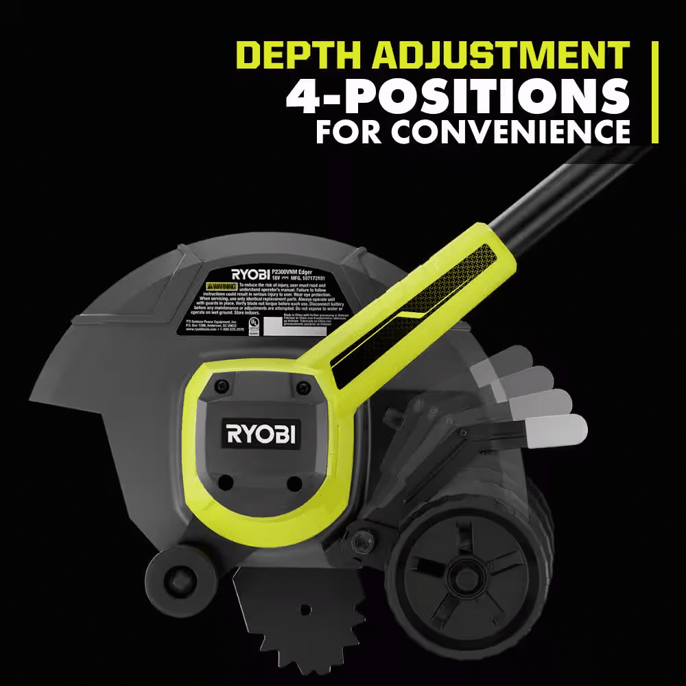 The RYOBI 18V ONE+ Edger utilizes a powerful motor allowing you to achieve clean cuts and precise edge around sidewalks and driveways. Experience gas performance with just the pull of a trigger and get over 25 minutes of runtime using an 18V ONE+ 2Ah battery (battery not included). Easily customize the depth of your cut with the 4-postion single point depth adjustment ranging from 0.25” to 1.5”. The front and rear wheels allow you to have more control and ultimate stability when edging. Comfortably get the job done with the lightweight design and overmold handle. Best of all, it is part of the RYOBI ONE+ system where any 18V ONE+ battery works with any 18V ONE+ product. The 18V ONE+ Edger is backed by the RYOBI 3-Year Manufacturer’s Warranty and includes P2300 18V Edger, 9″ Edger Blade, Front Handle, and Operator’s Manual. Battery and charger sold separately.