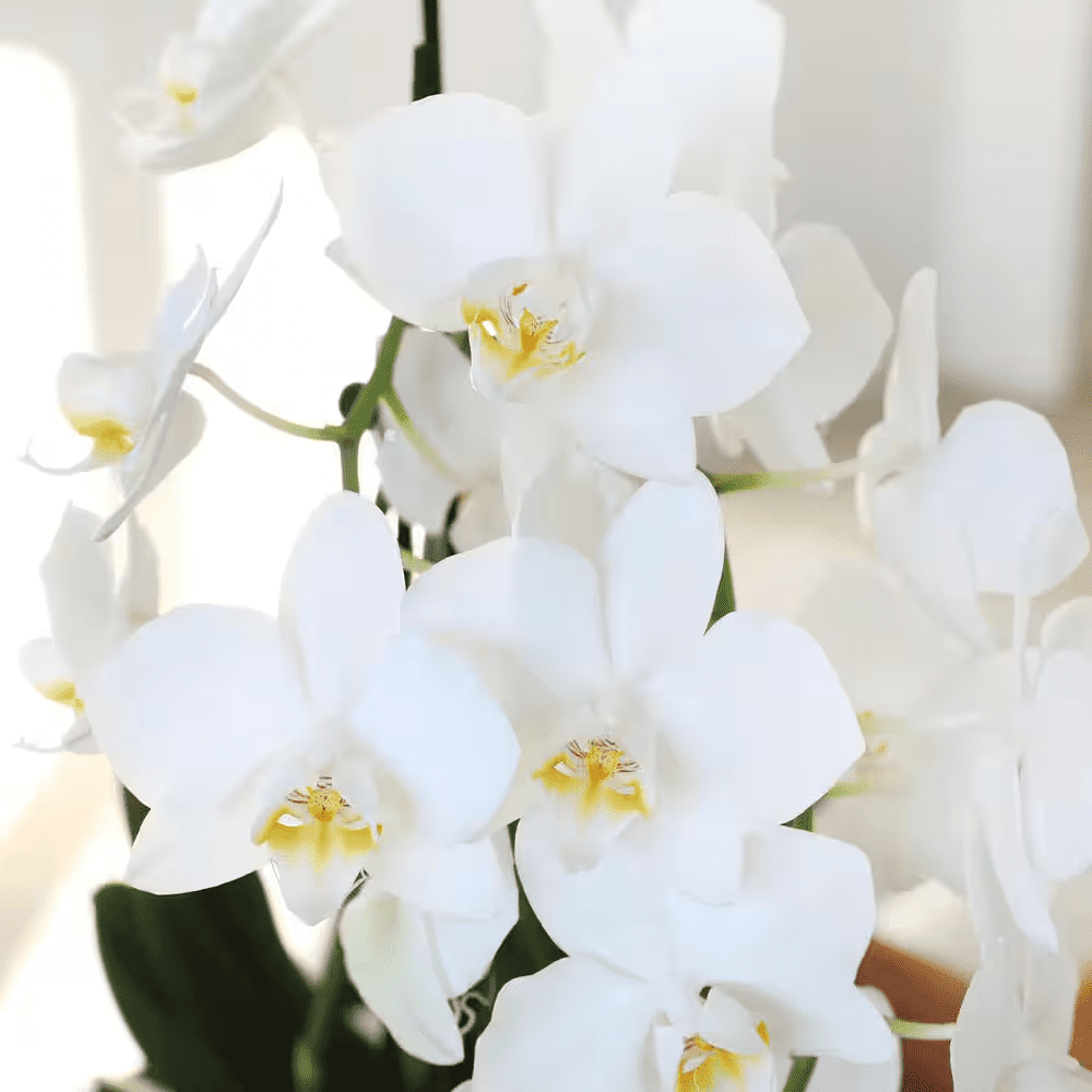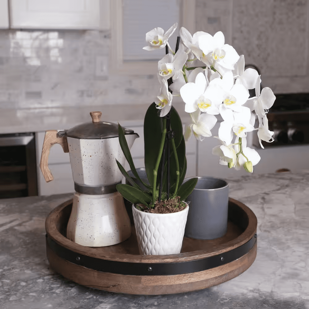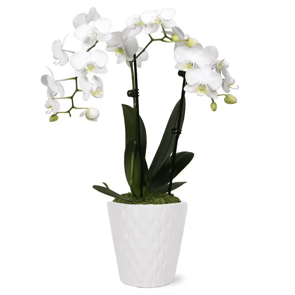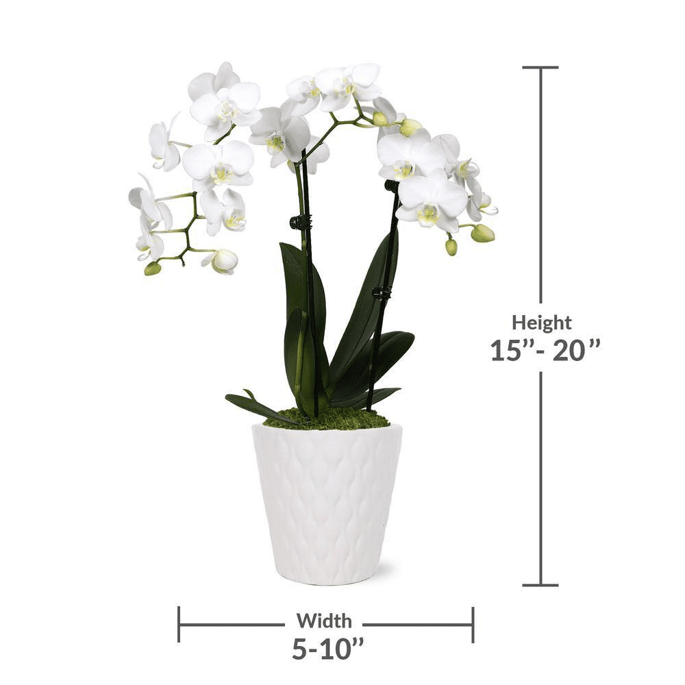 Add beauty to your home with the Just Add Ice 15 in. to 20 in. Pure White Petite Orchid Live Plant in Moss Topped 3 in. White Ceramic Pot. A long-lasting, real orchid plant is a sophisticated and elegant choice for plant decorations. These white with yellow throat orchid flowers make a beautiful addition to any space. Keep it in a room with bright, indirect sun. Orchids are an easy indoor plant. Water your live orchid plants with 1 ice cube weekly. Keep in a room with bright, indirect light. Our advanced packaging technology ensures your live indoor plants arrive beautiful and safely. They ship right from the greenhouse to your home, and go through a transition process to help them adapt to fluorescent lighting, ensuring they can thrive in any room of your home. Care Instructions: Water once a week with two ice cubes or 3 Tablespoons of water. Keep in bright, indirect light. Temperatures in the room should remain between 65°F to 85°F, never below 55°F. Avoid placing near drafts.