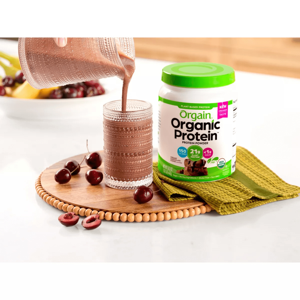 Our protein blend consists of organic peas, brown rice, mung bean, and chia seeds, to provide a complete protein with all nine essential amino acids. Not only does our plant-based protein powder serve up the tastiest, creamiest protein, but it’s also made with clean ingredients and higher standards in mind! Enjoy a protein powder that’s certified USDA organic, non-GMO, and made without soy, dairy, gluten, or artificial preservatives, sweeteners or flavors. On top of all of that, it boasts 7g* prebiotic + fiber, <1g of sugar*, and has 150 calories.* Plus, when it comes to flavor and versatility, this powder delivers. Mix our plant-based protein powders with your favorite smoothies, almond or oat milk, and even baking mixes to add a good, clean boost. At Orgain we celebrate taste, and we take it seriously because we recognize that part of living a vibrant life is loving what you eat. Go ahead, fuel up with the powder that's a treat for both your taste buds and your body so you can have energy to keep on going!