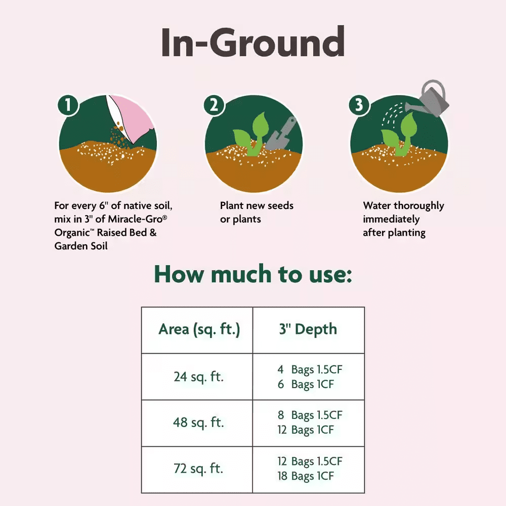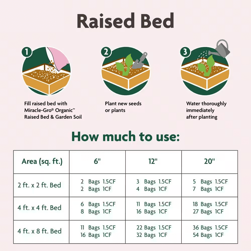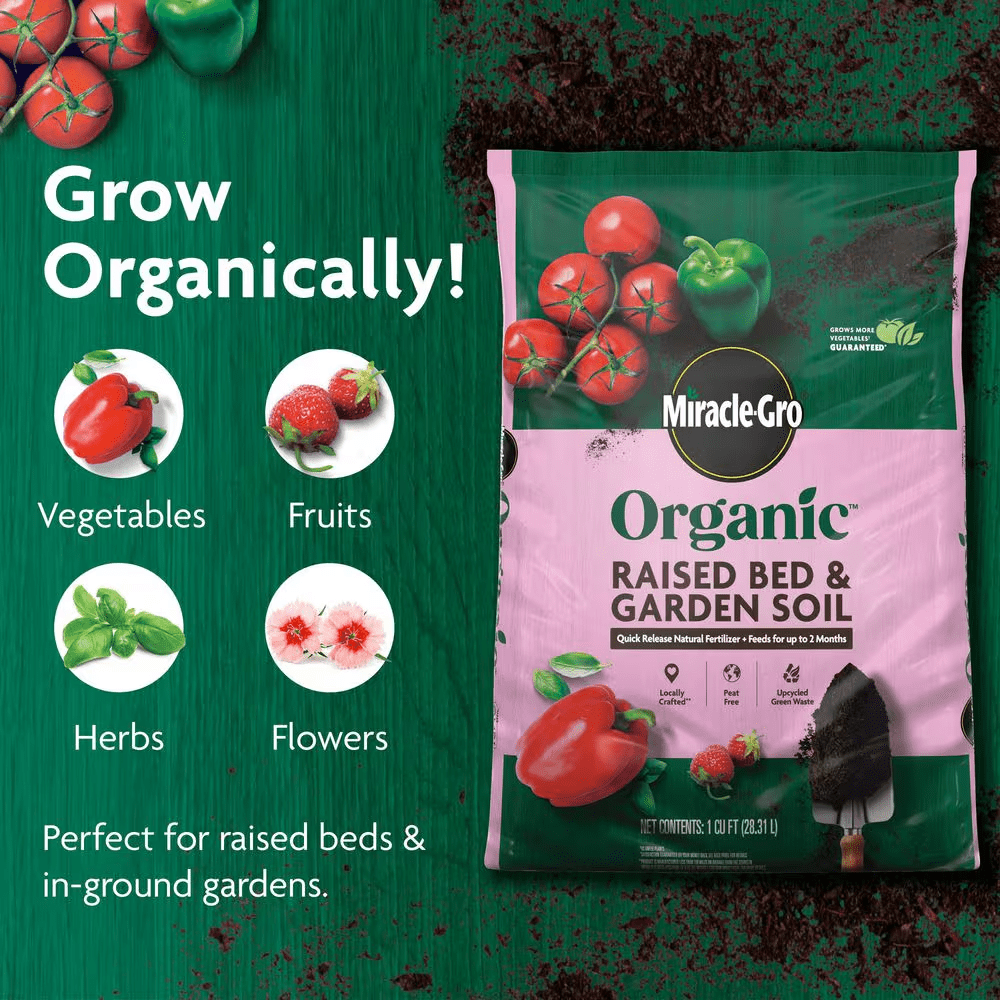 Successful Organic Gardening Made Attainable. Miracle-Gro Organic Raised Bed and Garden Soil is a soil blend with quick release natural fertilizer that grows more vegetables guaranteed*. Our organic soil blend is peat free, formulated with upcycled green waste, and feeds plants for up to 2 months. This product is also OMRI Listed for organic use. In addition, it’s locally crafted**. This organic gardening soil is perfect for raised bed and in-ground gardening with vegetables, fruits, herbs and flowers. When planting in a raised bed, fill with Miracle-Gro Organic Raised Bed and Garden Soil then plant new seeds or plants. When planting in ground, thoroughly mix in 3 inches of Miracle-Gro Organic Raised Bed and Garden Soil for every 6 inches of native soil then plant new seeds or plants. Always water thoroughly immediately after planting. Two 1.5 cu. ft. bags of Miracle-Gro Organic Raised Bed and garden soil fill one 2 ft. x 2 ft. x 6 in. raised bed, or 4 bags cover 24 sq. ft. *vs. unfed plants; satisfaction guaranteed or your money back **manufactured less than 150 miles on average from the stores in which it is sold, excluding AK and HI