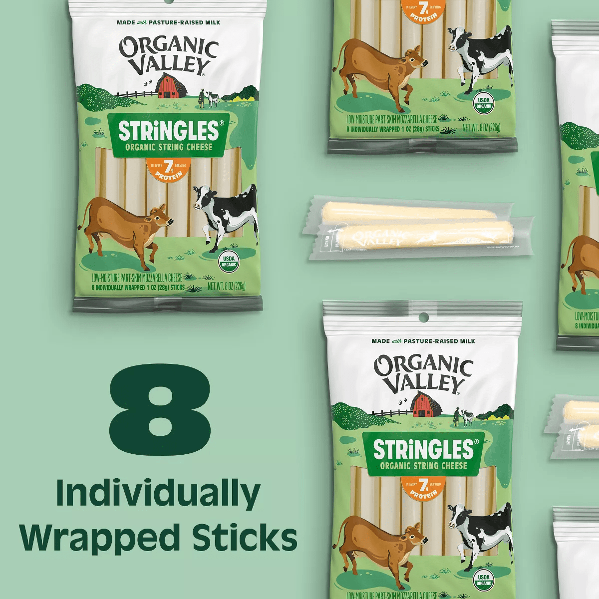 - 8 oz package of Organic Valley® Stringles Organic Mozzarella Cheese Sticks (8 sticks)