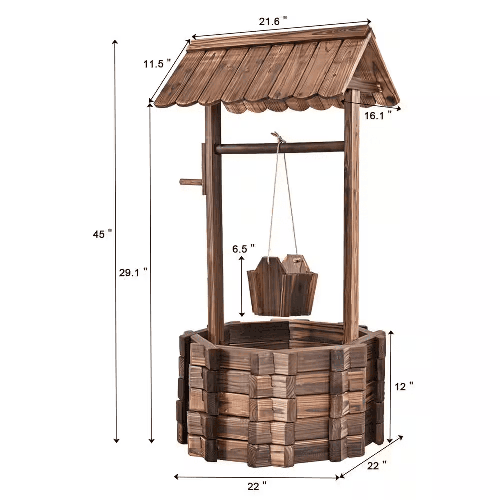 Look at this stylish and beautiful wooden wishing well bucket planter. It will be a excellent decoration to your lawn, backyard, garden and other outdoor living space. This big well allows you to plant your favorite plants and flowers in it and the bucket is also designed for planting. The wishing well is constructed of solid fir wood that will keep this planter lasting through the season for many years and it has a burn wood finish for a rustic appearance. Do not hesitate to buy a 1 to add beauty to your garden.
