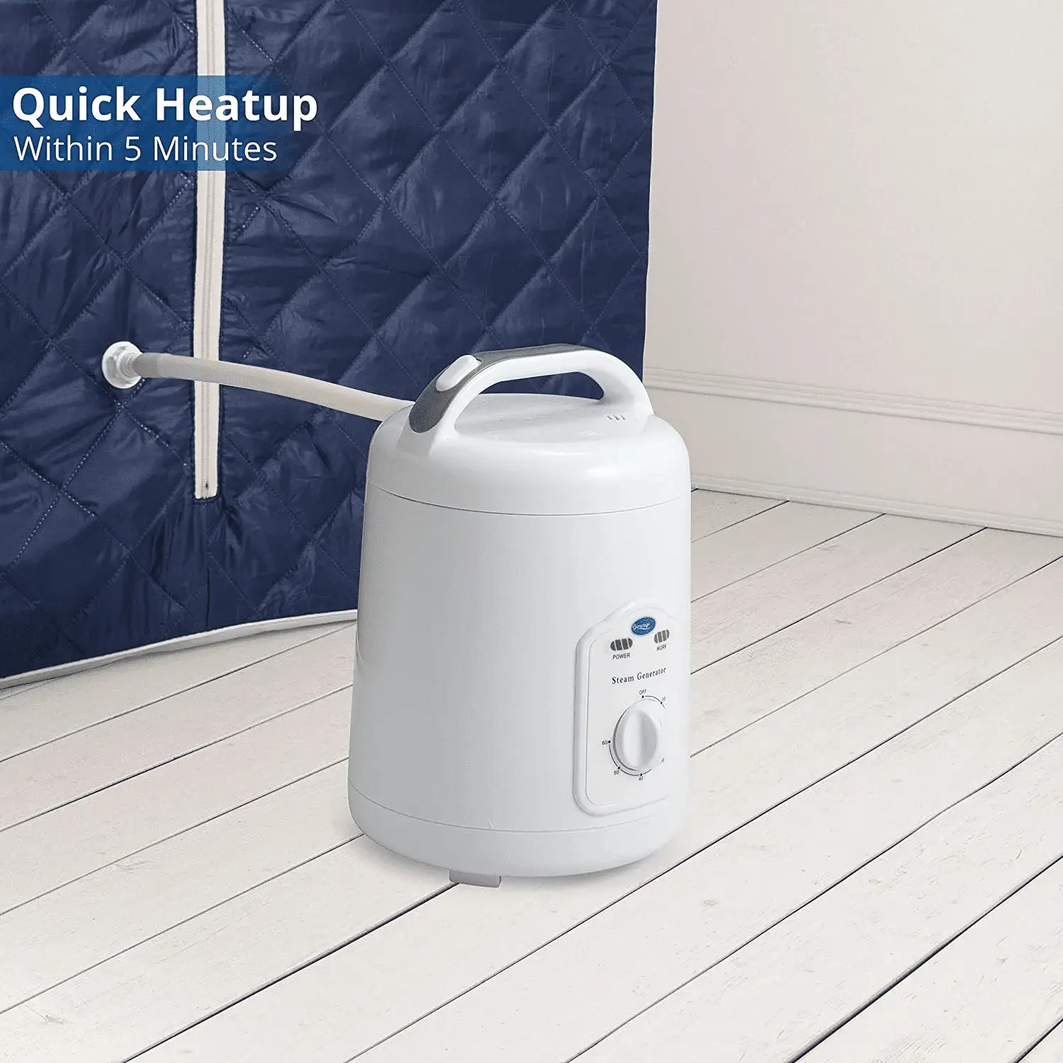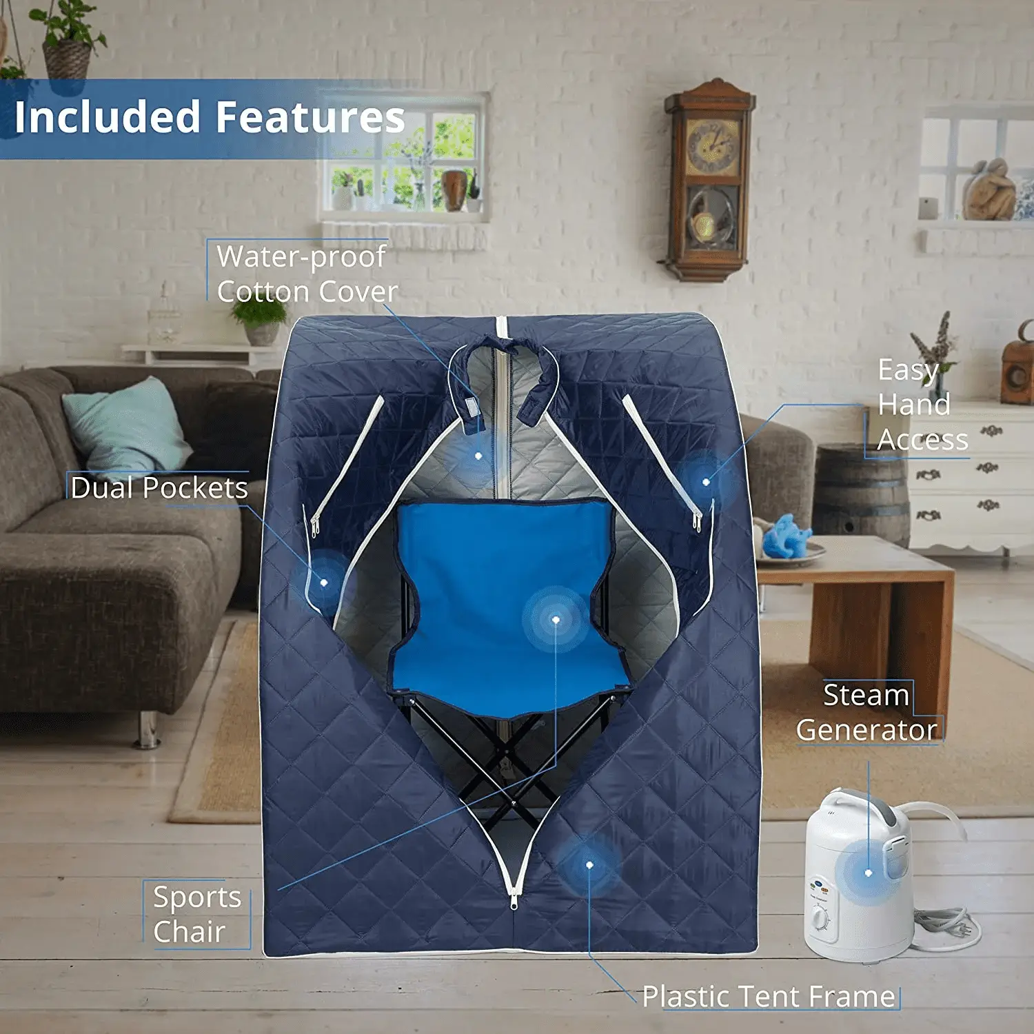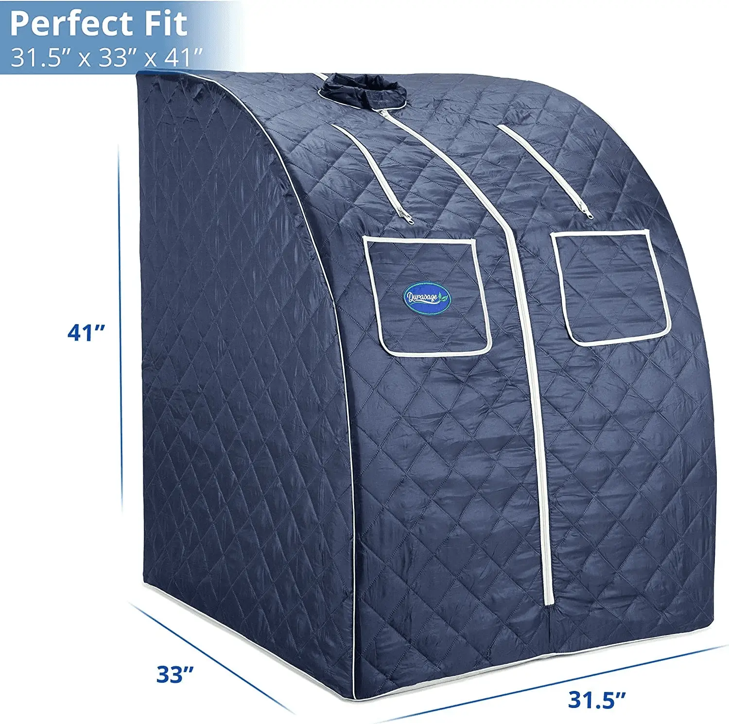 This Durasage sauna includes everything you need to start your sauna experience. Its perfect for those wanting to use a sauna at home without making special arrangements. Bigger than our standard steam sauna size which will now accommodate larger individuals (33″ x 31.5″ x 41″). Including dual pockets on the front which can be utilized to hold your phone, tablet, tv remote or even a small book. Two zippered openings for your hands allows you to quickly access the front pockets while inside the sauna. Designed to deliver a high quality experience while using tough materials, which will allow you to use it for years to come. With its satisfying design, your head and hands can extend out for reading, watching TV, or listening to music. The detachable frame makes it easy to assemble and disassemble for easy storage. Takes approximately 5 minutes to complete the assembly. The only additional items we recommend will be a towel, and distilled water for best results (Filtered water is acceptable but no tap water due to the hard minerals). Using a cotton cover with waterproof layer to prevent steam penetration. With a separate steam generator and sauna design, our product offers more safety for the user. This product utilizes steam that is about 212F?, creating an internal temperature ranging 110-114?F. Before using, one can add essential oils or fresh flower for an even more enjoyable experience. Easy setup inside-frame design (Assemble the frame according to the diagram attached, then place the cover of the frame), It only takes minutes to set up. When finished, any small amount of condensing water that is produced can easily be wiped up with a towel from the inside of the sauna.
