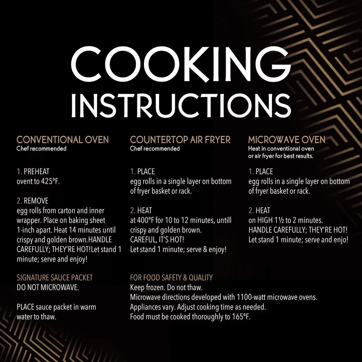 P.F. Chang’s Home Menu Chicken Egg Rolls frozen appetizers bring delicious restaurant-inspired food into your home. The frozen egg rolls are filled with chicken, shredded cabbage and carrots. Included with the egg rolls is a signature sweet and sour sauce for dipping, so you can create the perfect bite. P.F. Chang’s Home Menu Chicken Egg Rolls are made with no artificial colors, flavors or preservatives, ensuring delicious and satisfying frozen appetizers and side dishes every time. Pair the frozen appetizers with P.F. Chang’s Home Menu Skillet Meals and rice for a perfect Asian food dining experience at home. The mini egg rolls are great for enjoying on their own as an appetizer or frozen snack, but they also make excellent frozen sides for your dinner whenever you want something special. Easily prepare the egg roll frozen snacks in the oven or microwave. Keep the box of frozen egg rolls in the freezer and do not thaw the frozen food until ready to prepare.