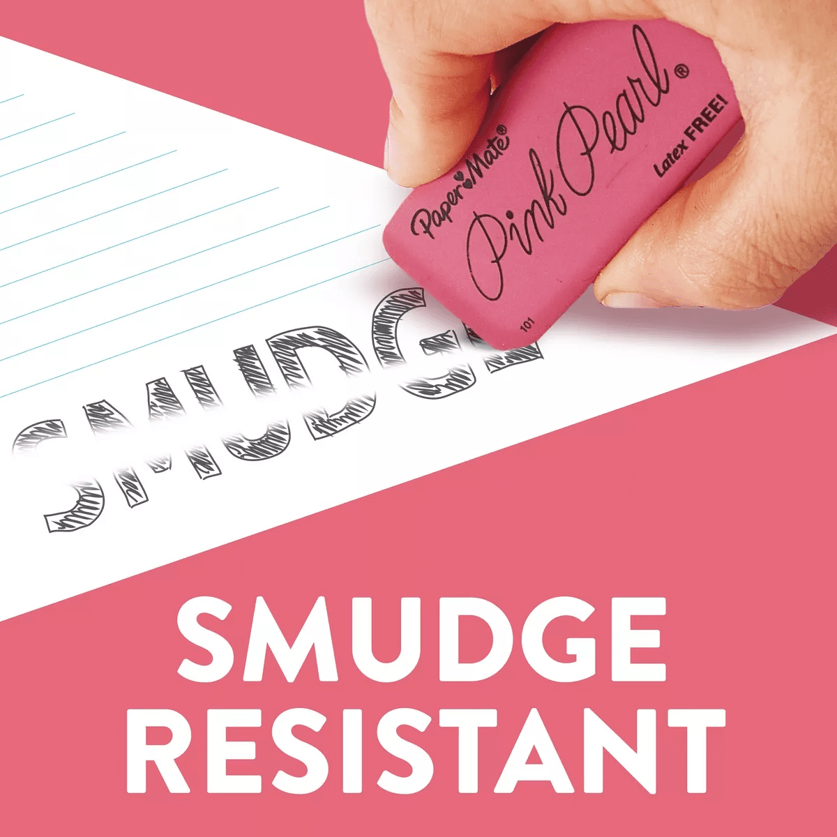 This classic premium eraser easily removes pencil marks. Soft, pliable rubber is easy to maneuver and resists paper tears. For everyone from students to serious artists. Eraser is self-cleaning and smudge resistant to keep your paper clean. Sharp corners and flat face help you erase both details and large areas. Paper Mate Pink Pearl Erasers are the perfect partner for your writing.
