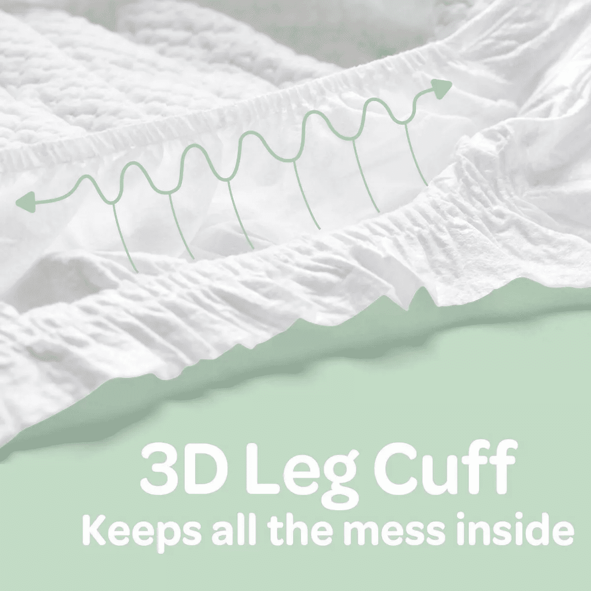 Totally chlorine-free diapers. Super absorbent, ultra-soft, and lightweight fabrics instantly wick away moisture, preventing irritating rashes. Stay fresh and comfortable day and night with naturally breathable materials. Our high waistband and soft stretch design ensure a secure, leak-free fit.