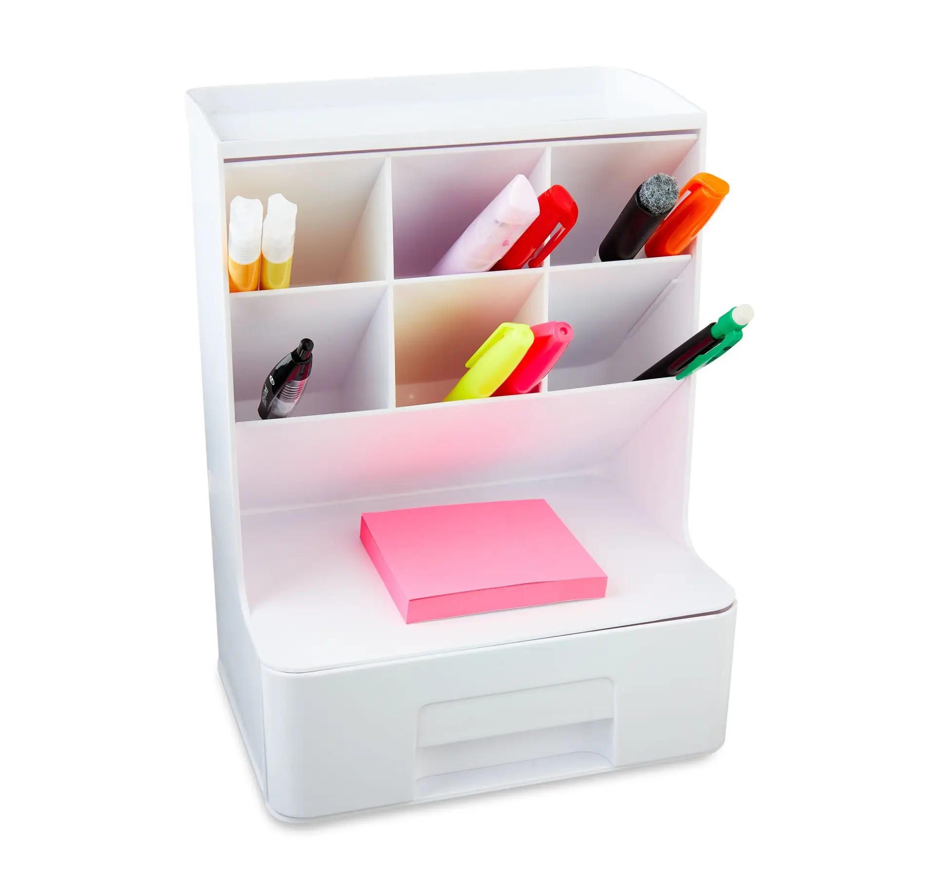 Protect and organize your staff with the White Tall Organizer Plastic desktop organizer. This space-saving storage system will bring organizational order to any space. It’s Perfect for storing office and school supplies, and other craft. The durable drawer makes your accessories quick and easy to find. White color makes it fashion and looks nice. Good to use at home, office and school. Pick up with Pen+Gear White Tall Organizer Plastic.