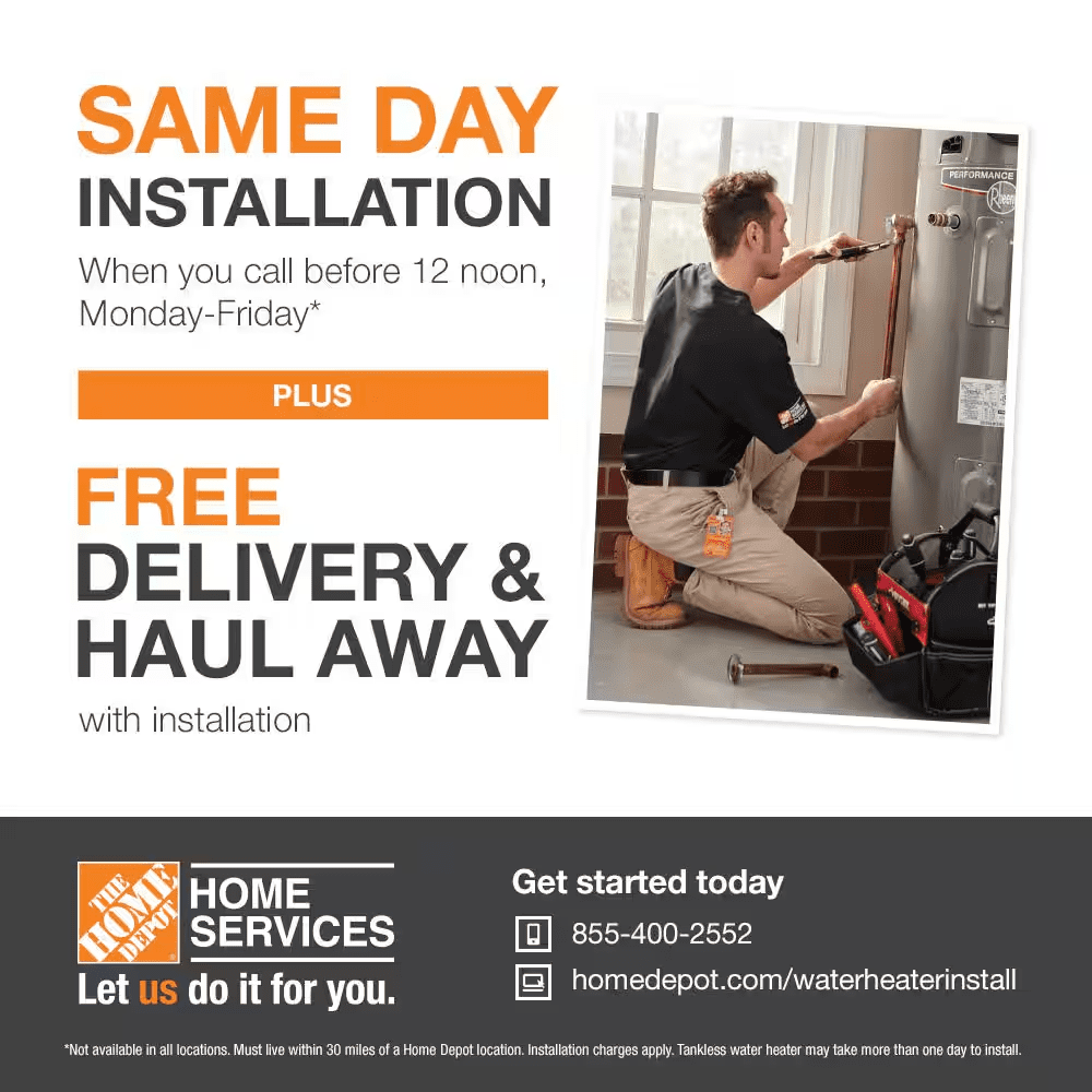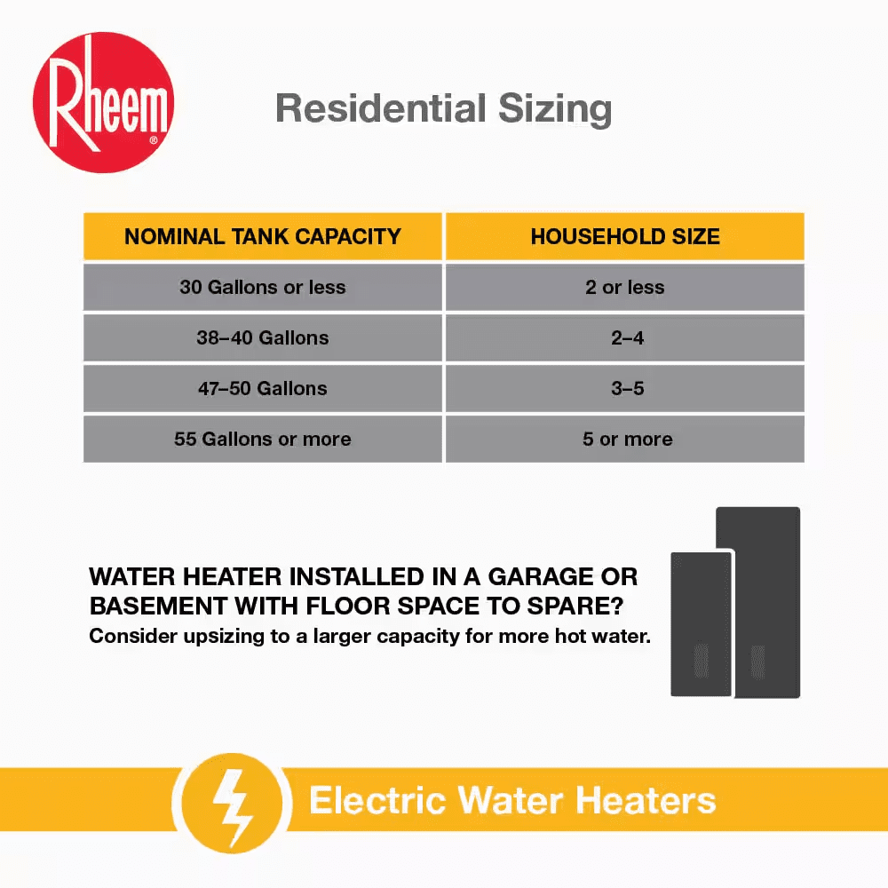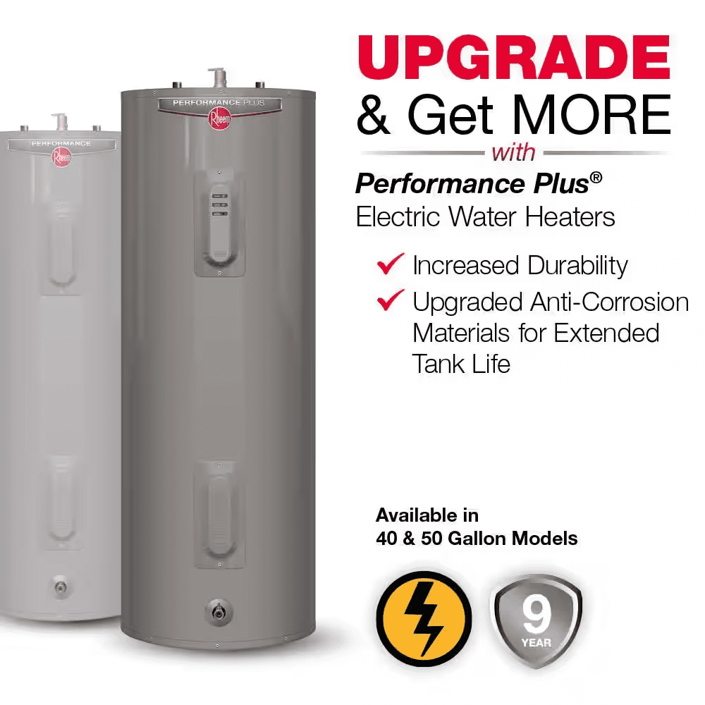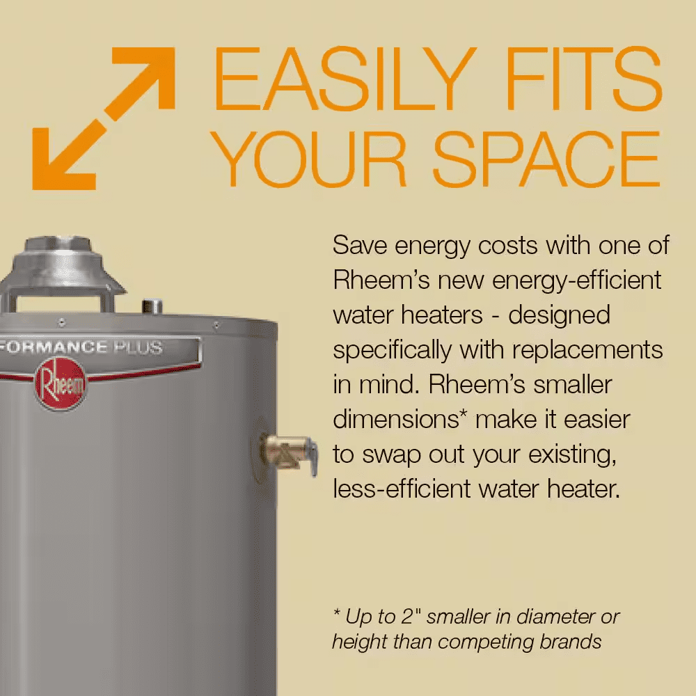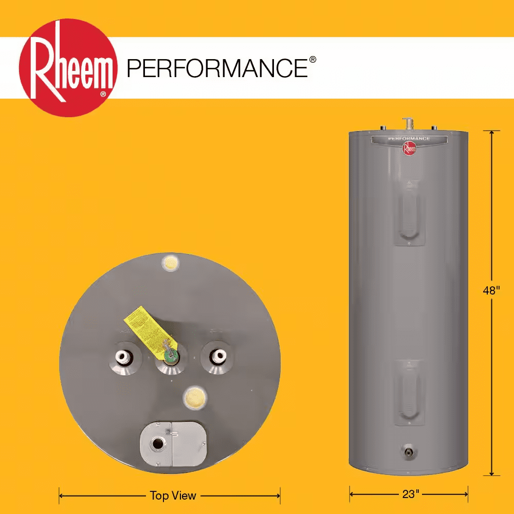 The Rheem Performance 50 Gal. Electric Water Heater takes up less space than competing models, making it the perfect for replacement of an existing water heater. Provides ample amount of hot water for households with 3-people. to 5-people. Plus, it includes a 1-year in-home labor warranty in addition to a 6-year tank and parts warranty. Enjoy peace-of-mind with a reliable hot water solution from Rheem.